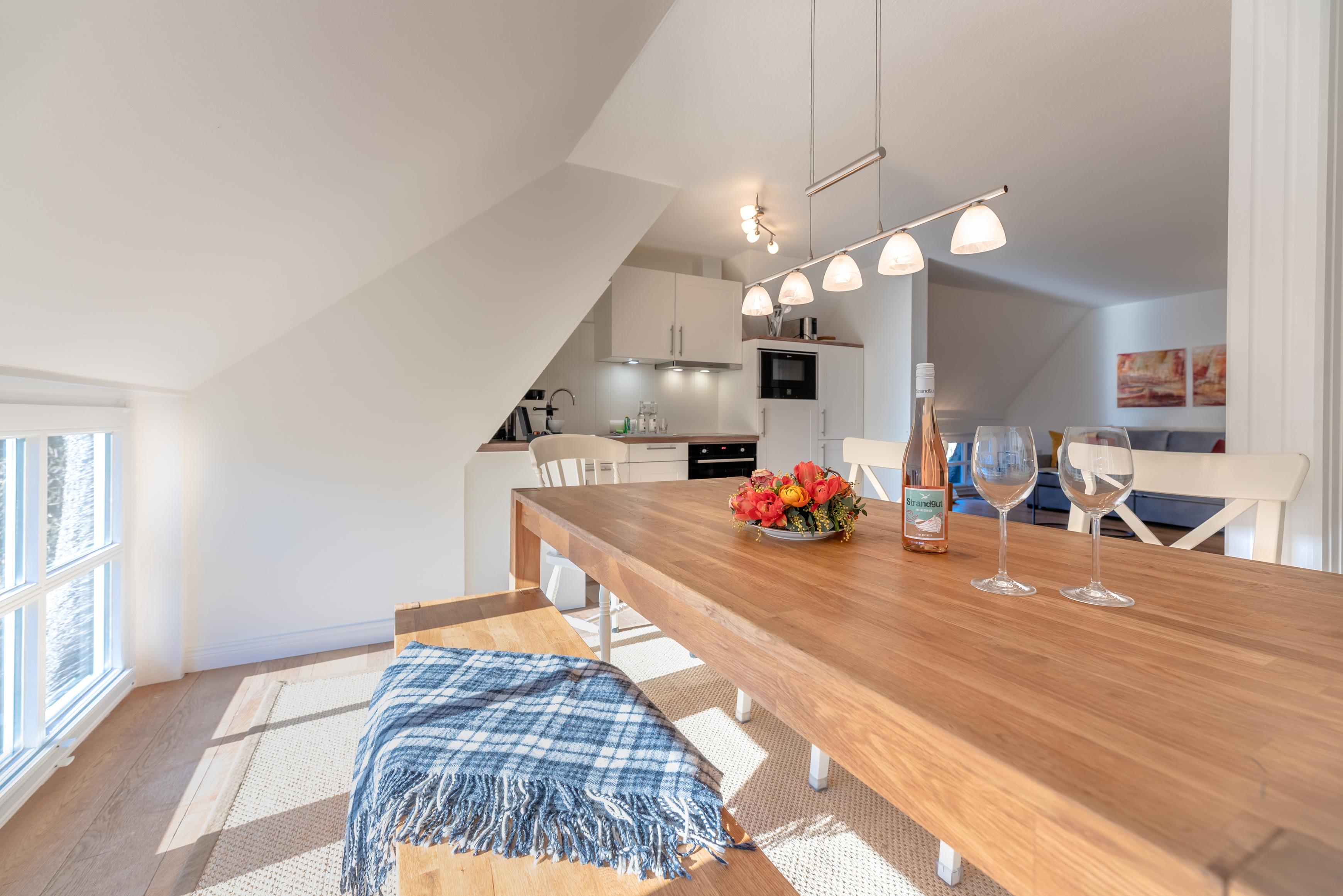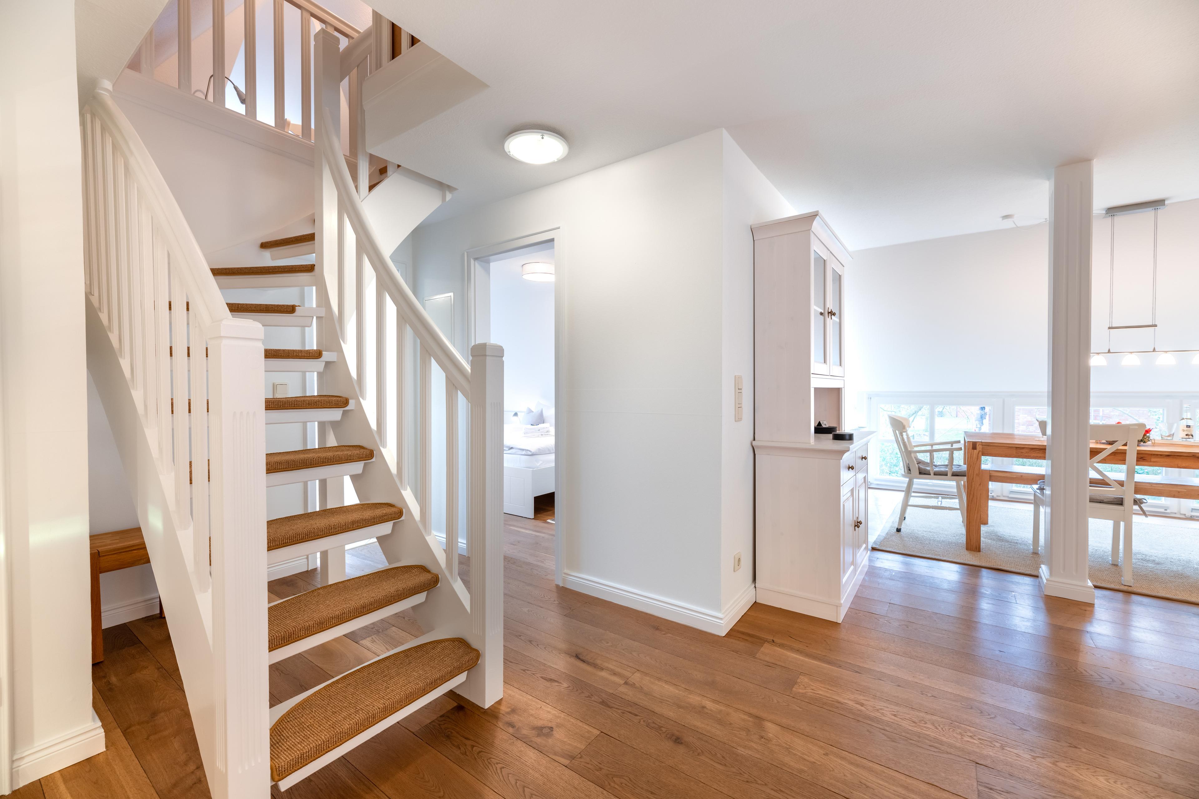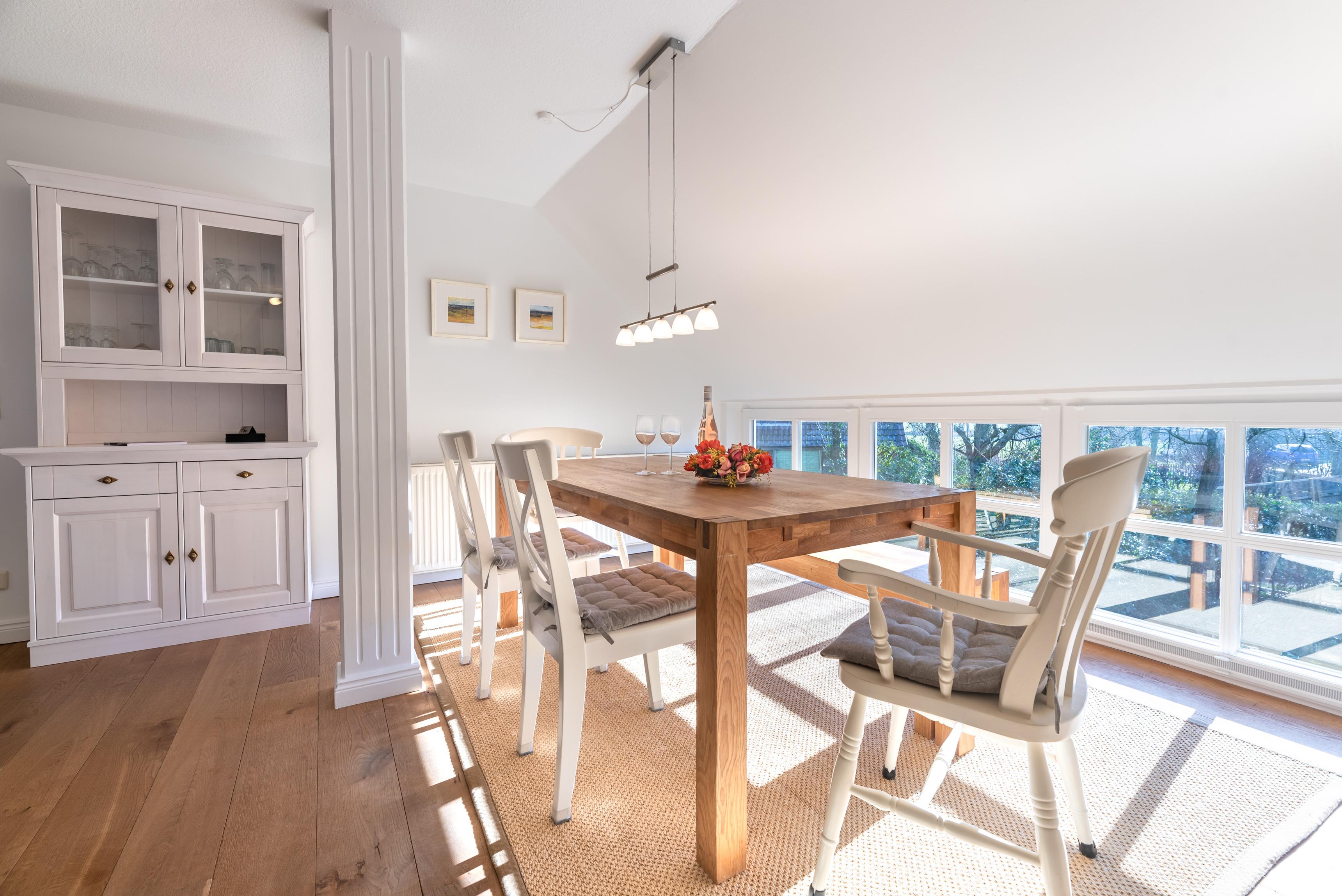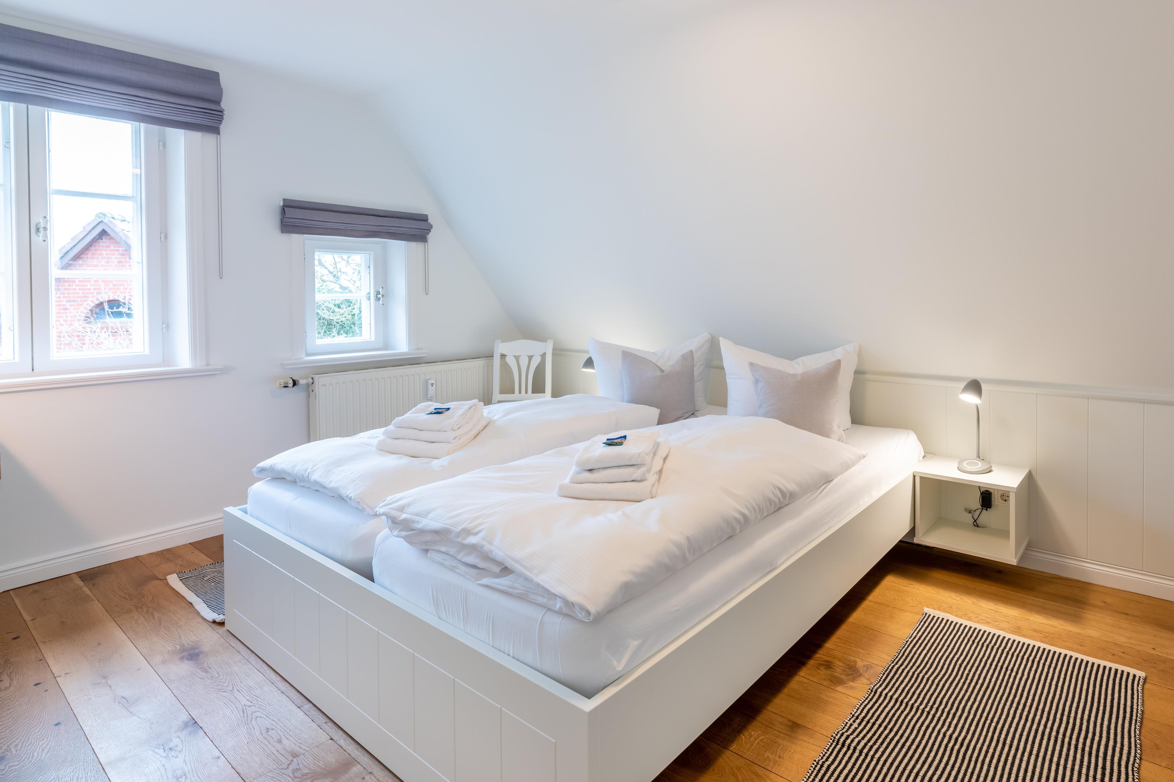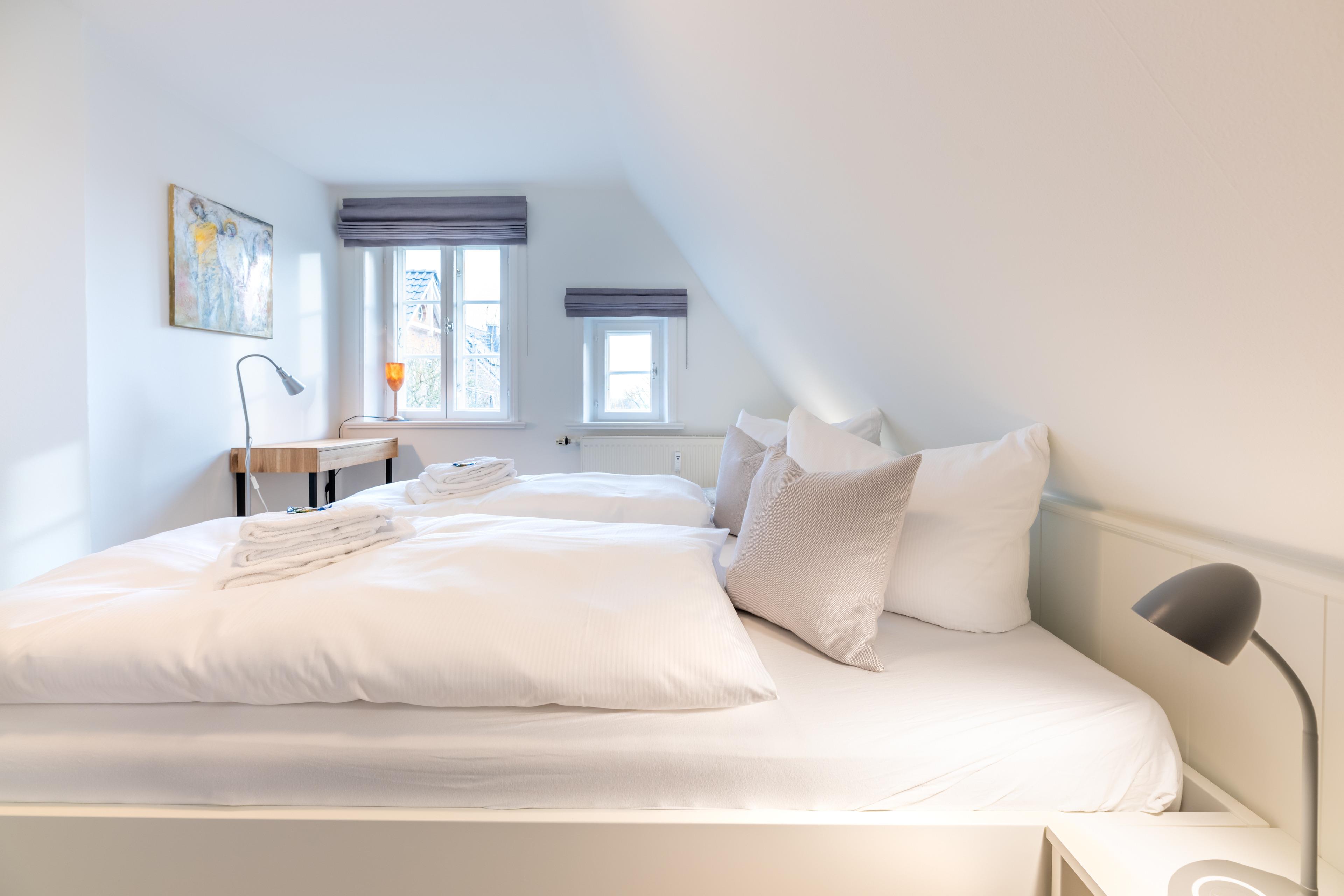 Über eine Treppe gelangt man in den, als offene Galerie gestalteten, wohnlich ausgebauten Spitzboden. Ein Rückzugsort zum Arbeiten am Schreibtisch mit weitem Blick über die Marsch Richtung Nieblum oder schlicht zum Ausruhen.