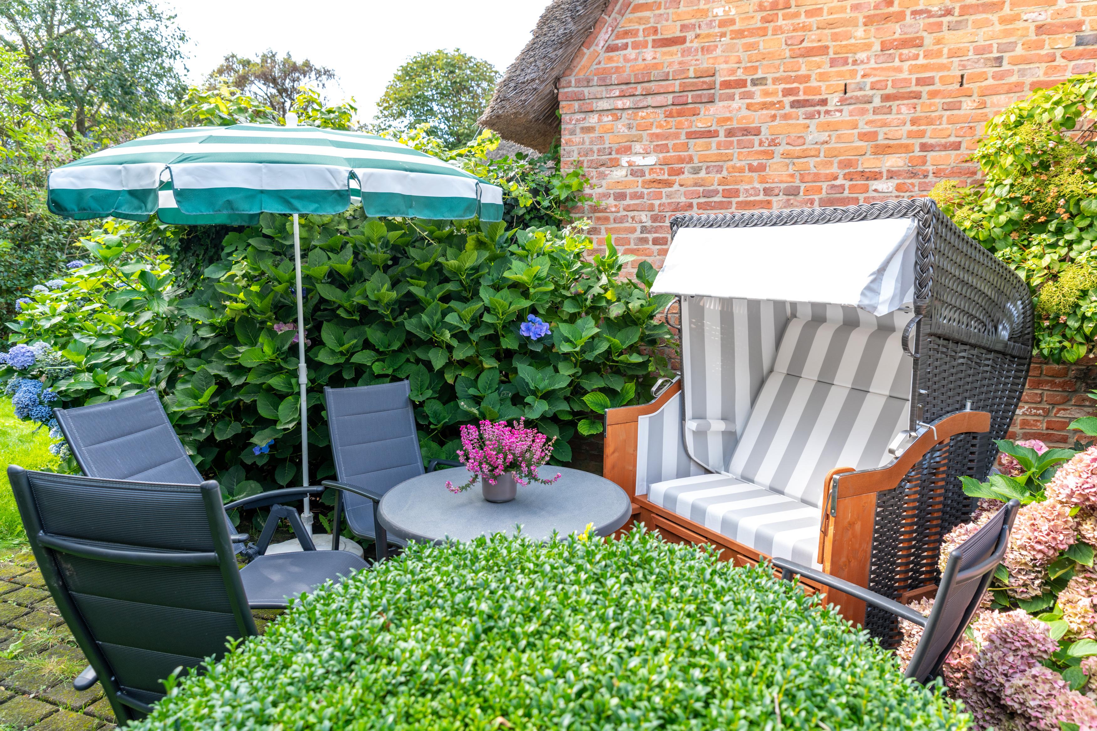 Zur Wohnung gehört ein kleiner Garten und eine eigene Südterrasse mit Gartenmöbeln und Strandkorb.