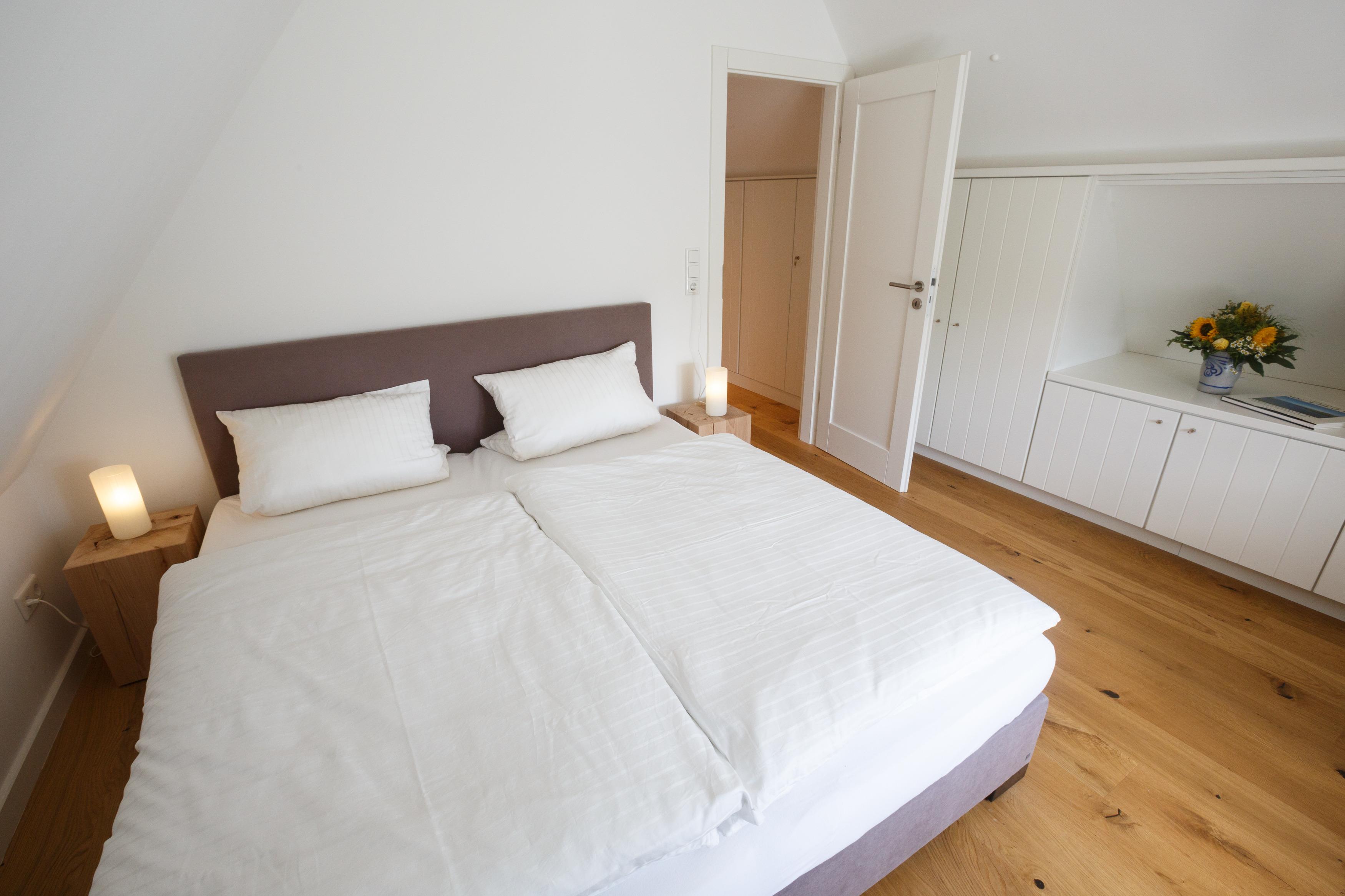 Es handelt sich um eine ca. 95 qm große Ferienwohnung über zwei Etagen mit zwei Schlafzimmern und einer Schlafkajüte. Ein Schlafzimmer mit Doppelbett findet man im Erdgeschoss. Entlang dem Flur mit Garderobe und Gäste-WC gelangt man in die komfortabel ausgestattete, offene Küche mit großem Esstisch und das anschließende, helle und moderne Wohnzimmer.Über eine breite Holztreppe erreicht man das Obergeschoss. Dort befindet sich ein großes Doppelbett-Schlafzimmer, ein großzügiges Duschbad und eine abtrennbare Schlafkajüte von 1,40 Meter Breite, die ideal für Kinder ist.
