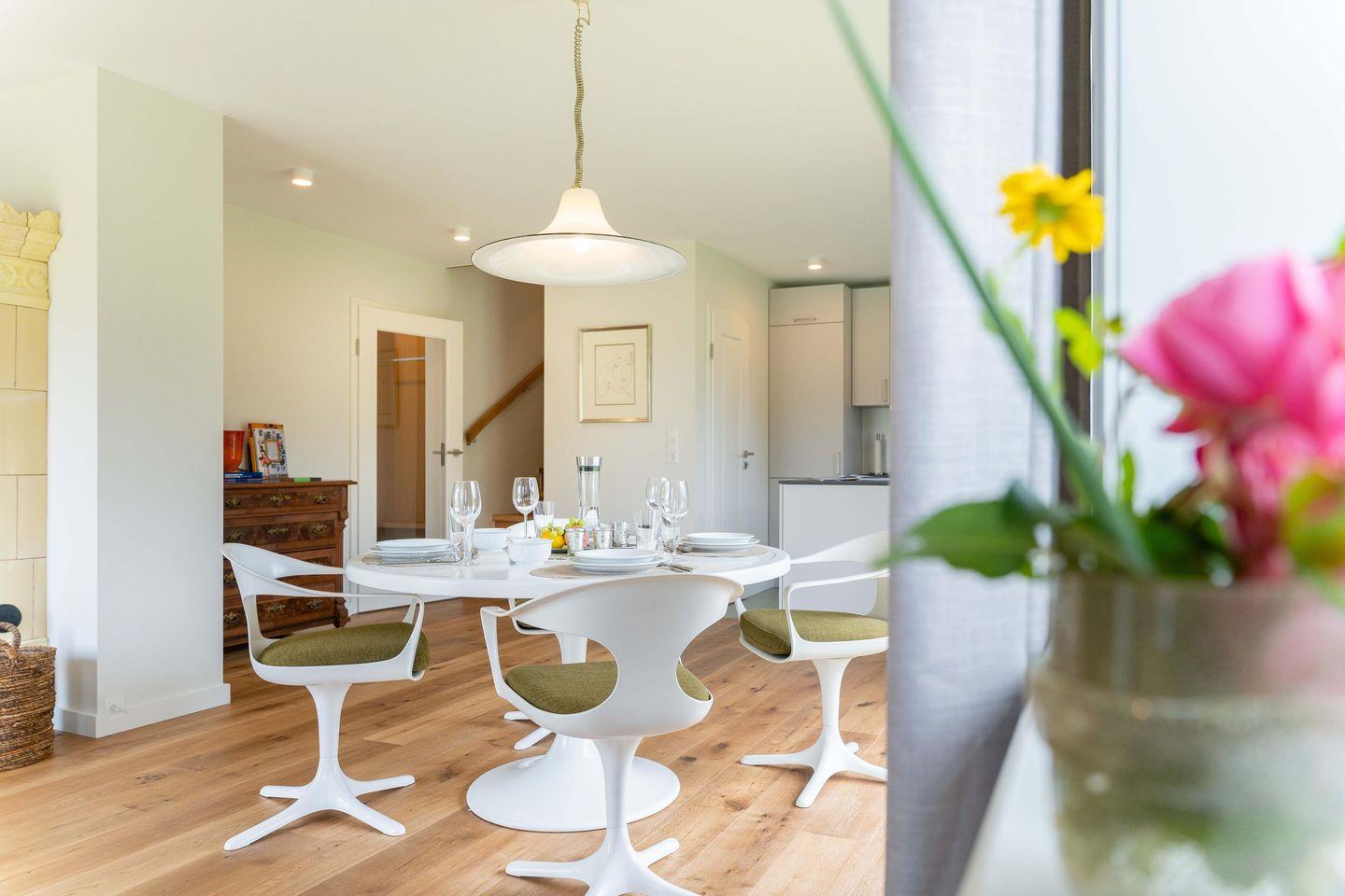 Im Erdgeschoss befindet sich neben WC und Hauswirtschaftsraum ein großzügiger Wohn-Essraum mit offener Küche, die neben einem Raclettegerät auch Backformen und alle Standardutensilien enthält. Ein runder Vintagetisch lädt zum gemütlichem Verweilen ein und die herrliche Wärme des Kachelofens lässt auch bei weniger freundlichem Wetter gute Stimmung aufkommen. Für Bücher und Spiele ist gesorgt. Ein großer LED-Bildschirm lädt zu Filmabenden ein.