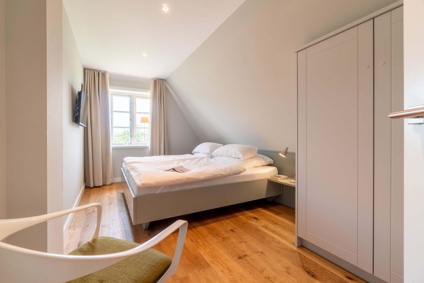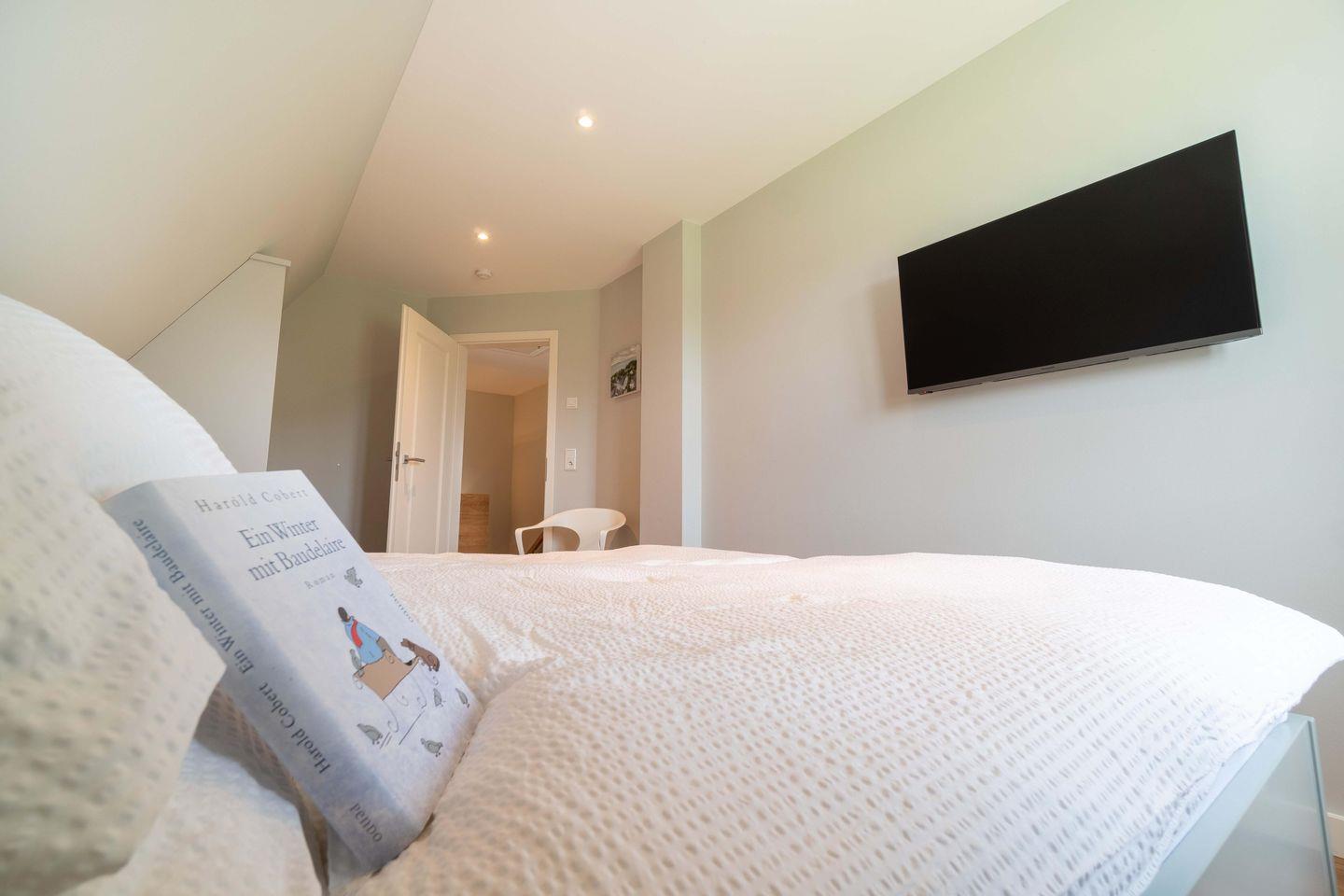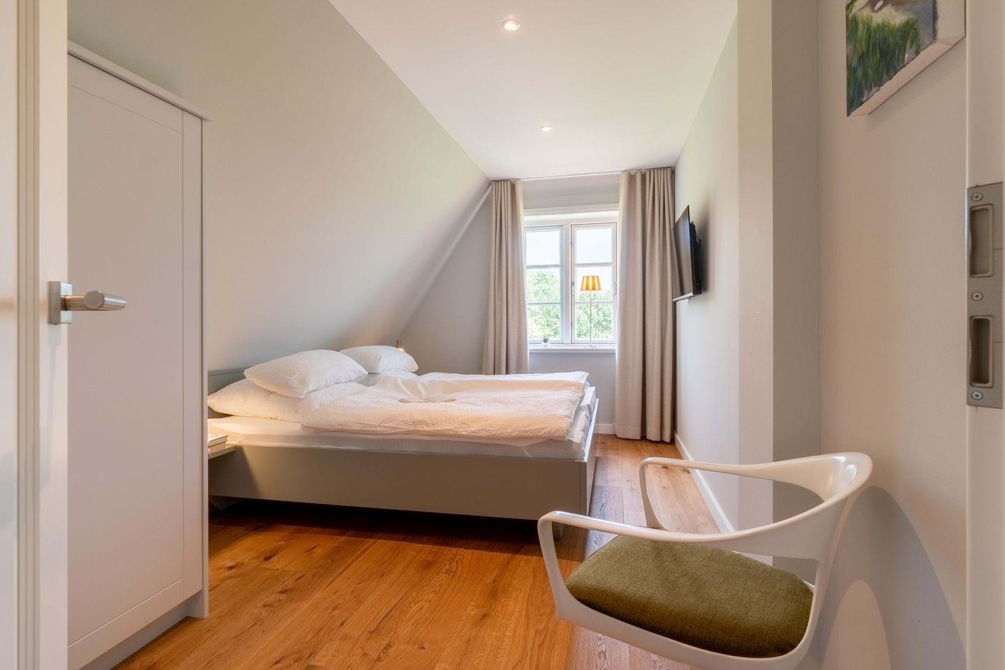 Das obere Stockwerk beherbergt die beiden Doppelschlafzimmer mit neuesten LED-Flachbildschirmen und romantischem Blick auf die Koppel. Vier Personen finden dort bequem Platz. Für unsere kleinen Gäste stehen Bettchen und Hochstuhl zur Verfügung. Angegliedert sind jeweils die Bäder, in einem Bad ist die finnische Sauna integriert.