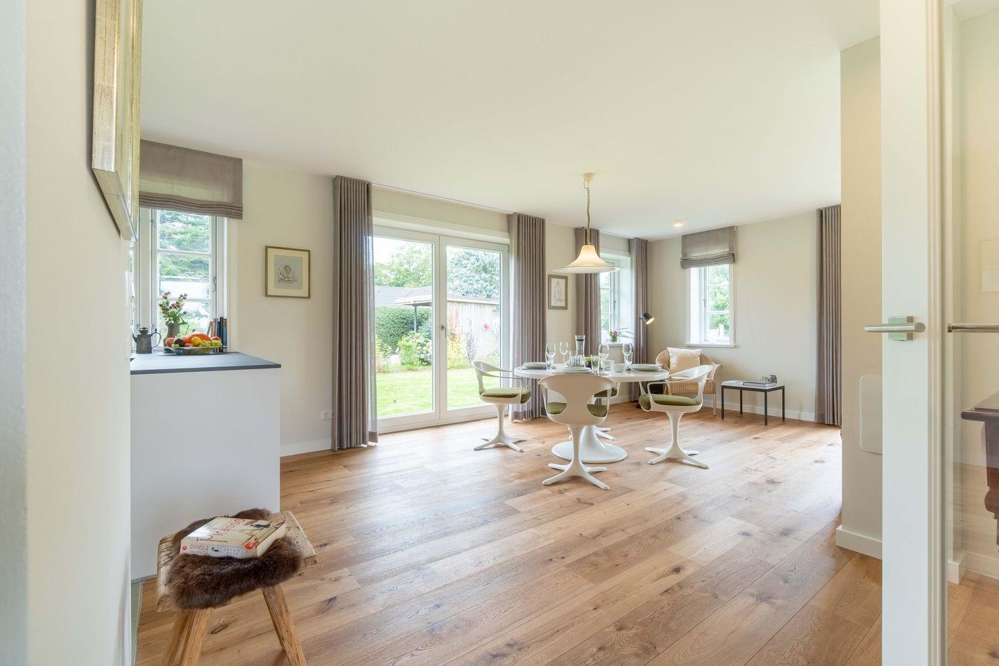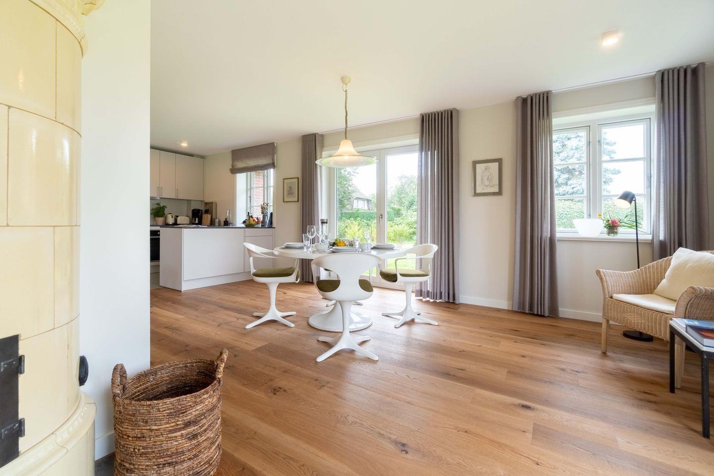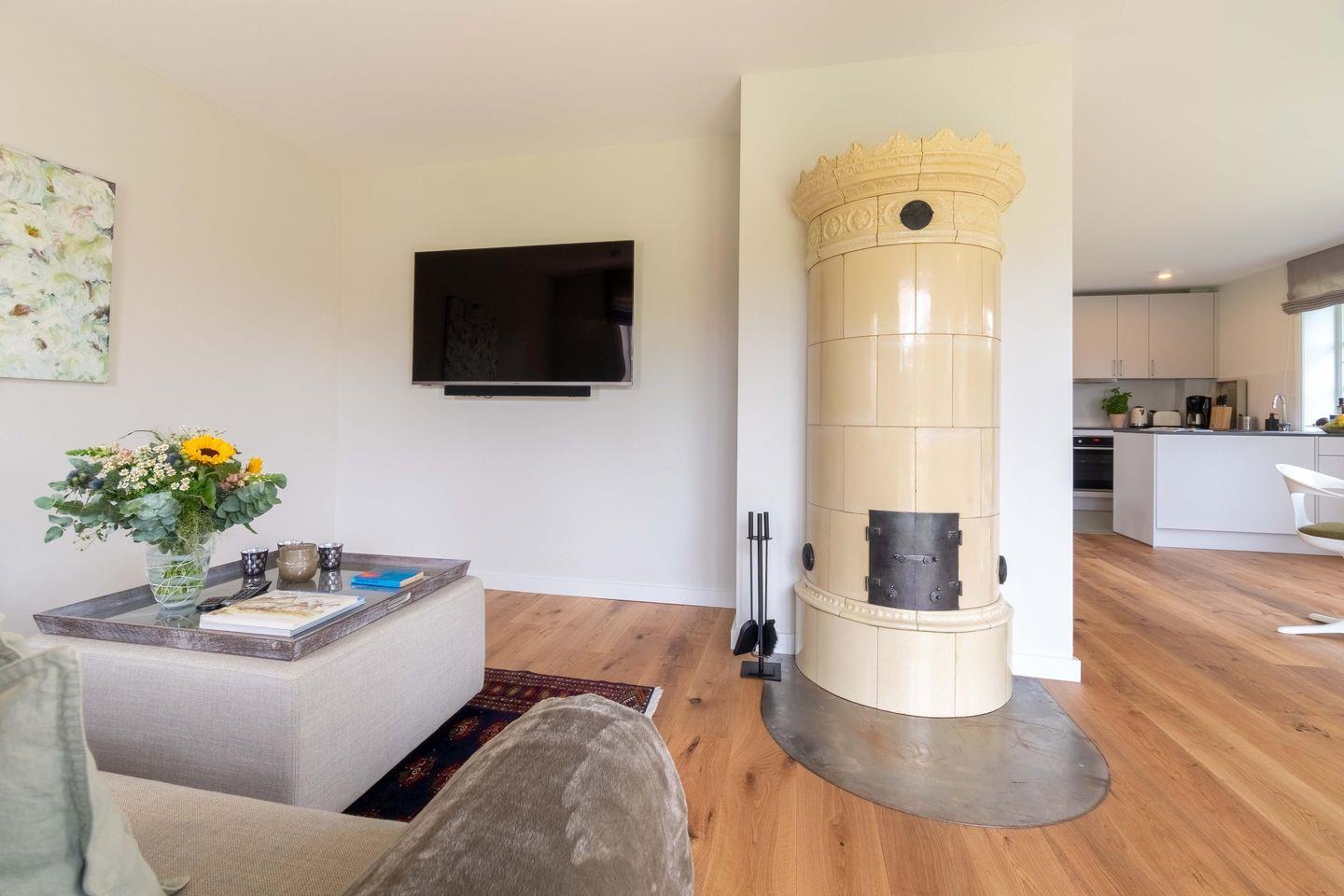 Zu den Highlights des Hauses an der Koppel zählen ein antiker schwedischer heller Kachelofen, die Sauna und der ruhige Garten mit Blick in die Natur und auf die angrenzende Pferdewiese.
