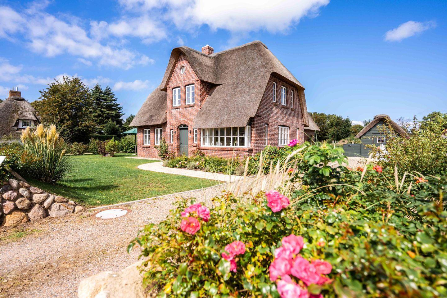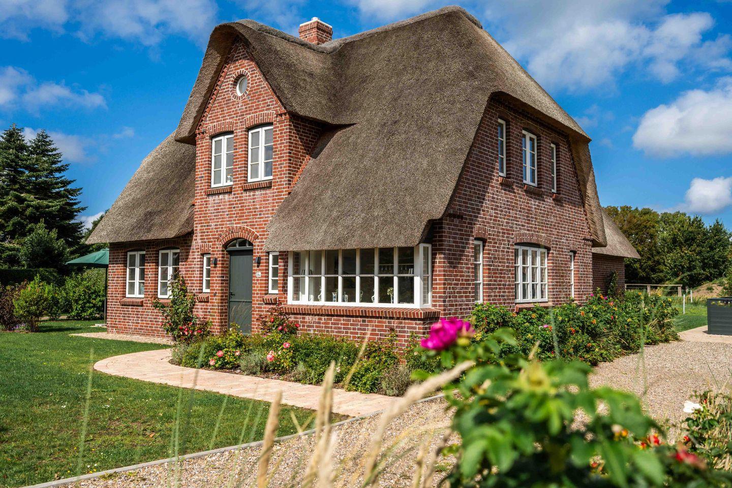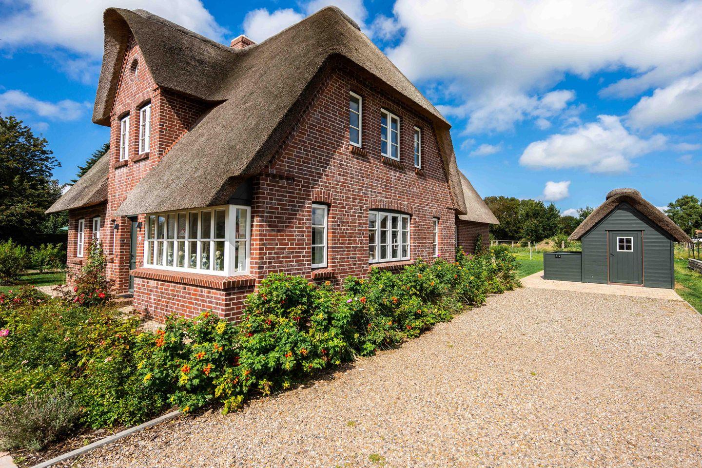 Auf einer ehemaligen Pferdekoppel entstand dieses großzügige Reetdachhaus, umringt von Friesenhäusern am Dorfrand von Borgsum. Das Haus wurde nach altem friesischen Vorbild mit einer Architektin der Insel so geplant, dass Spaziergänger sich oft fragen, ob es wirklich ein Neubau ist. Der Naturstrand des Nachbarortes Witsum ist bequem erreichbar.