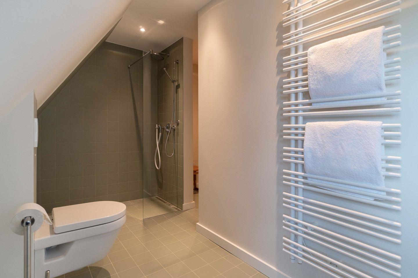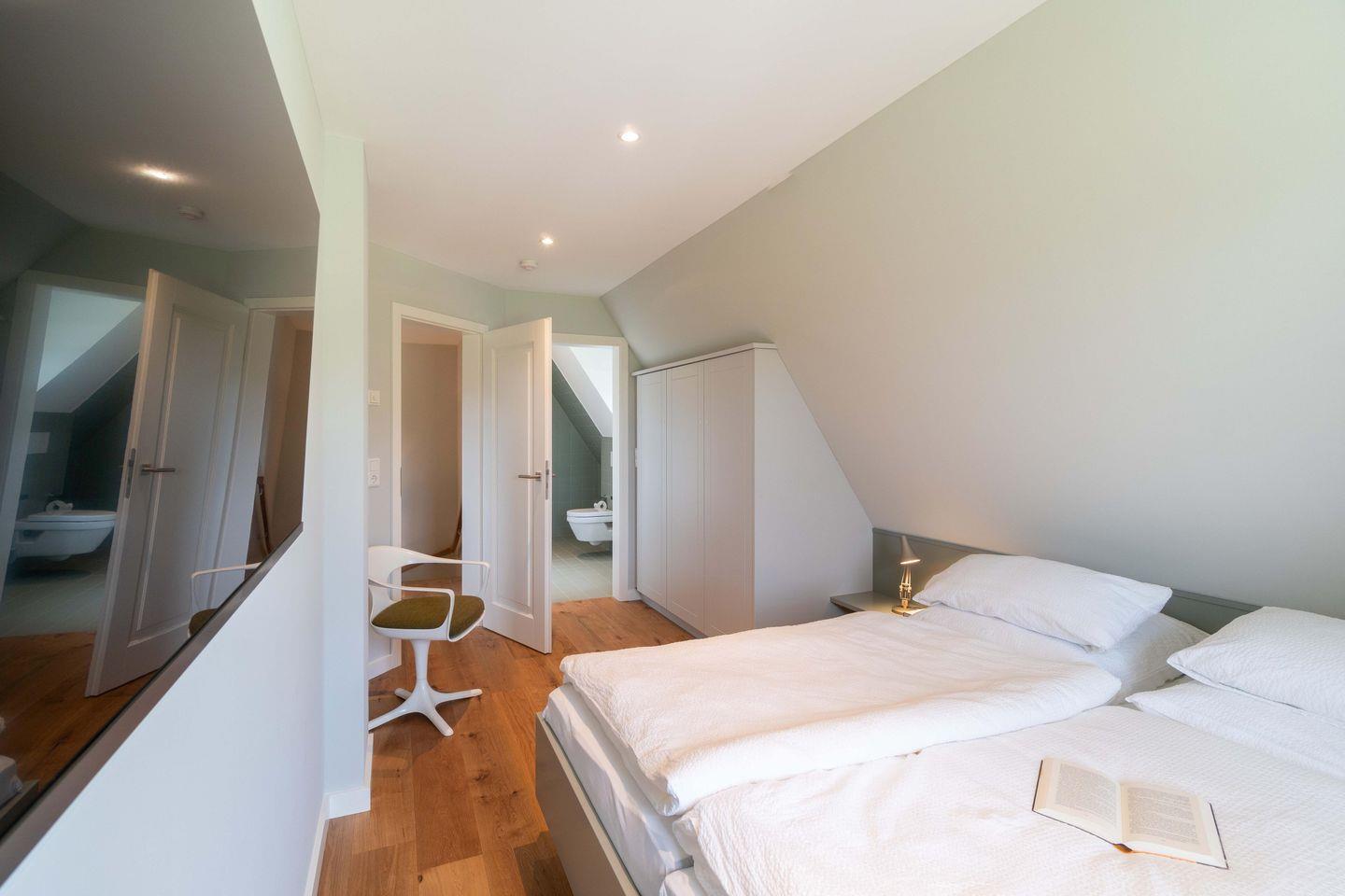 Die Doppelhaushälfte verfügt über zwei Doppelschlafzimmer, eines davon en Suite und eine individuell eingebaute Sauna. Die Bäder sind mit Raindanceduschen ausgestattet. Ein Kneippschlauch erfreut die Saunagänger.