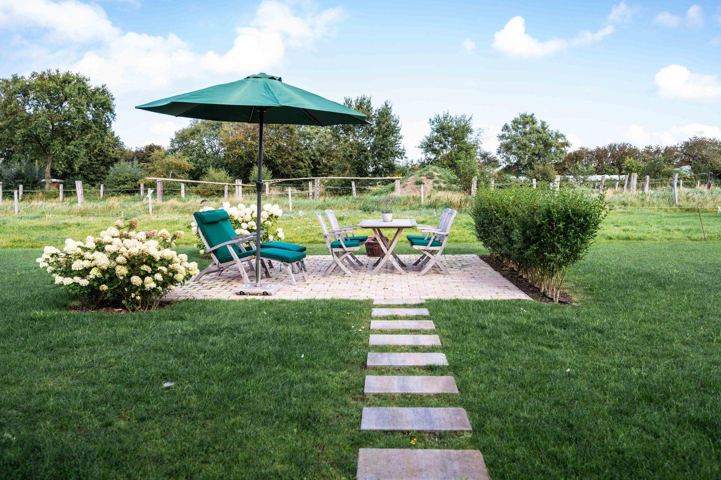 Das reetgedeckte malerische Gartenhäuschen verfügt über Strom für Ihre E-Bikes. Deckchairs und bequeme Teakmöbel lassen Sie Sonnenstunden auf der Terrasse genießen. Eine Ladesäule für Elektrofahrzeuge ist ebenfalls vorhanden. Fest installierte Mückengitter sorgen für weiteren Komfort.