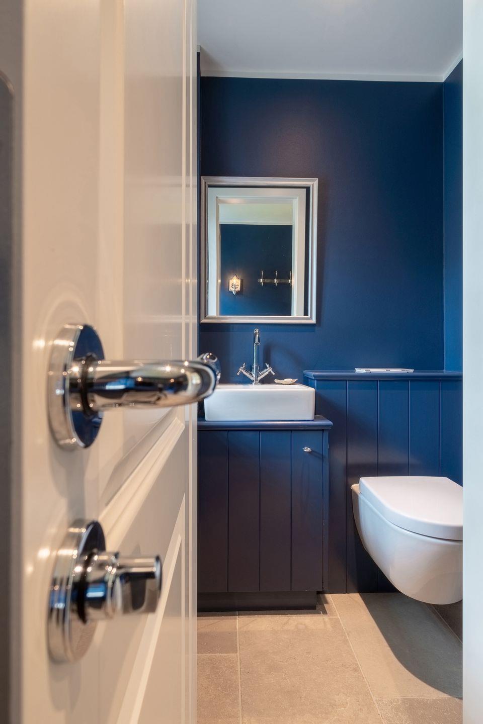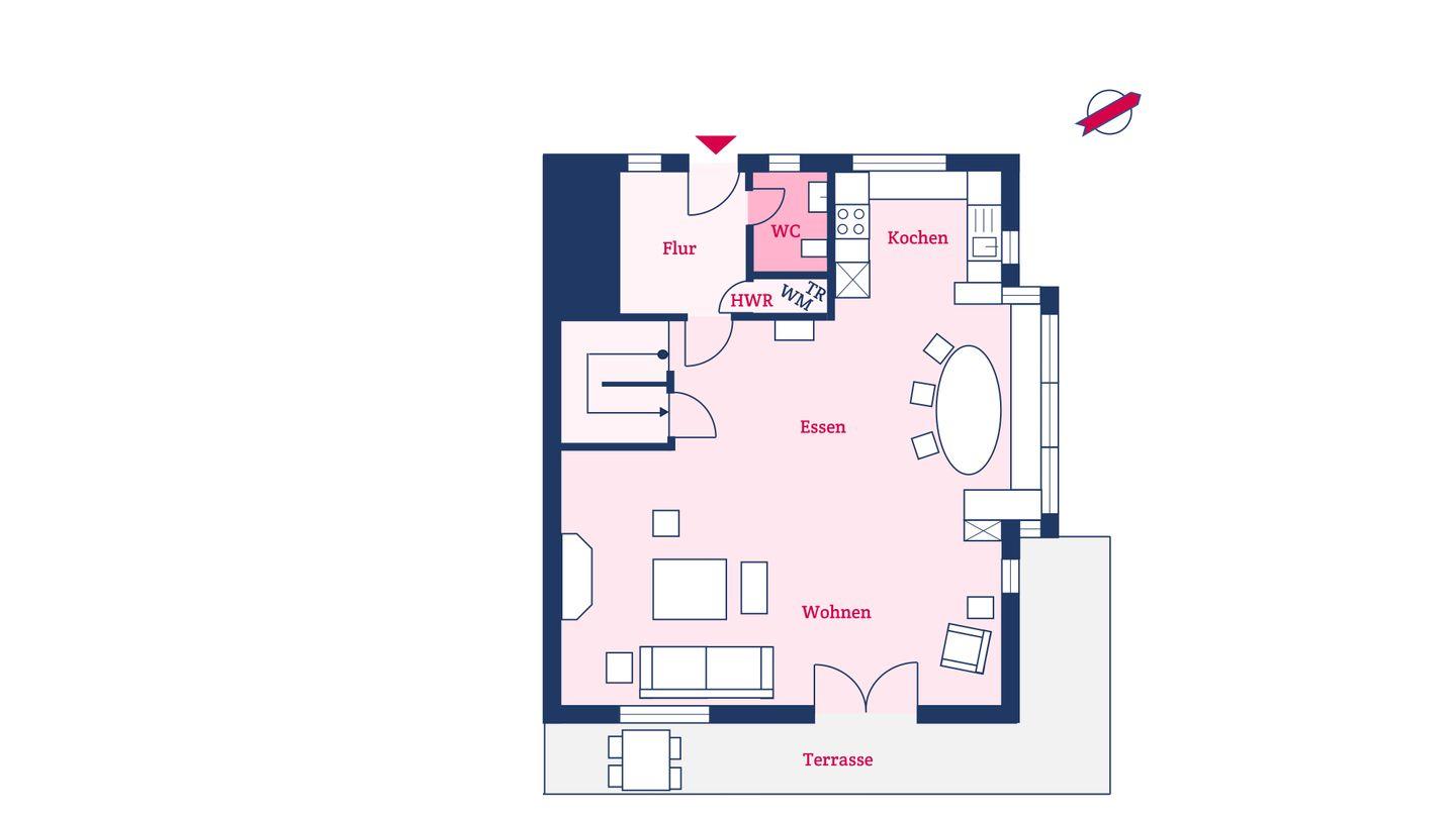 Durch den eigenen Hauseingang erreichen Sie den einladenden Eingangsbereich. Von dort erreichen Sie das Gäste-WC, den Hauswirtschaftsraum inkl. Waschmaschine und Trockner sowie den großzügigen Wohn- und Essbereich mit offener Küche und direktem Zugang zu der Terrasse. Im Wohnbereich sticht der moderne Einbau-Glaskamin in einer blauen Wand hervor und lädt zum Verweilen ein. Die Küche ist vielfältig und gut ausgestattet.