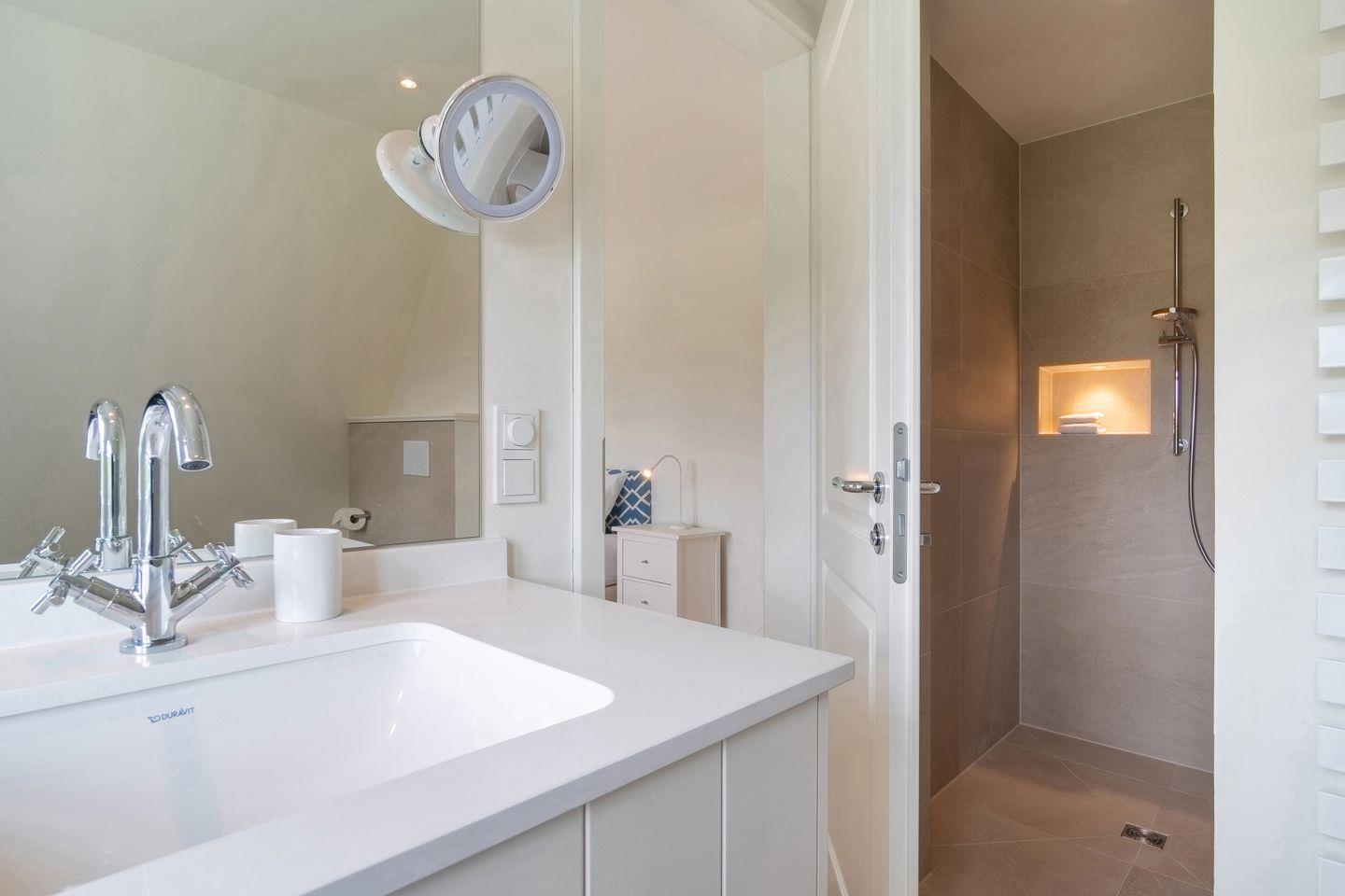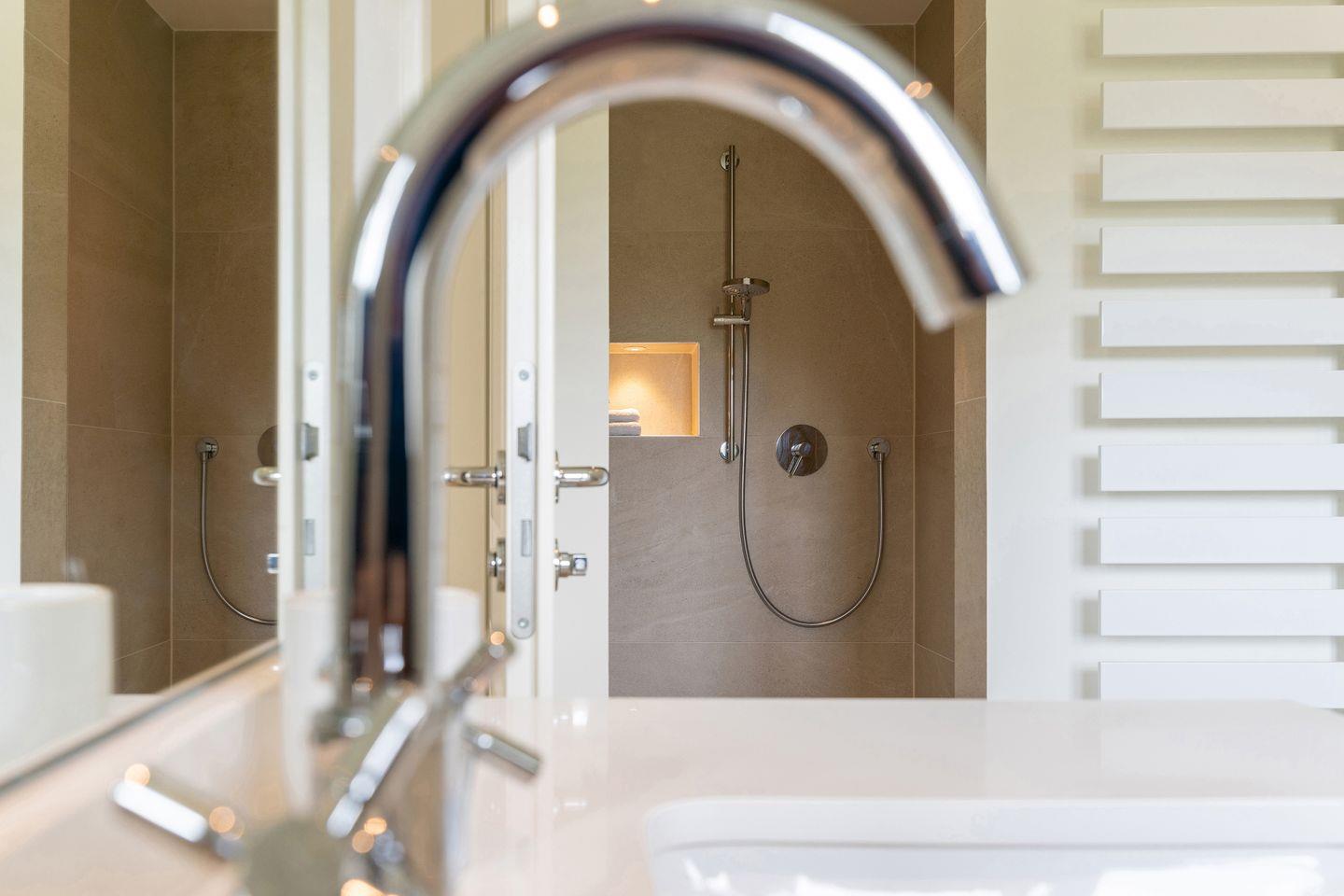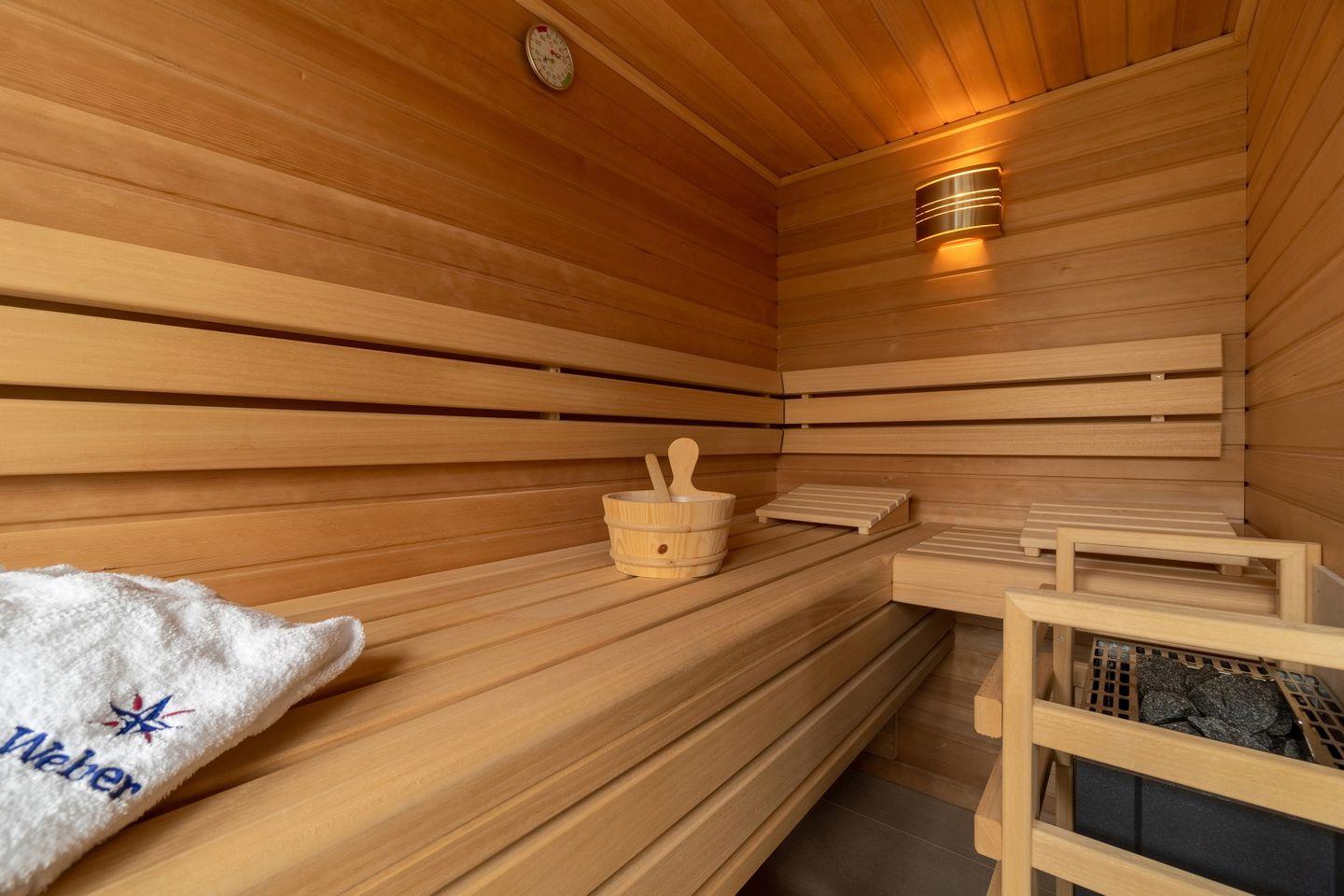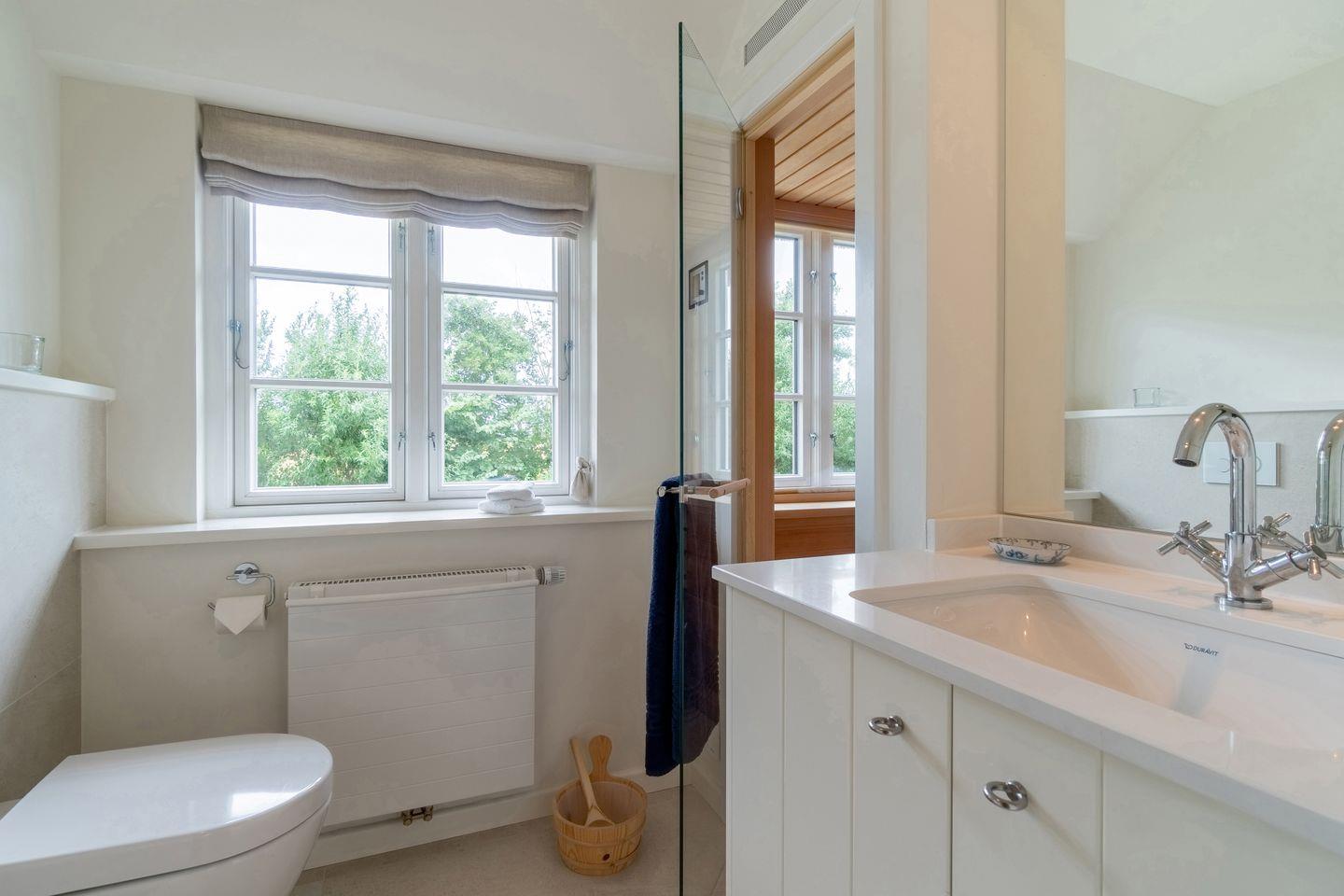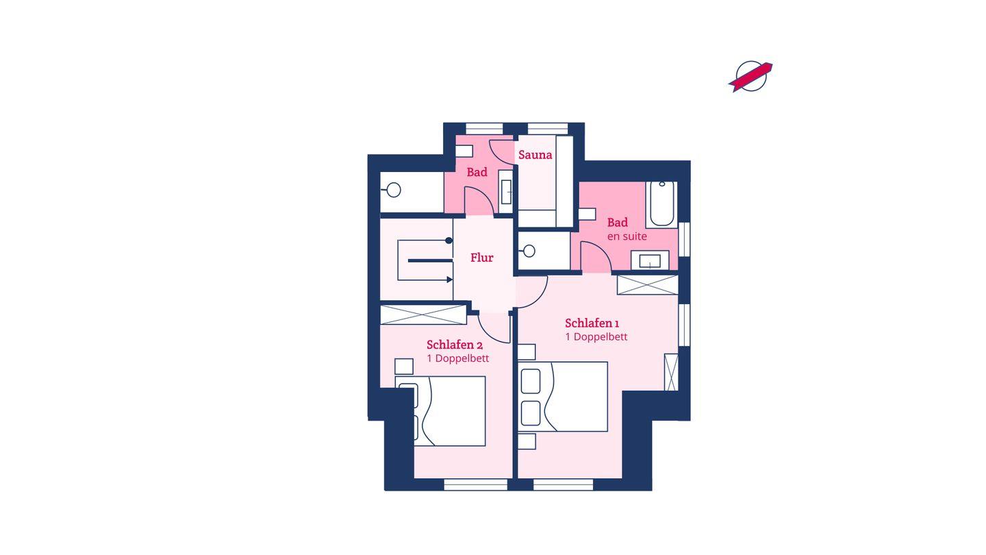 Im Obergeschoss finden Sie die zwei modernen Schlafzimmer mit jeweils einem Doppelbett vor. Über das erste Schlafzimmer erreichen Sie das Bad en Suite, in welchem Ihnen sowohl eine Badewanne als eine bodengleiche Dusche zur Verfügung steht. Auch für zusätzliches Kinderreisebettchen wäre hier genügend Platz vorhanden. Das zweite Badezimmer verfügt ebenfalls über eine bodengleiche Dusche und bietet Zugang zu der hauseigenen Sauna.