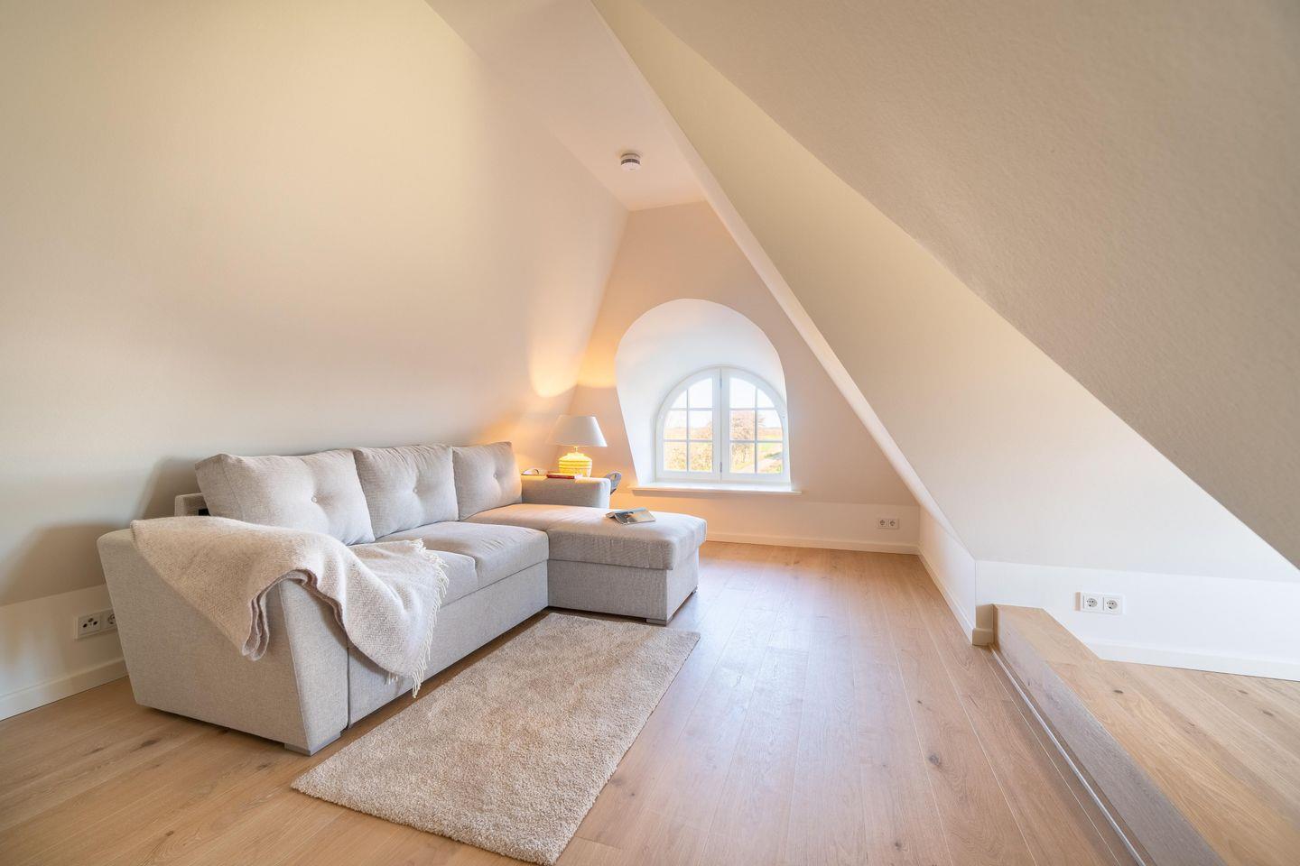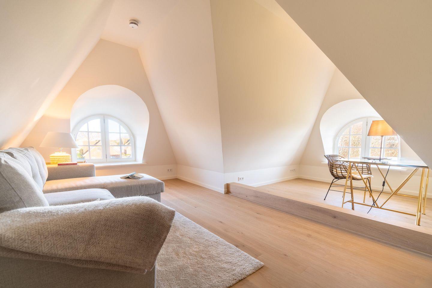 Der Spitzboden der Doppelhaushälfte Eugenienhus 1a ist zu einem sehr großzügigen Rückzugsort samt Schreibtisch und Sofalandschaft ausgebaut worden. In diesem Zimmer ist der WLAN-Epfang ebenso gut wie im Wohnbereich des Hauses im Erdgeschoss. Wer im Urlaub auch einmal etwas arbeiten muss, ist mit dem Eugenienhus 1a sehr gut beraten! Übernachtungen im Obergeschoss sind in diesem Feriendomizil nicht gestattet.