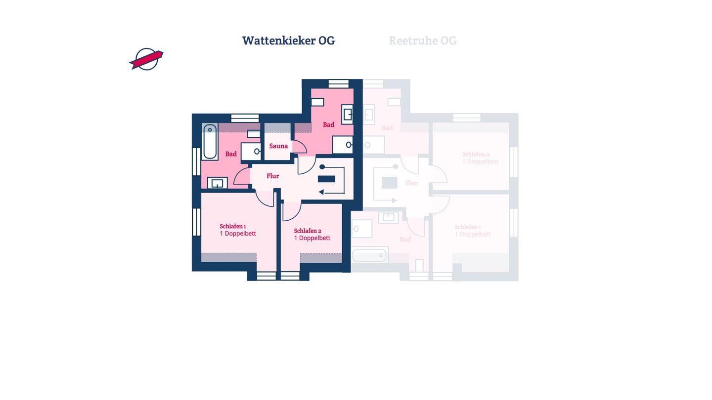 Die reetgedeckte Ferienhaushälfte Wattenkieker verfügt über 2 Schlafzimmer, 2 Bäder und 1 Gäste-WC und bietet somit komfortabel Platz für bis zu 4 Personen zuzüglich einer Kleinkinderaufbettung.