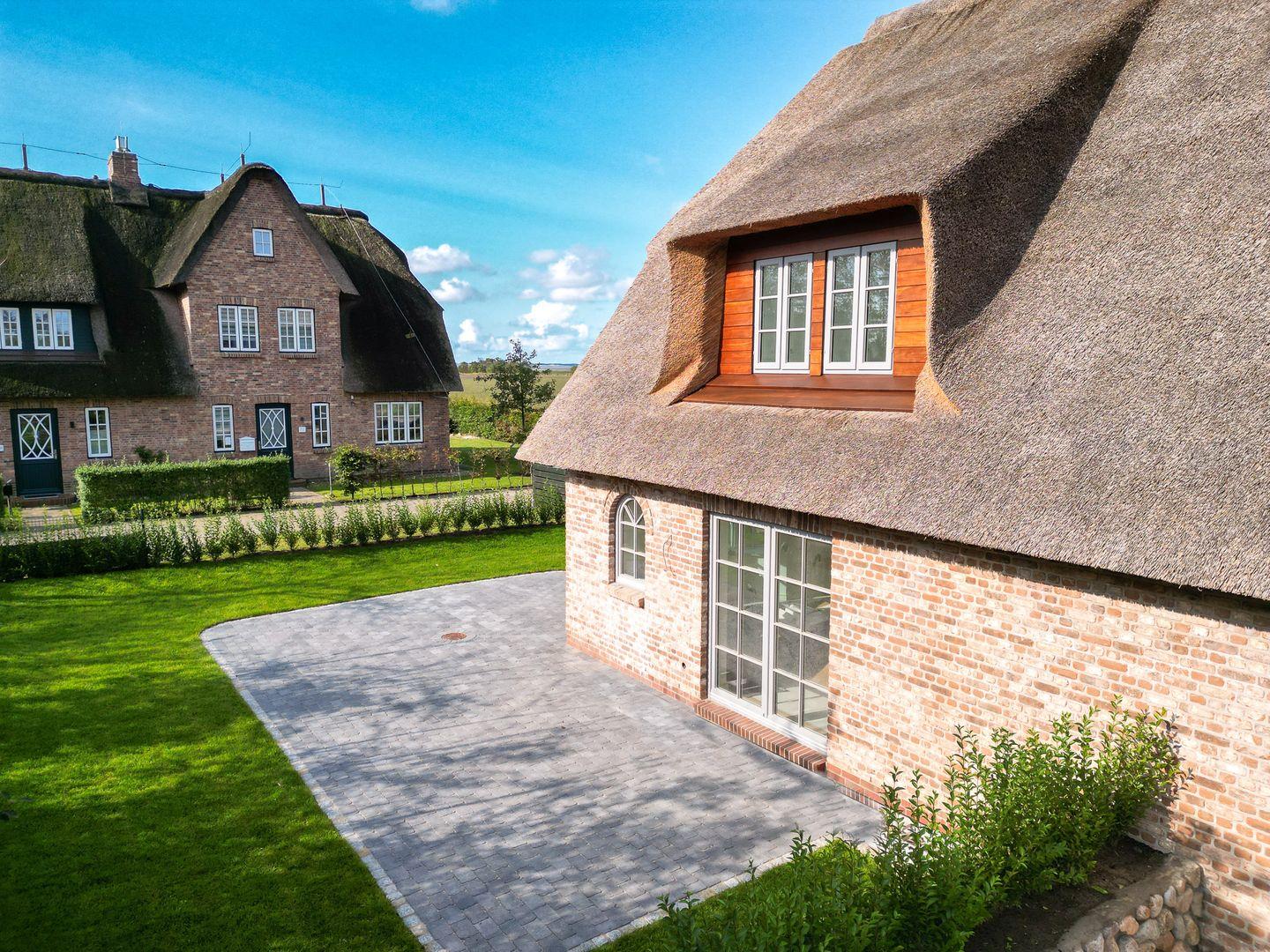 Moderne, reetgedeckte Ferienhaushälfte Wattenkieker mit Sauna, Terrasse und Garten in ruhiger Lage bei Borgsum.