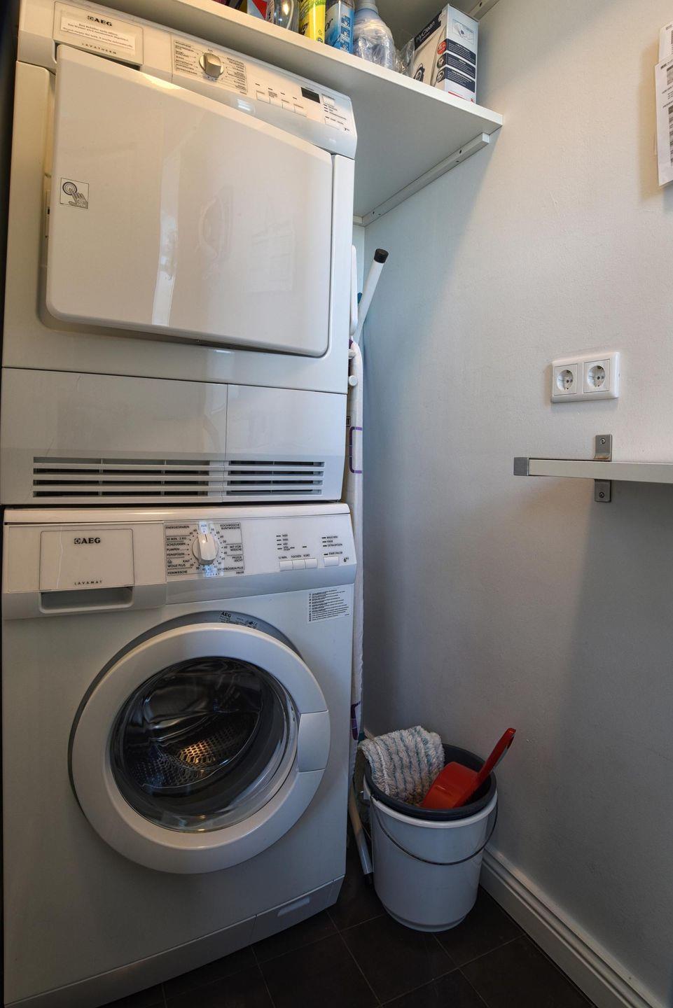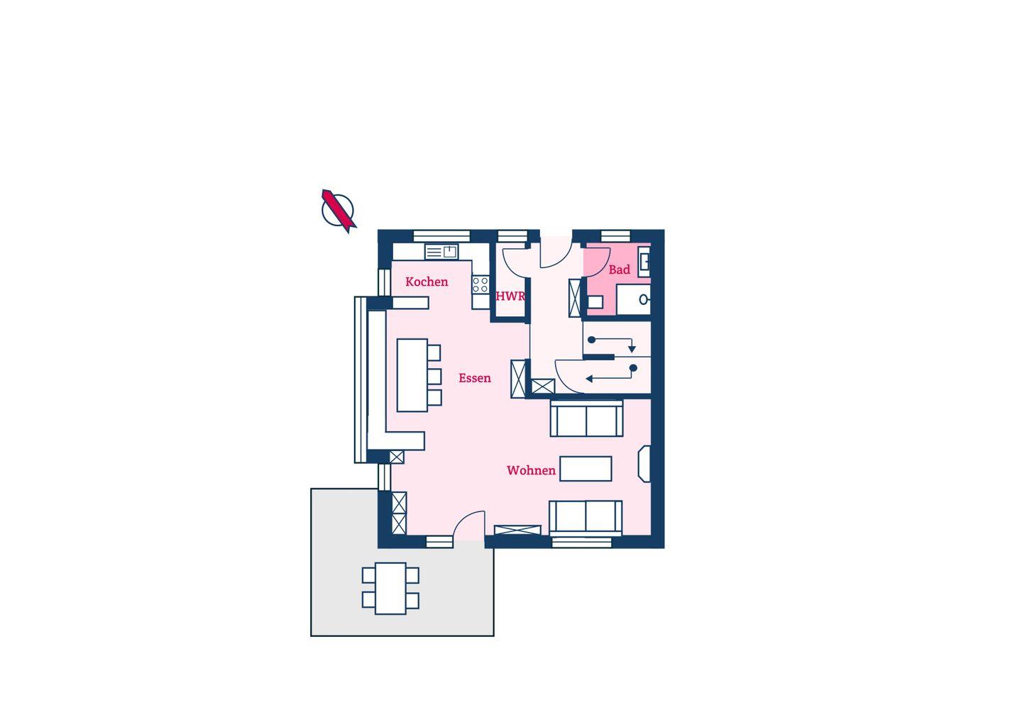Im Erdgeschoss der Ferienwohnung befindet sich der großzügige Wohn-, Ess- und Küchenbereich mit direktem Zugang zur Terrasse, ein Badezimmer mit bodengleicher Dusche sowie eine winzige Waschküche, in welcher Waschmaschine und Trockner zu finden sind.