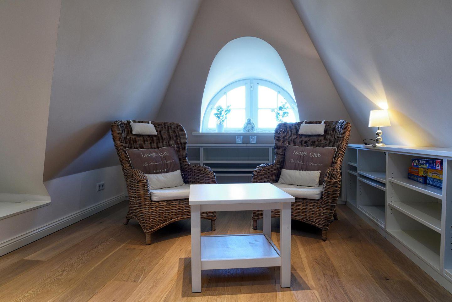 Im Dachgeschoss des Ferienhausteils befindet sich ein weiterer Raum mit firsthoch offener Decke. Sitzgelegenheiten, ein Fernseher sowie ein weiteres Doppelbett runden hier das Angebot der Friesenliebe ab.