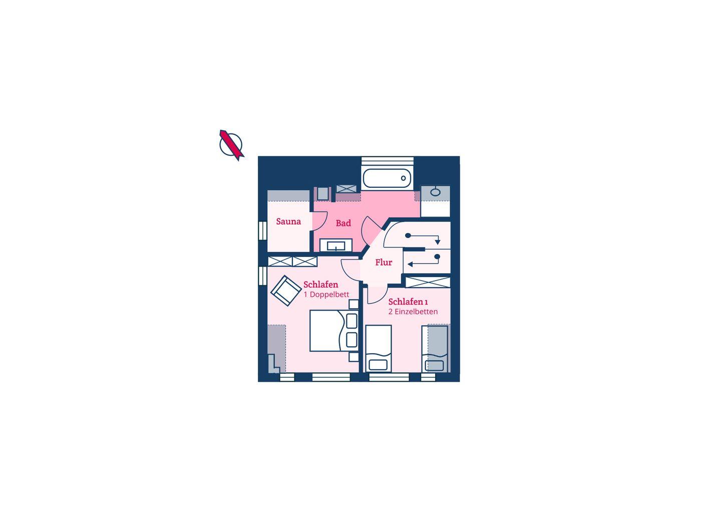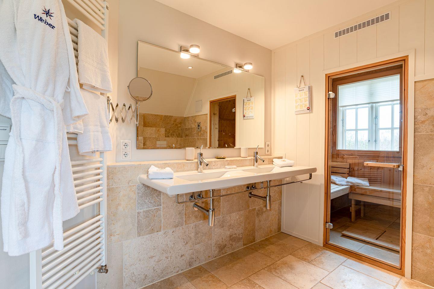 Über die beleuchtete Treppe gelangen Sie ins Obergeschoss, in welchem ein Schlafzimmer mit Doppelbett, ein Schlafzimmer mit zwei Einzelbetten und der Möglichkeit, eine dritte Schlafmöglichkeit aus einem der Einzelbetten herauszuziehen sowie das großzügige Wellnessbadezimmer mit bodengleicher Dusche, Badewanne und Sauna liegen.