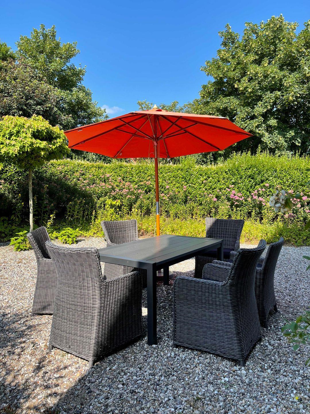 Der gepflegte Außenbereich des Hauses weist eine rundum durch eine hochgewachsene Hecke geschützte Terrasse auf, einen PKW-Stellplatz sowie ein Gartenhäuschen. In diesem werden im Winter die Außenmöbel untergebracht und von April bis Oktober bietet er eine Unterstellmöglichkeit für beispielsweise Ihre Fahrräder, das Strandspielzeug Ihrer Kinder, etc.