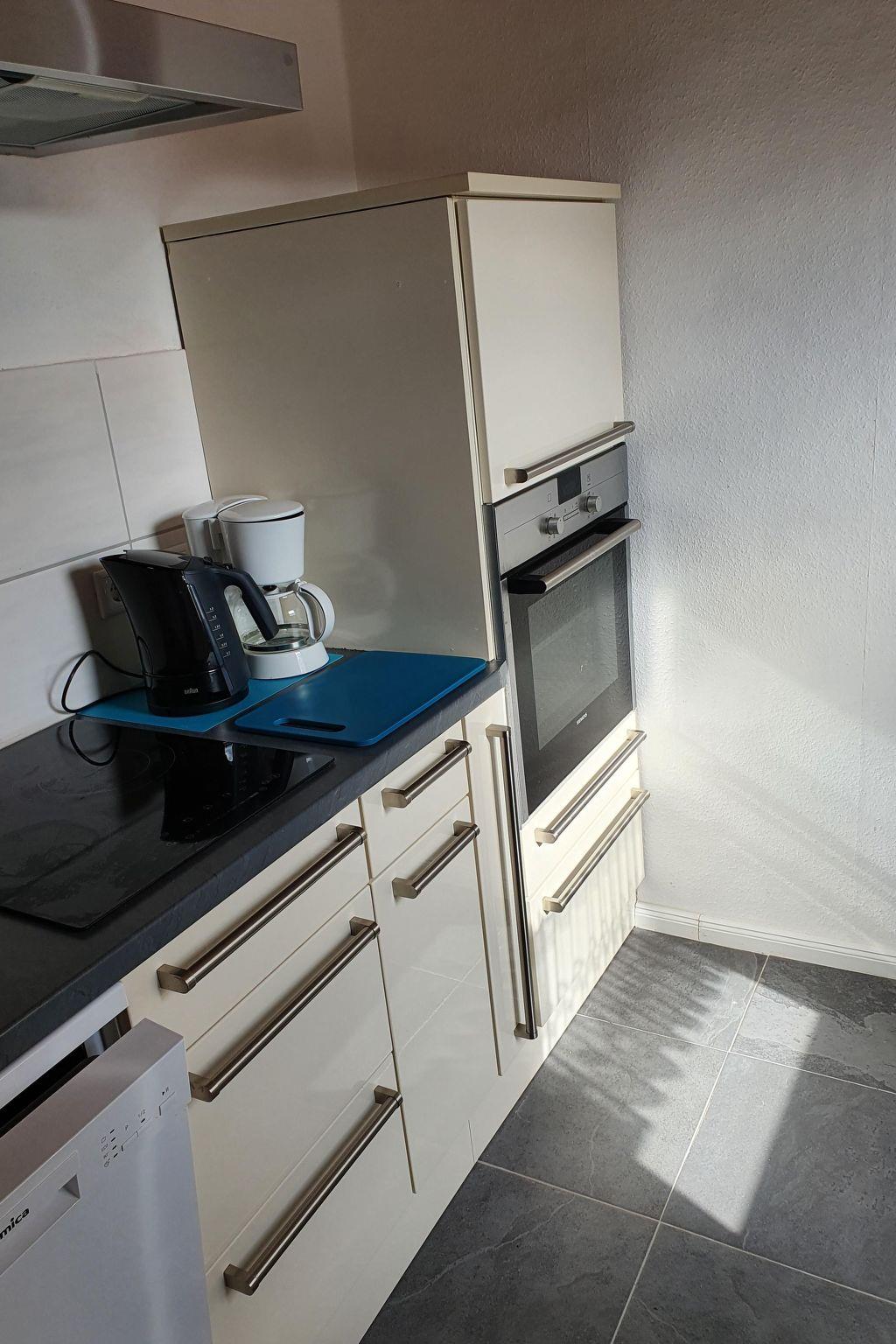 Im Inneren empfängt das Apartment seine Gäste mit einer wohl durchdachten Anordnung. Der kombinierte Wohn- und Schlafbereich ist mit einem bequemen 1,60 m breiten Bett, zwei Nachttischen, einem Tisch mit einer gemütlichen Eckbank und Stuhl sowie einer praktischen Garderobenecke und einem zweitürigen Kleiderschrank ausgestattet. Zwei große Fenster sorgen für ein lichtdurchflutetes, einladendes Ambiente. Die Kochecke bietet mit Cerankochfeld, Filter-Kaffeemaschine, Spülmaschine und Wasserkocher alles Nötige für die Zubereitung kleiner Mahlzeiten.