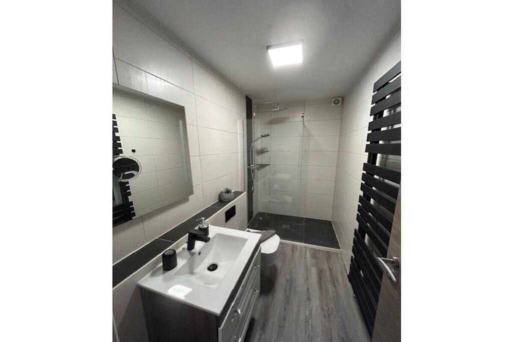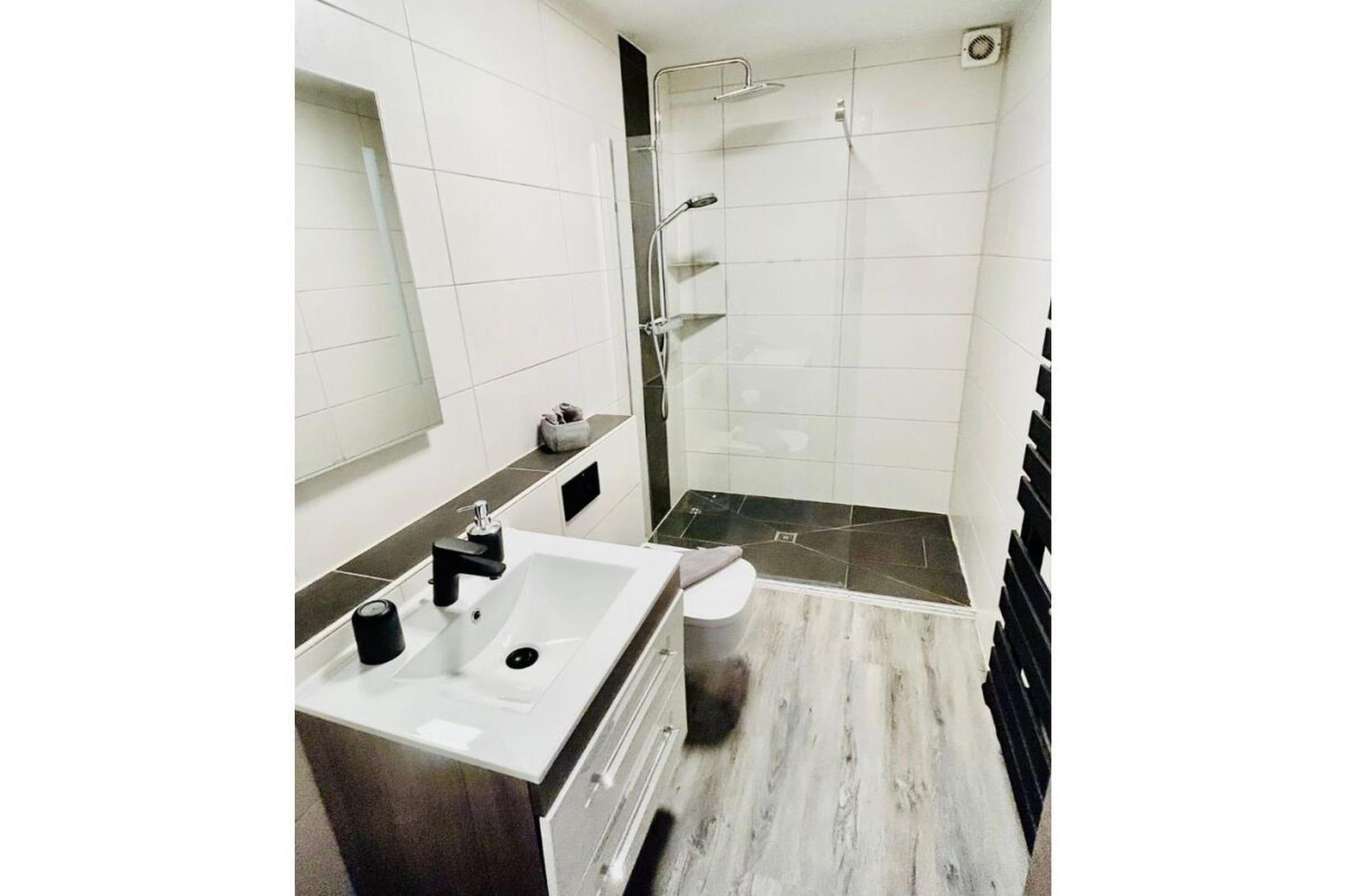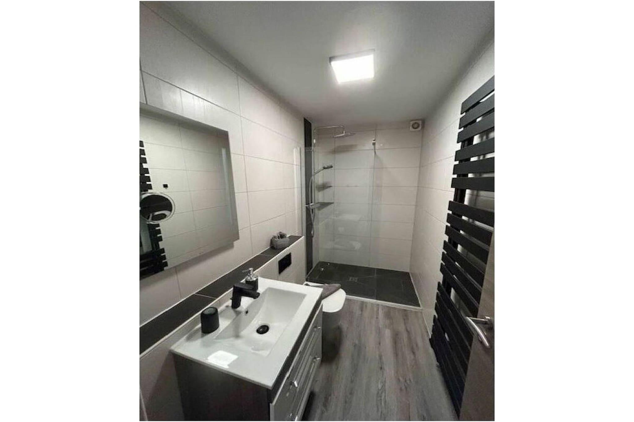 In der 1. Etage: (Küche(Mikrowelle), Wohn/Esszimmer(TV, TV, Esstisch)) , , Schlafzimmer(Doppelbett), Internet, Trockner, Waschmaschine, Balkon, Heizung, Terrasse(Gartenmöbel), Bügelbrett, Bügeleisen, Trockenschrank, parken (kostenpflichtig)