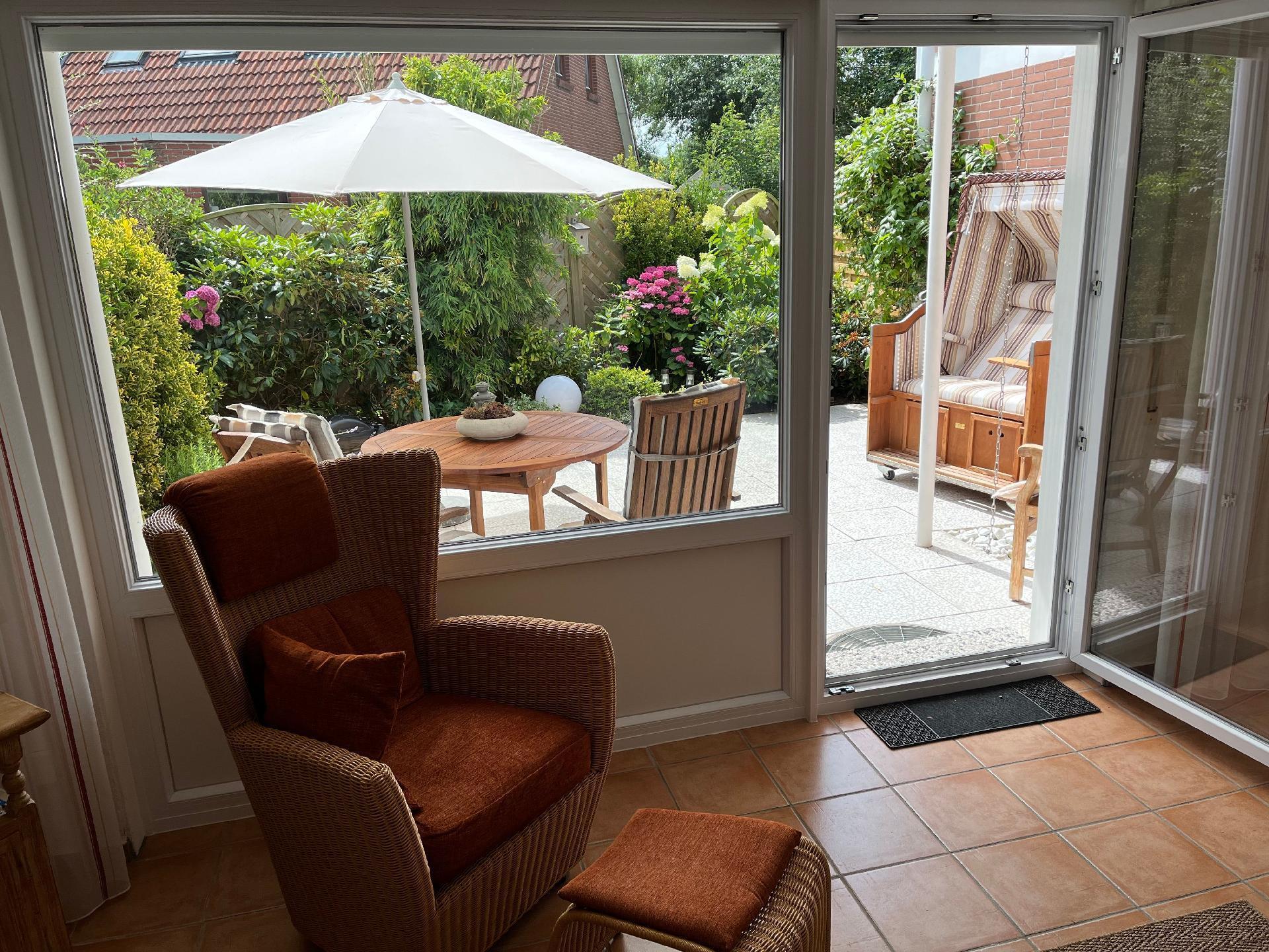 Sie ist komfortabel ausgestattet, verfügt über ein Wohnzimmer mit angegliederter Küchenzeile und Terrasse, ein Badezimmer mit Dusche und ein Schlafzimmer mit Doppelbett. Ein eigener Eingang mit kleinem Flur führt zu der ebenerdigen, stufenlosen Wohnung. Die Wohnung ist hochwertig mit Pinienmöbeln ausgestattet und lädt auch an Regentagen zum Verweilen ein. Auf der Sonnenterrasse steht ein Strandkorb, in dem man es sich gemütlich machen kann. Gartentisch und Stühle sind natürlich ebenso vorhanden.