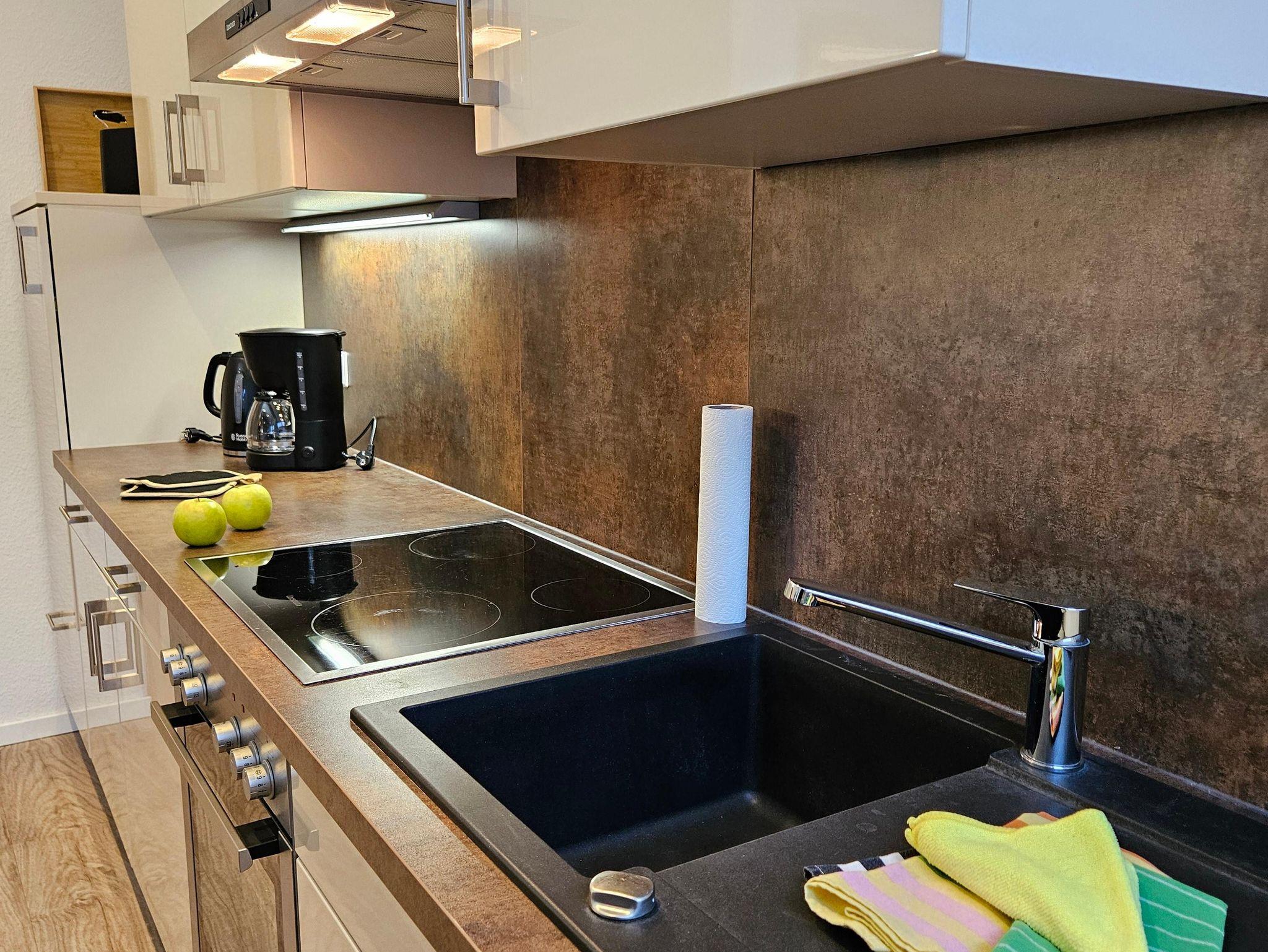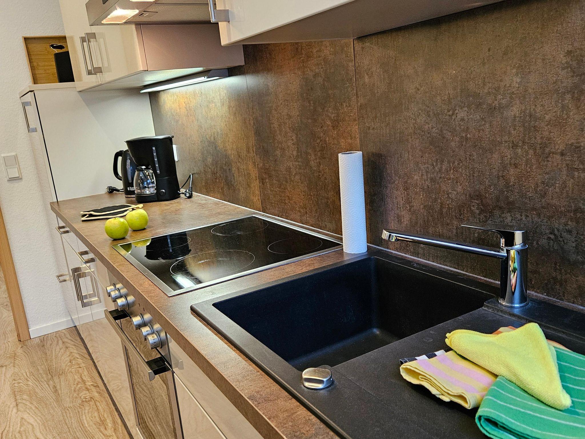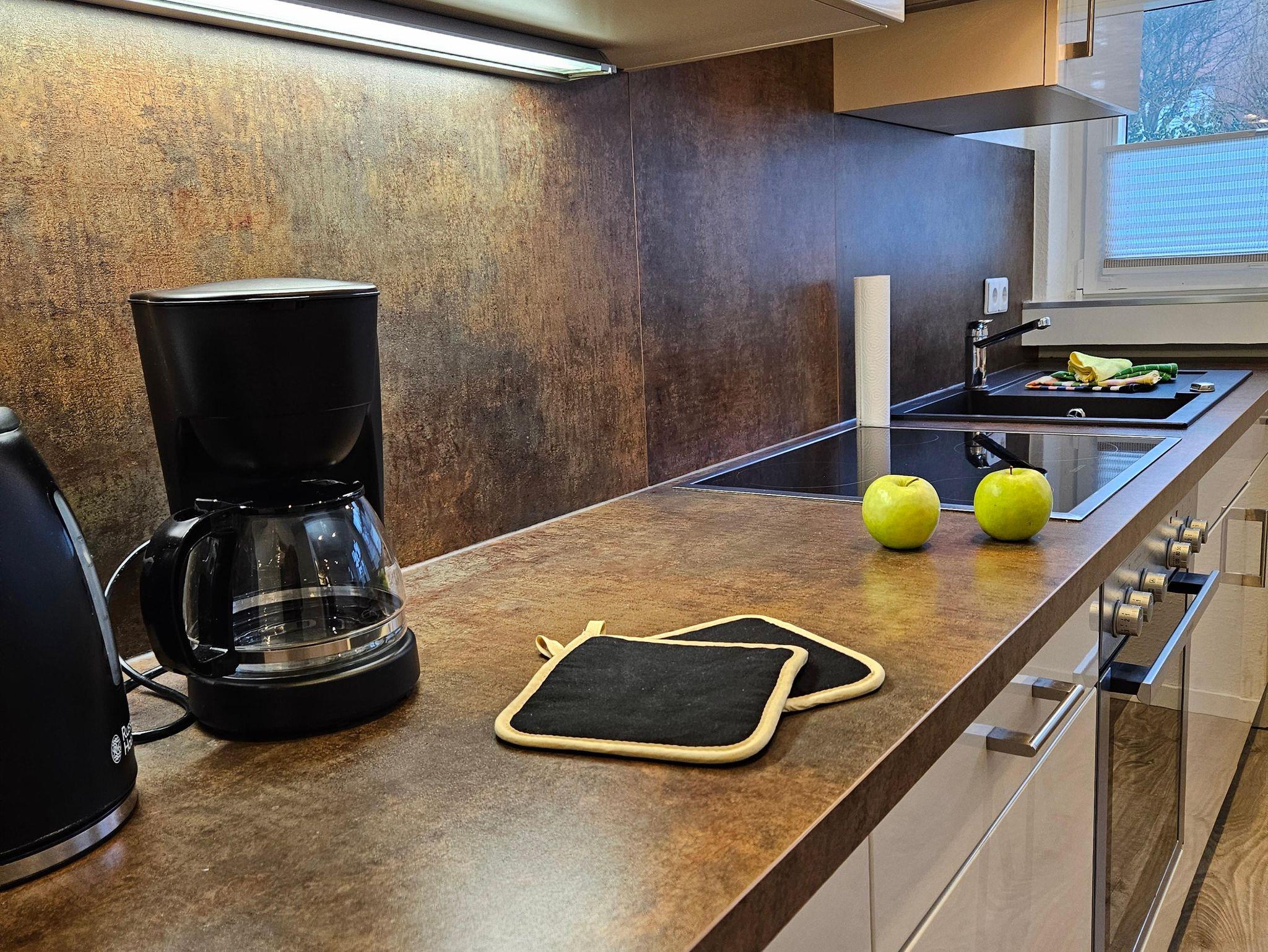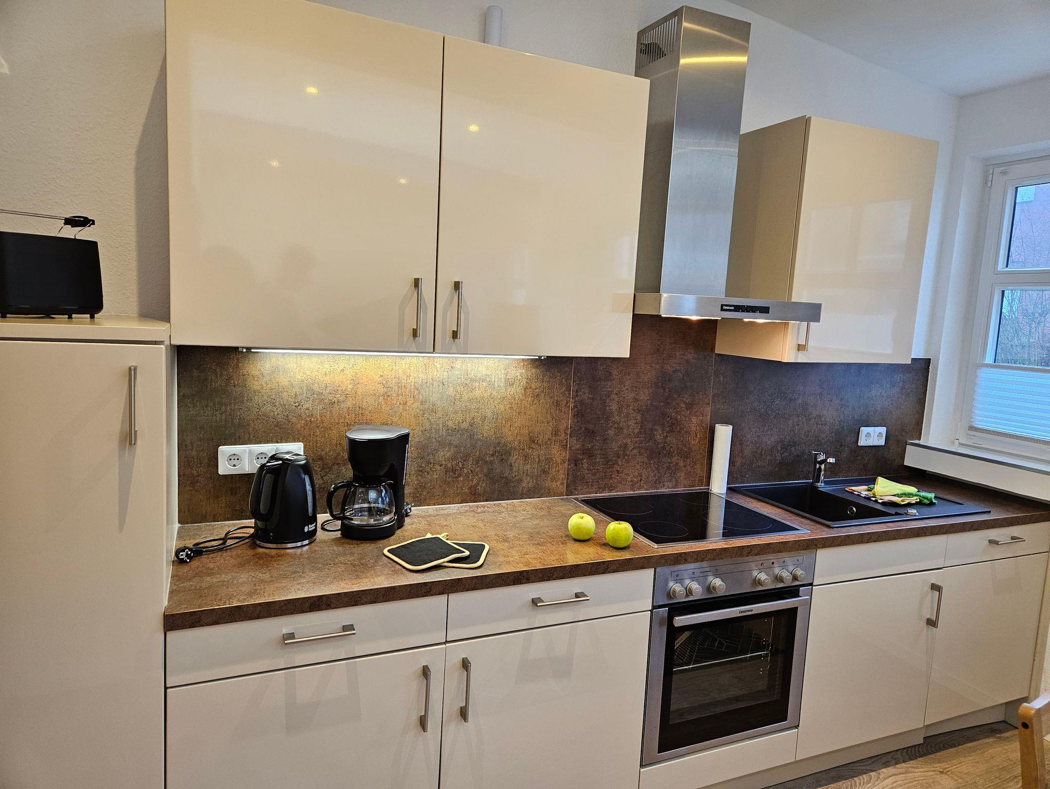 - Küchenzeile mit Kaffeemaschine, Wasserkocher, Toaster, Kühlschrank, Backofen Spülmaschine