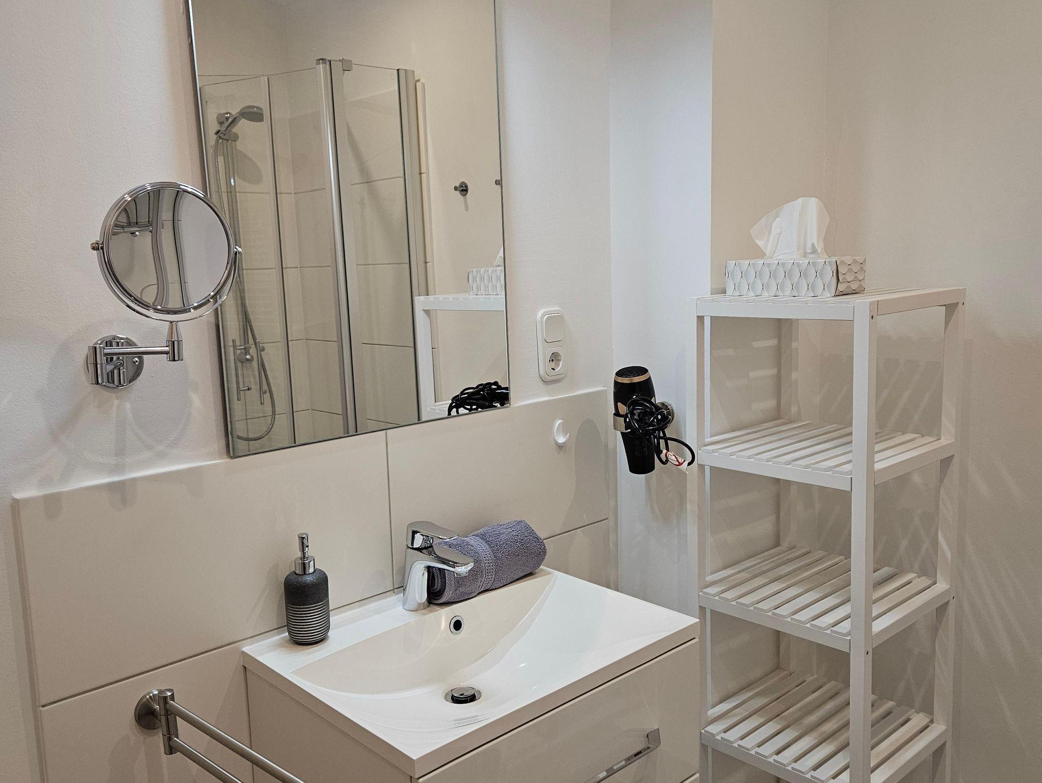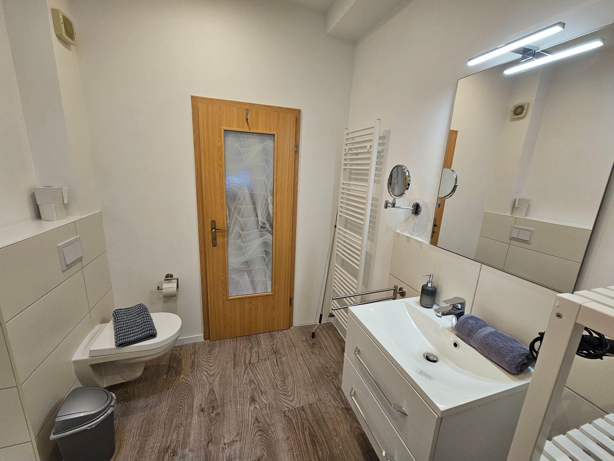 - Badezimmer mit Kosmetikspiegel und Haartrockner