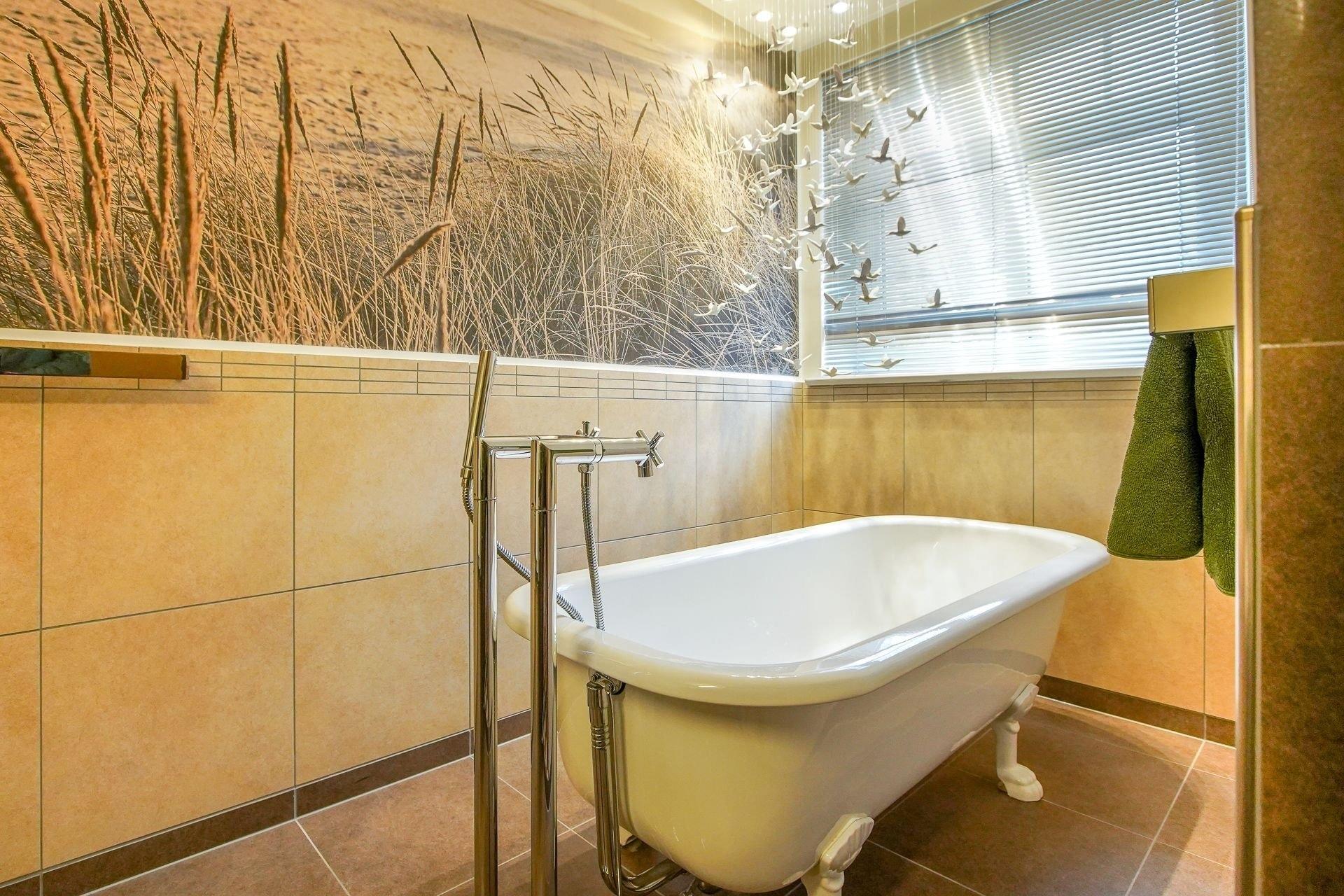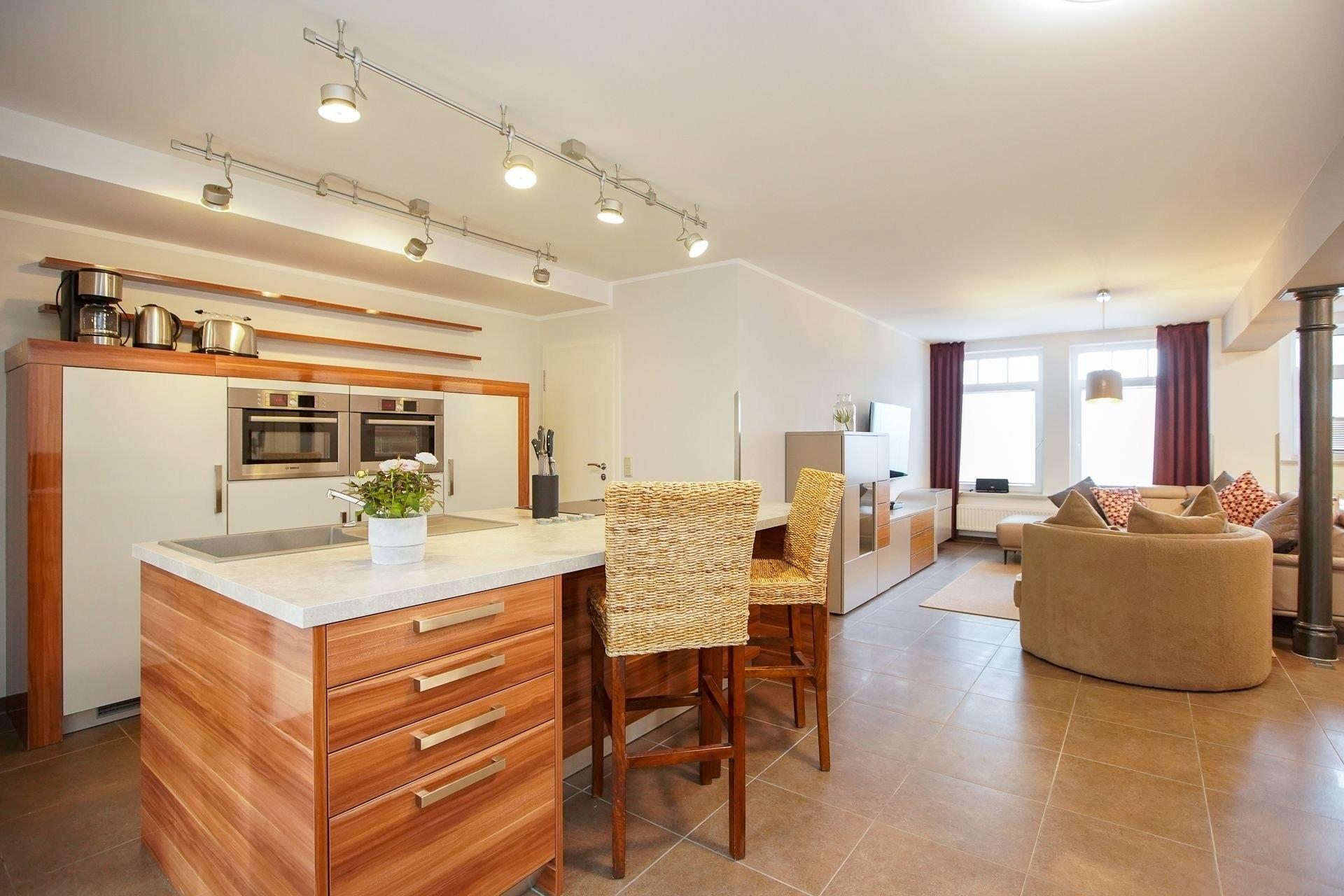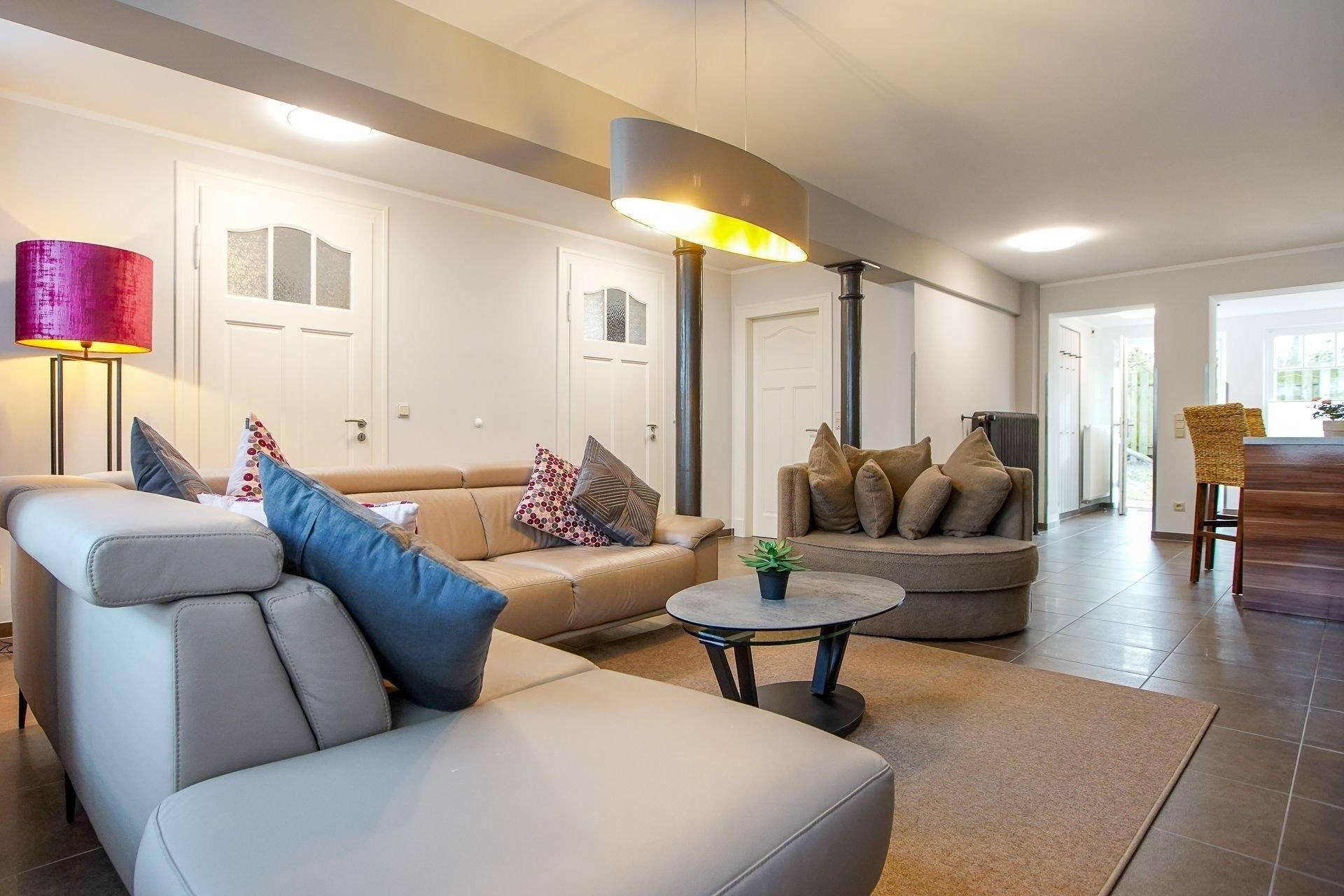 Es empfängt Sie ein großer, offener Wohn-/Essbereich mit Küche. Die schicke, moderne Küche mit Geschirrspüler, lässt keine Wünsche offen und das Herz eines jeden Hobby-Kochs höher schlagen. Auf bequemen Sofas und Sesseln, lässt sich ein wunderbarer Tag, perfekt vor dem Flachbildschirm mit Blue-Ray-Player oder mit Musik der Hifi-Anlage ausklingen. Eines der zwei Schlafzimmer wurde mit einem Doppelbett und das andere mit zwei Einzelbetten ausgestattet. Im geräumigen Badezimmer gibt es eine große Dusche sowie eine freistehende Badewanne.