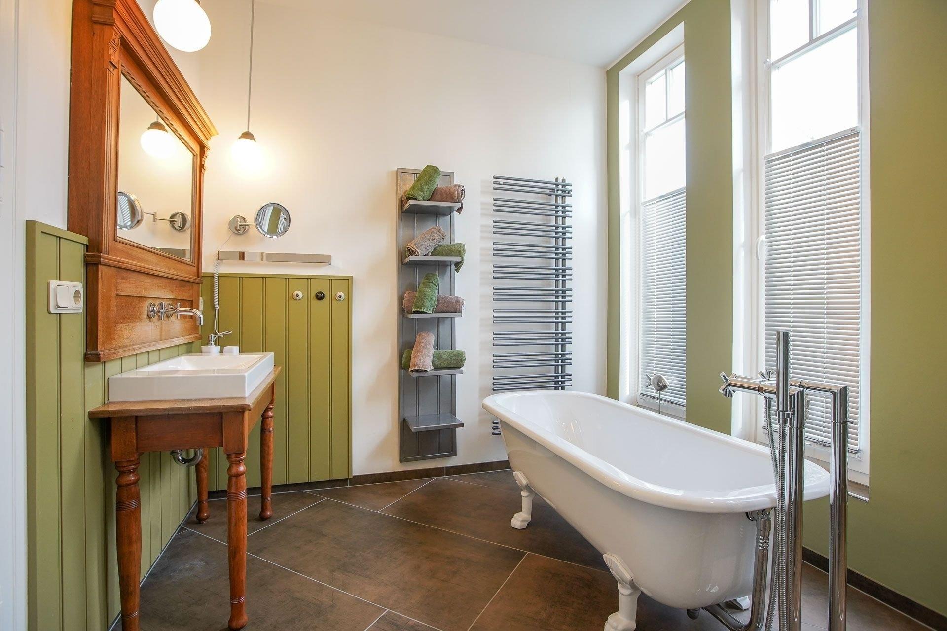 Das geräumige und gut gestaltete Badezimmer setzt die stimmige Innenarchitektur fort. Eine freistehende Wanne und eine Panorama-Dusche sorgen für Wohlfühlatmosphäre auch an grauen Tagen.