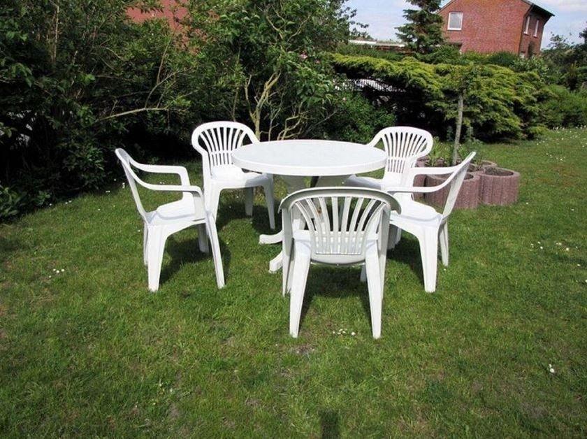 Im Garten vor dem Haus befindet sich ein Freisitz mit Tisch und Gartenstühlen.
