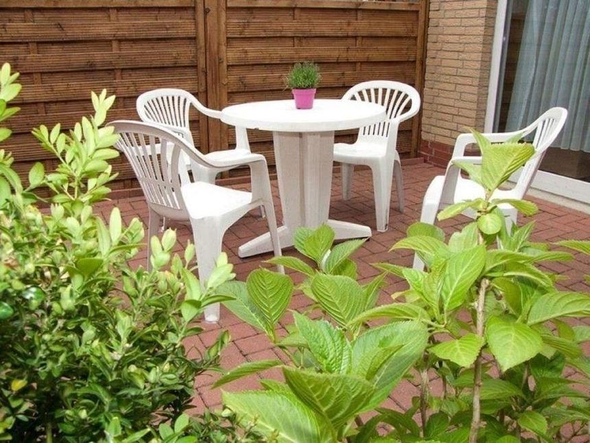 Vor der Wohnung befindet sich eine nach Osten ausgerichtete Terasse mit Gartenmöbeln.