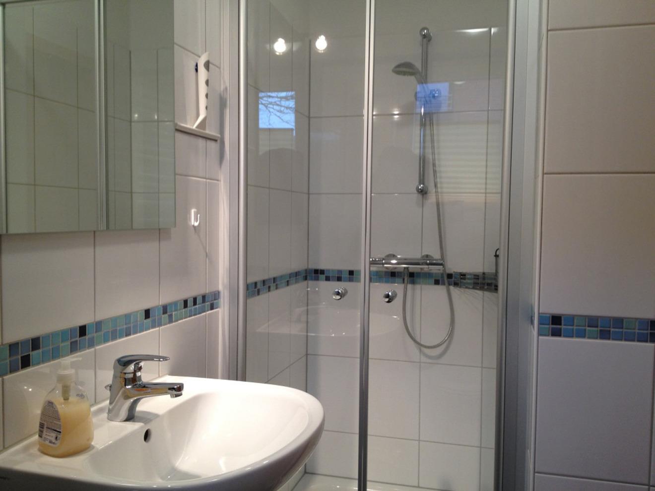 Es gibt 3 Schlafzimmer, ein Bad mit Dusche im Erdgeschoss und ein Bad mit Dusche und Waschmaschine (inkl. Trocknerfunktion) im 1. Obergeschoss. Die Räume im Erdgeschoss haben eine Fußbodenheizung.