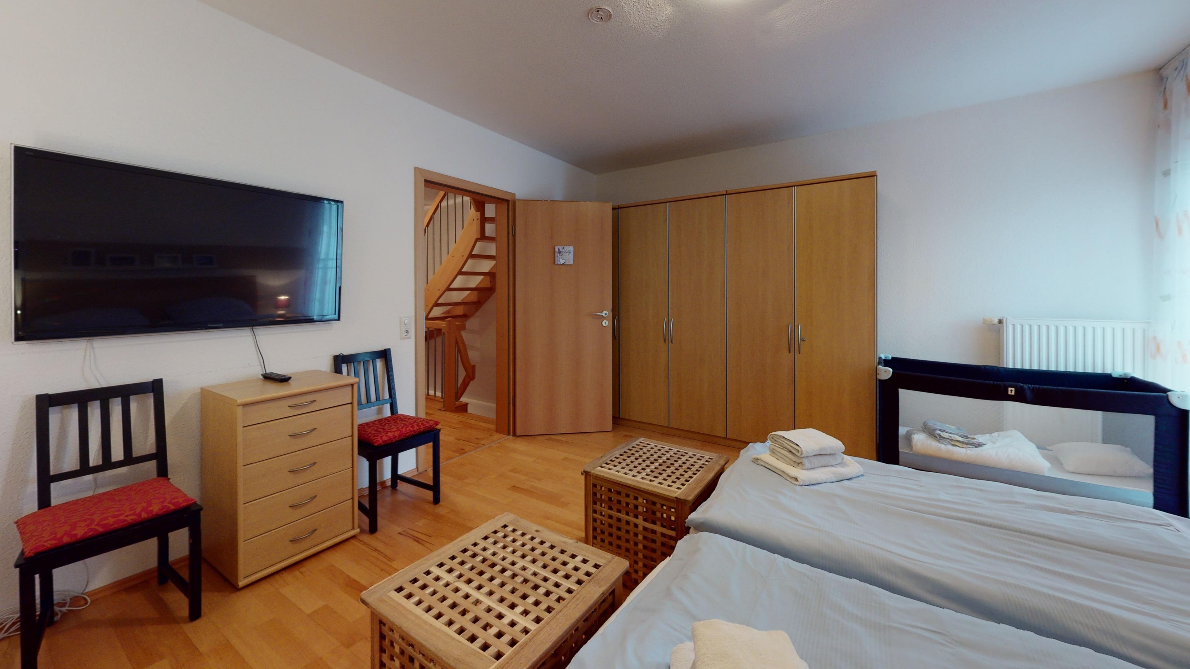Zur Ausstattung gehört ein Reisebett mit Matratze und Kinderbettwäsche. 2 Kinderhochstühle sind vorhanden.
