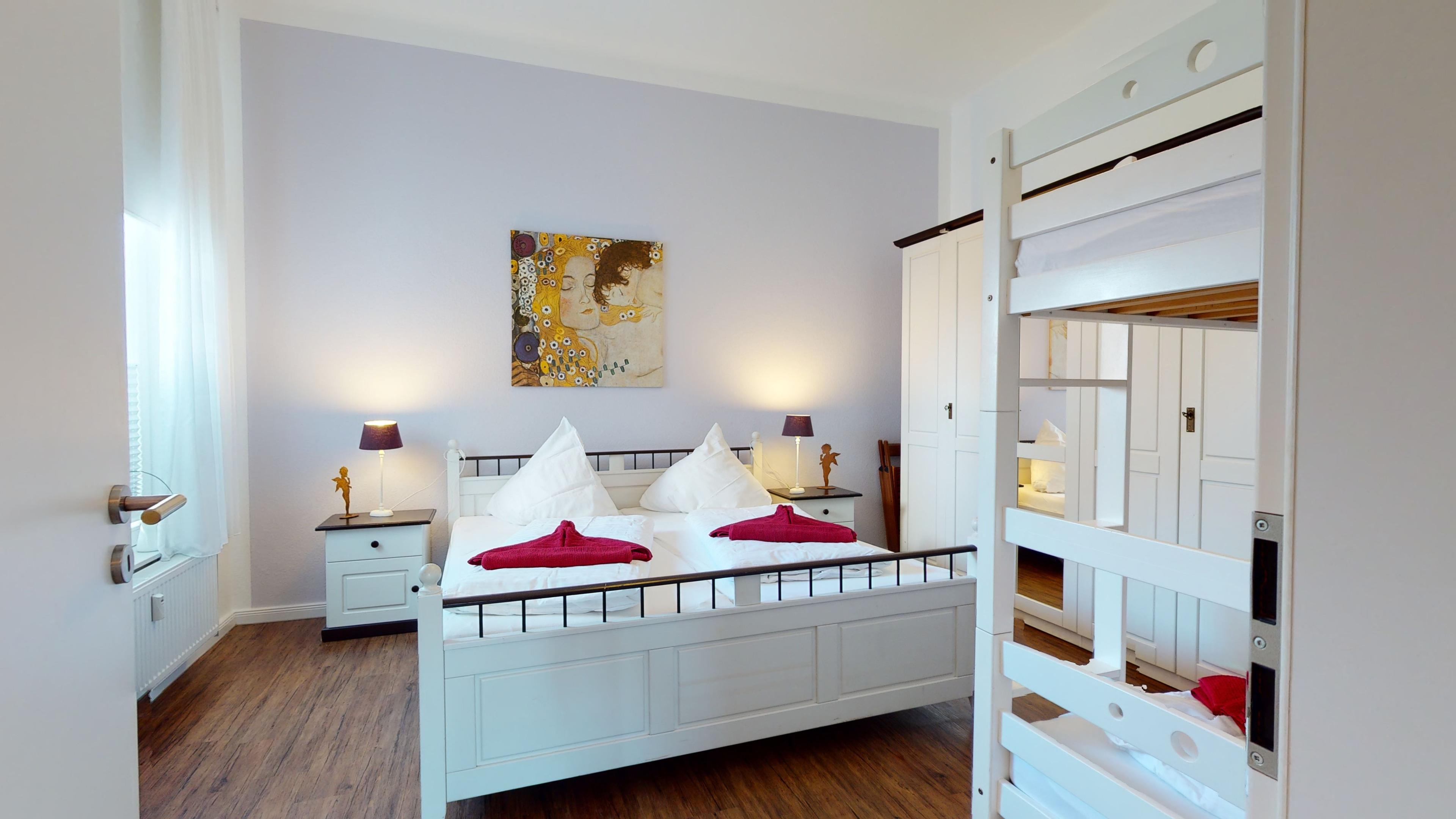 Diese Ferienwohnung befindet sich im 1. Obergeschoss der Villa Neptun und bieten Ihnen für max. 4 Personen Platz. Die Gesamtwohnfläche von ca. 55 m² teilt sich wie folgt auf: - Flur - Bad (ein Handwaschbecken, WC, Dusche mit extra flacher Duschwanne ca. 6 cm) - Schlafzimmer mit einem Doppelbett und Hochbett - gemütlicher Koch-, Ess- und Wohnbereich (Fernseher vorhanden) - Abstellraum
