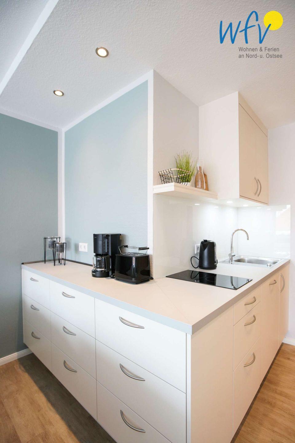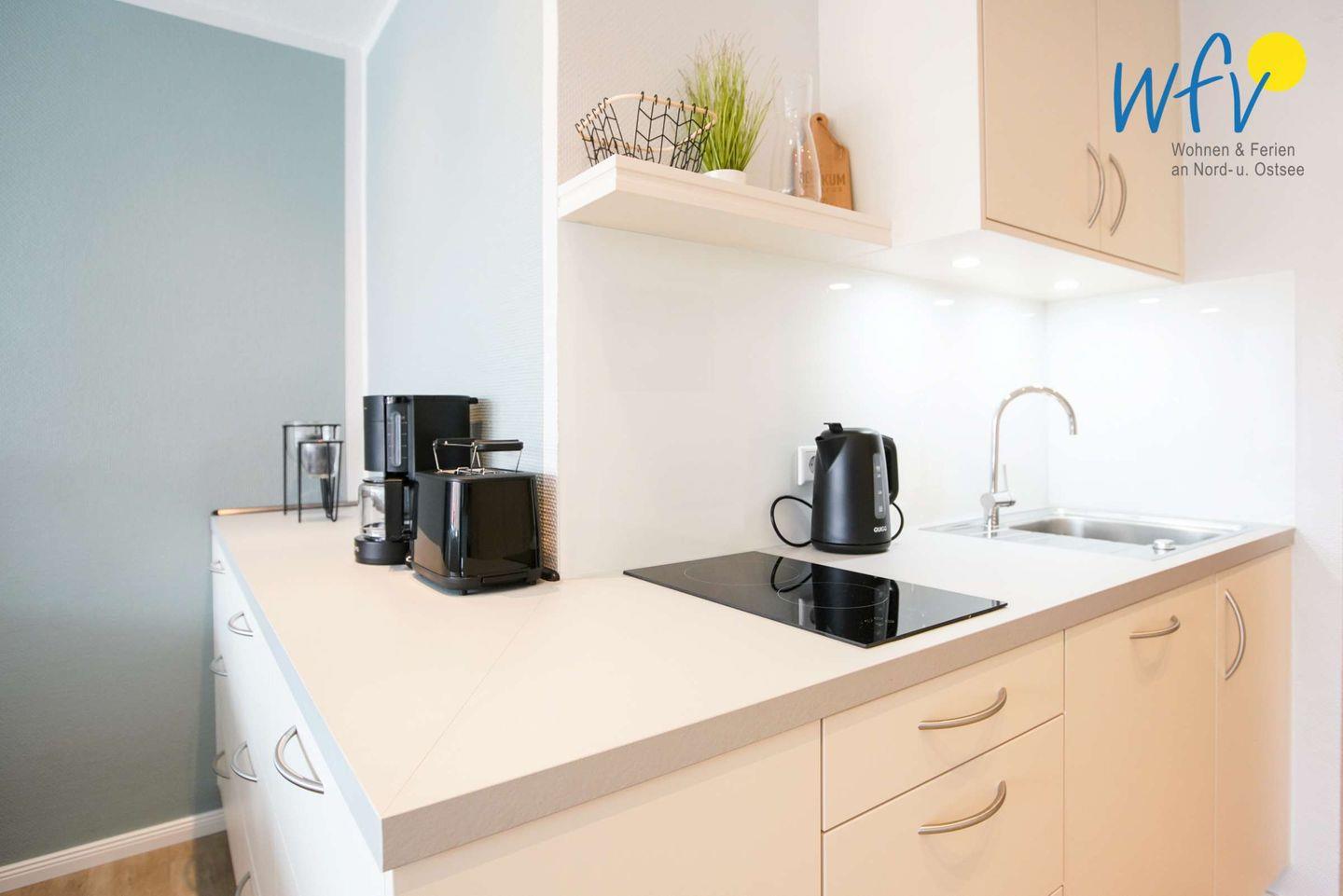 Die Ferienwohnung "Inseloase" verfügt über einen großzügigen Wohnraum, der u.a. mit einer gemütlichen Sitzecke und einem komfortablen Doppelbett 180 x 200 cm eingerichtet ist. Zusätzlich wurde eine moderne Küchenzeile integriert, sodass Sie sich in Ihrem Urlaub auf Borkum bequem selbst verpflegen können (u.a. mit 2-Plattenherd, Backofen, Kühlschrank mit Gefrierfach, Mikrowelle und Geschirrspüler sowie Kaffeemaschine, Wasserkocher und Toaster). Wohnkomfort erwartet Sie auch in dem modernen Badezimmer mit Glasdusche.