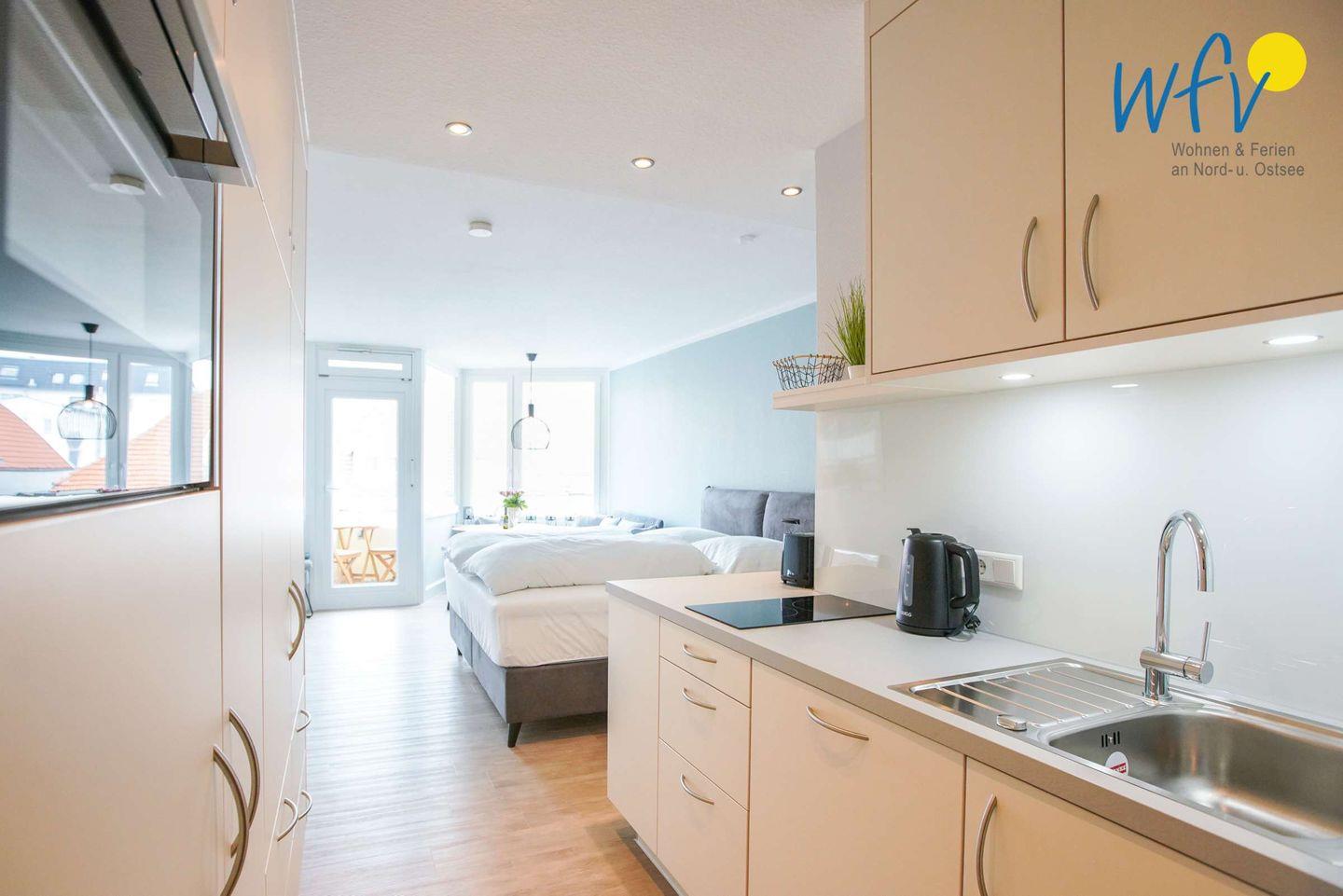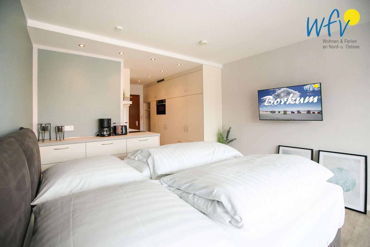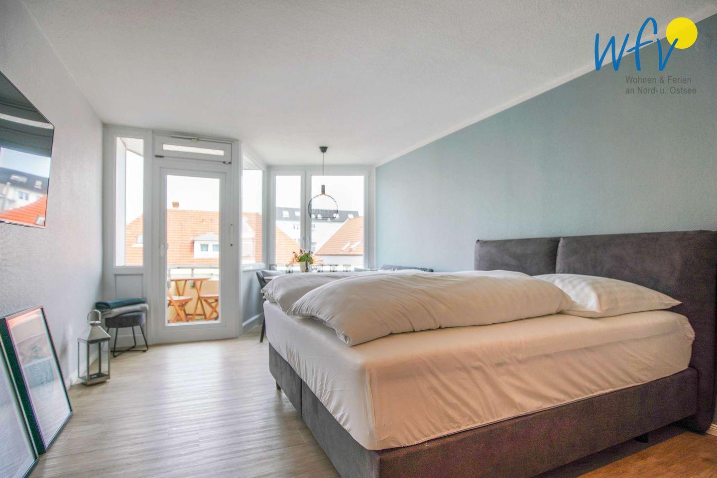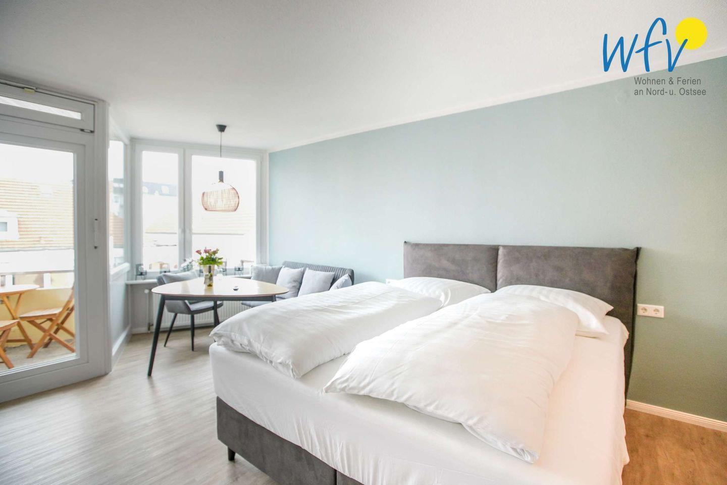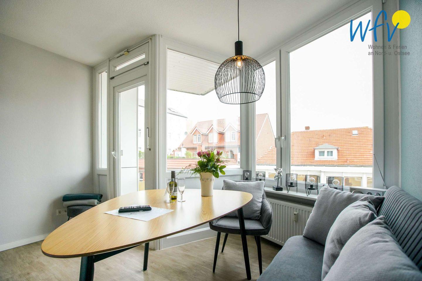 Moderne Ferienwohnung „Inseloase“ mit Balkon und Strandblick auf Borkum, ideal für romantische Tage zu zweit.