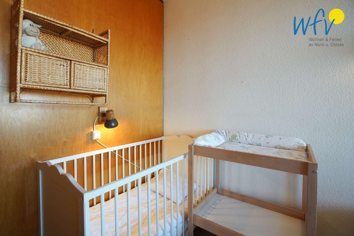Zwei Kinderhochstühle, Spielzeug, eine Wickelauflage und ein Kinderbett gehören zum festen Inventar der familienfreundlichen Ferienwohnung auf Borkum.