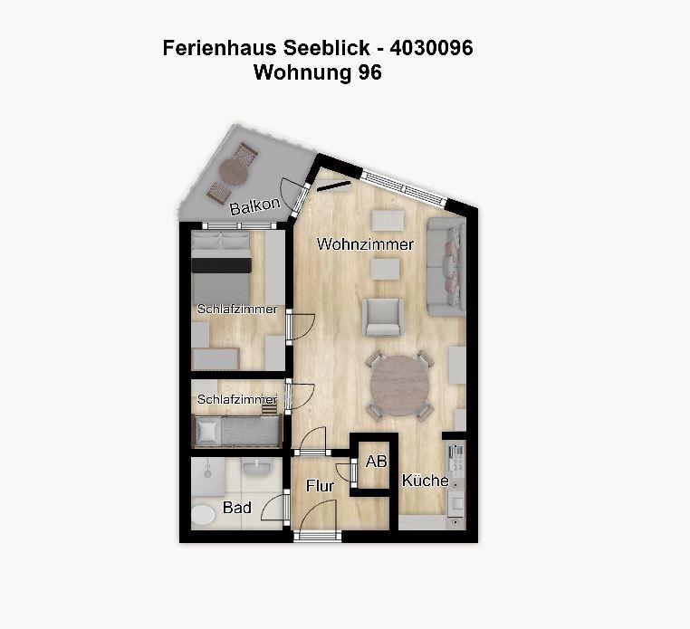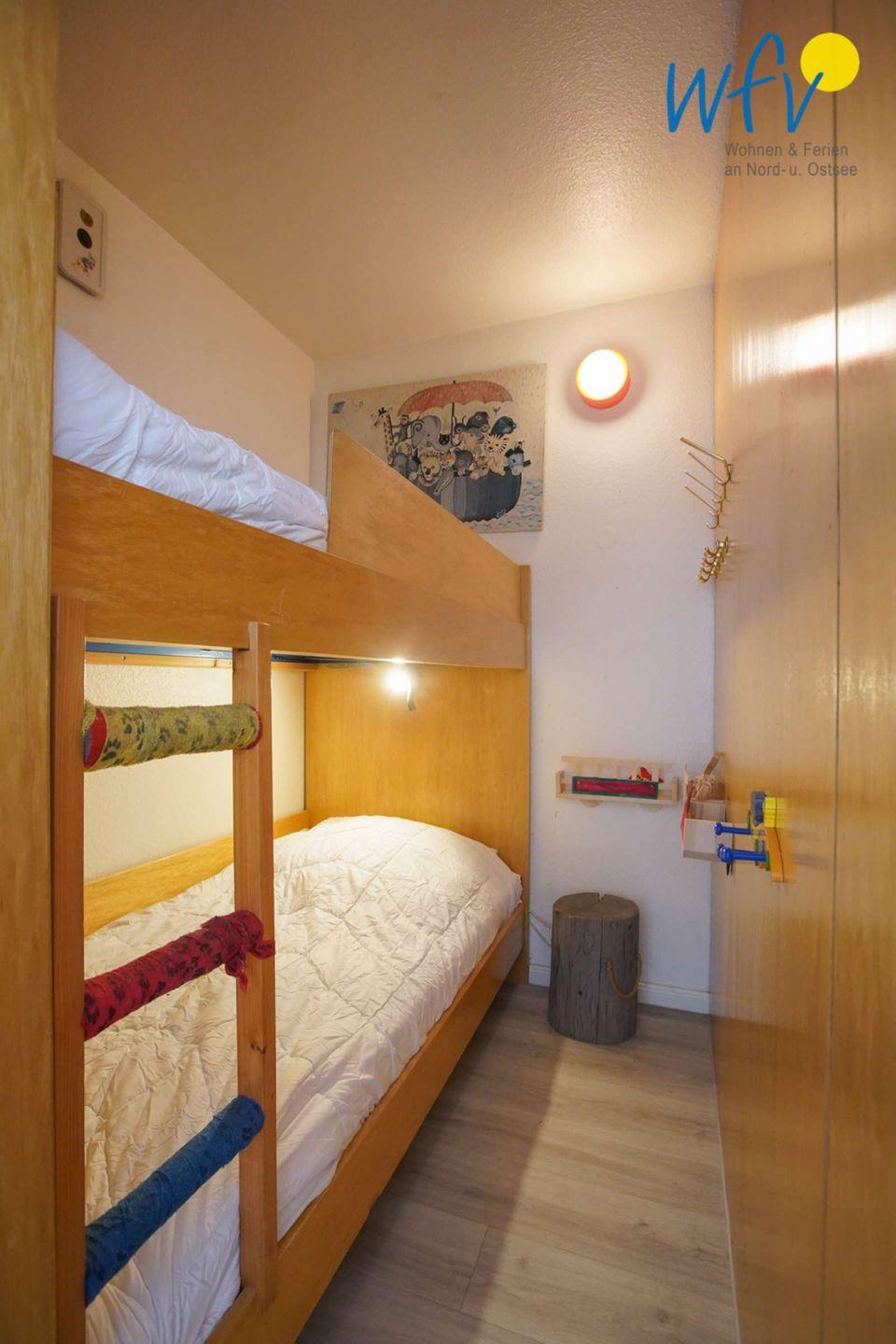 Die Ferienwohnung verfügt über eine sehr vorteilhafte Raumaufteilung: ein großer Wohnraum, eine offene Küche sowie zwei separate Schlafzimmer und ein Duschbad bieten Platz für bis zu vier Personen. Während das eine Schlafzimmer z. B. für die Kinder mit einem Etagenbett (je 0.80 x 1.90) ausgestattet ist, steht im anderen Schlafzimmer neben einem Doppelbett (1.40 x 2.00) noch ein Kinderbett (0.60 x 1.20) für die Kleinsten zur Verfügung.