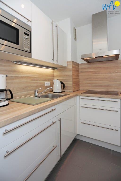 Die moderne Küche ist u.a. mit einem 4-Platten-Ceranherd, einem Kühlschrank mit Gefrierfach, einer Mikrowelle und einer Spülmaschine ausgestattet sowie mit diversen Kleingeräten (Kaffeemaschine, Wasserkocher, Toaster, Eierkocher). So können Sie sich in Ihrem Urlaub auf Borkum bequem selbst verpflegen. Ein großer Holzesstisch lädt zu gemeinsamen Mahlzeiten ein.