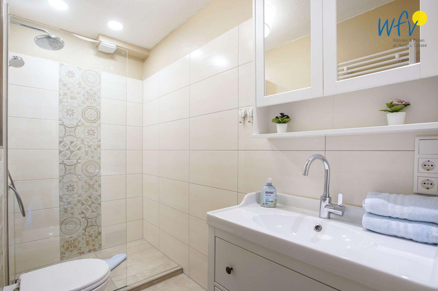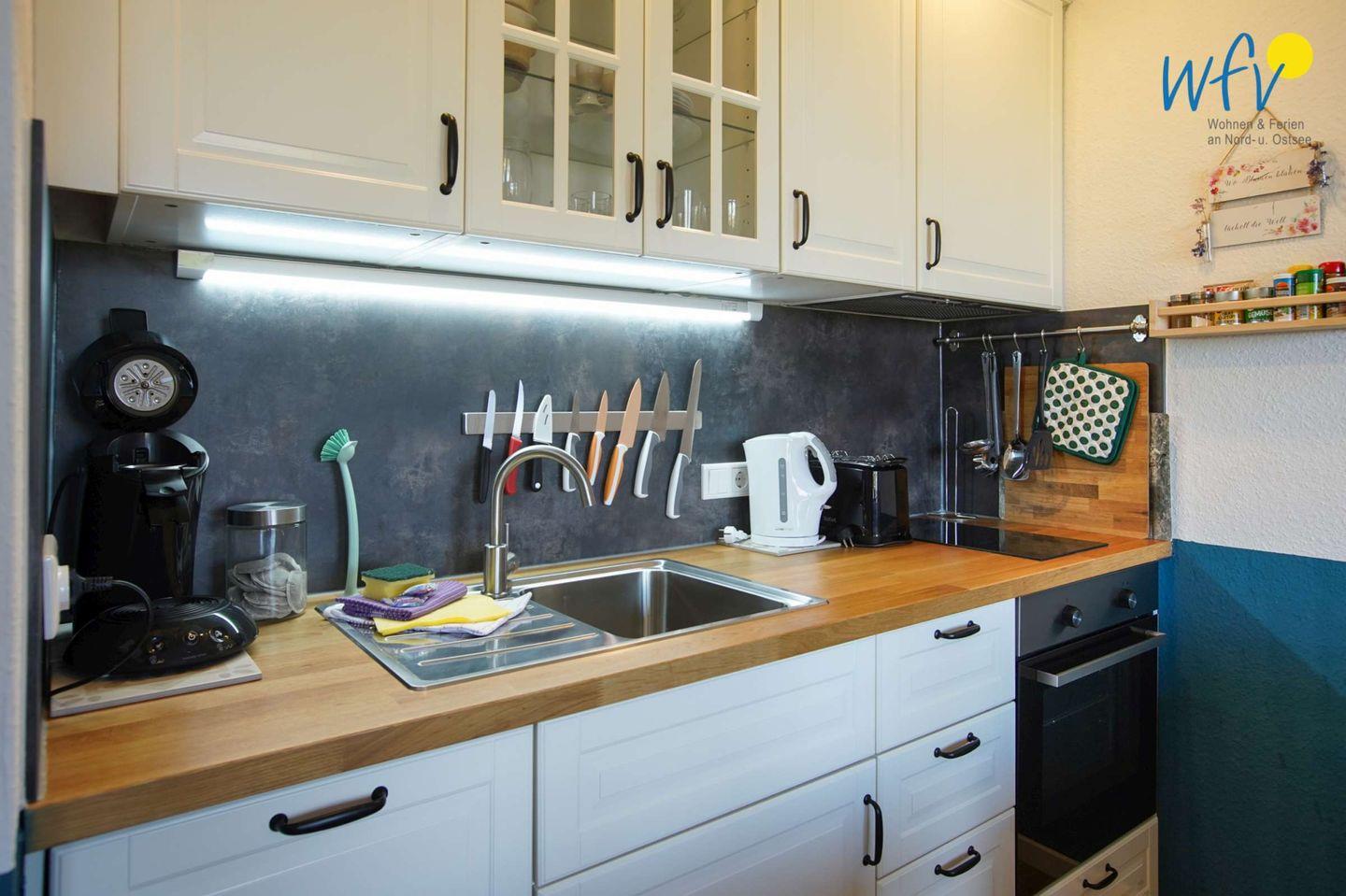 Die Küchenzeile ist u.a. mit einem 2-Platten-Induktionsherd mit Backofen, einem Kühlschrank mit Gefrierfach, einer Mikrowelle und einem Geschirrspüler ausgestattet sowie mit diversen Kleingeräten (Senseo-Kaffeemaschine, Wasserkocher, Toaster, Eierkocher). So können Sie sich in Ihrem Urlaub auf Borkum gut selbst verpflegen. Oder Sie lassen sich kulinarisch verwöhnen: Auf Borkum gibt es viele empfehlenswerte Restaurants, die Ihnen jegliche Köstlichkeiten der Nordseeküche servieren!