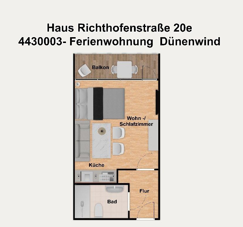 Unsere Ferienwohnung "Dünenwind" mit gemütlichem Wohn- Schlafraum, modernem Duschbad und überdachtem Balkon ist die perfekte Unterkunft, wenn Sie allein verreisen oder die Ferien als Paar bzw. als kleine Familie verbringen wollen.