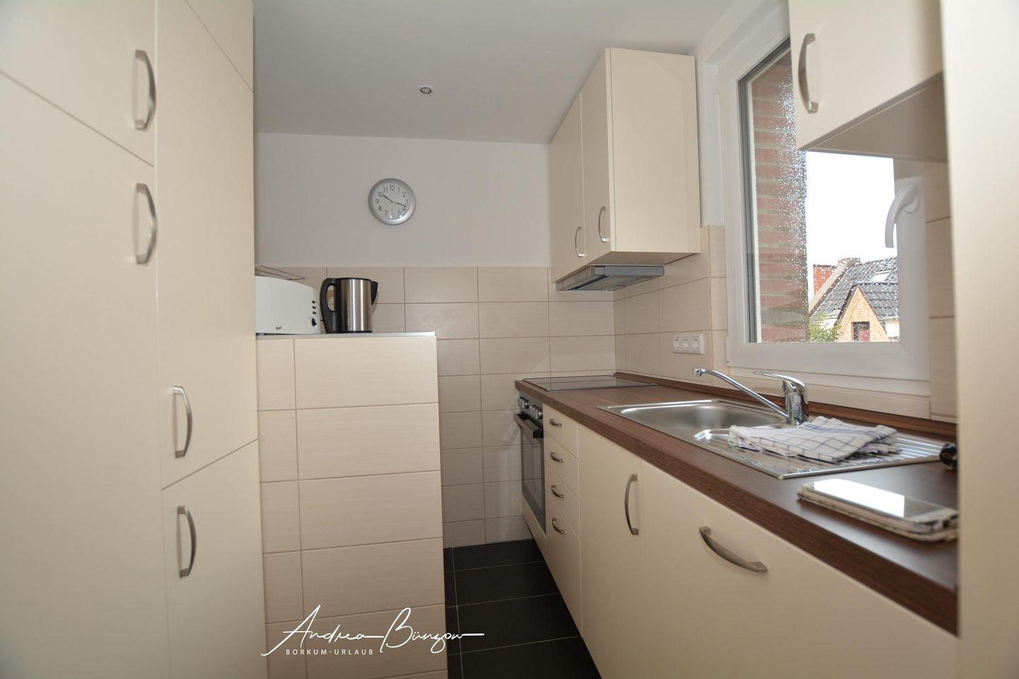 Helle Ferienwohnung auf Borkum mit moderner Küche, zentraler Lage und nur 650 m vom Strand entfernt.