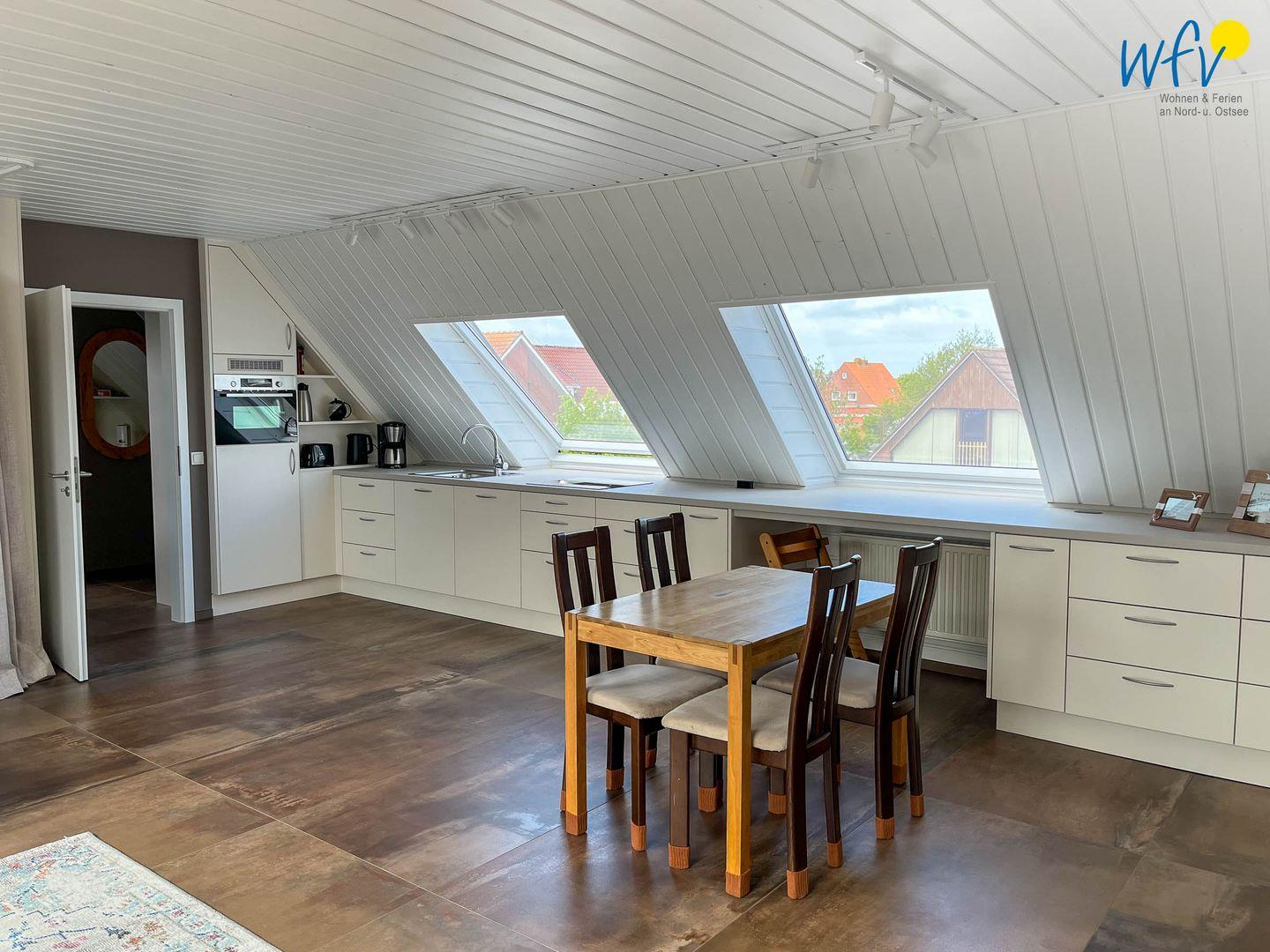 Die hochwertige Einbauküche, ebenfalls vom Insel-Tischler, bietet Ihnen die perfekte Möglichkeit zur Selbstversorgung (Spülmaschine, Kühlschrank, Glaskeramik-Kochfeld mit vier Kochfeldern, Mikrowellen-Grill-Backofen-Gerät sowie diverse Kleingeräte (Kaffeemaschine, Wasserkocher, Toaster).