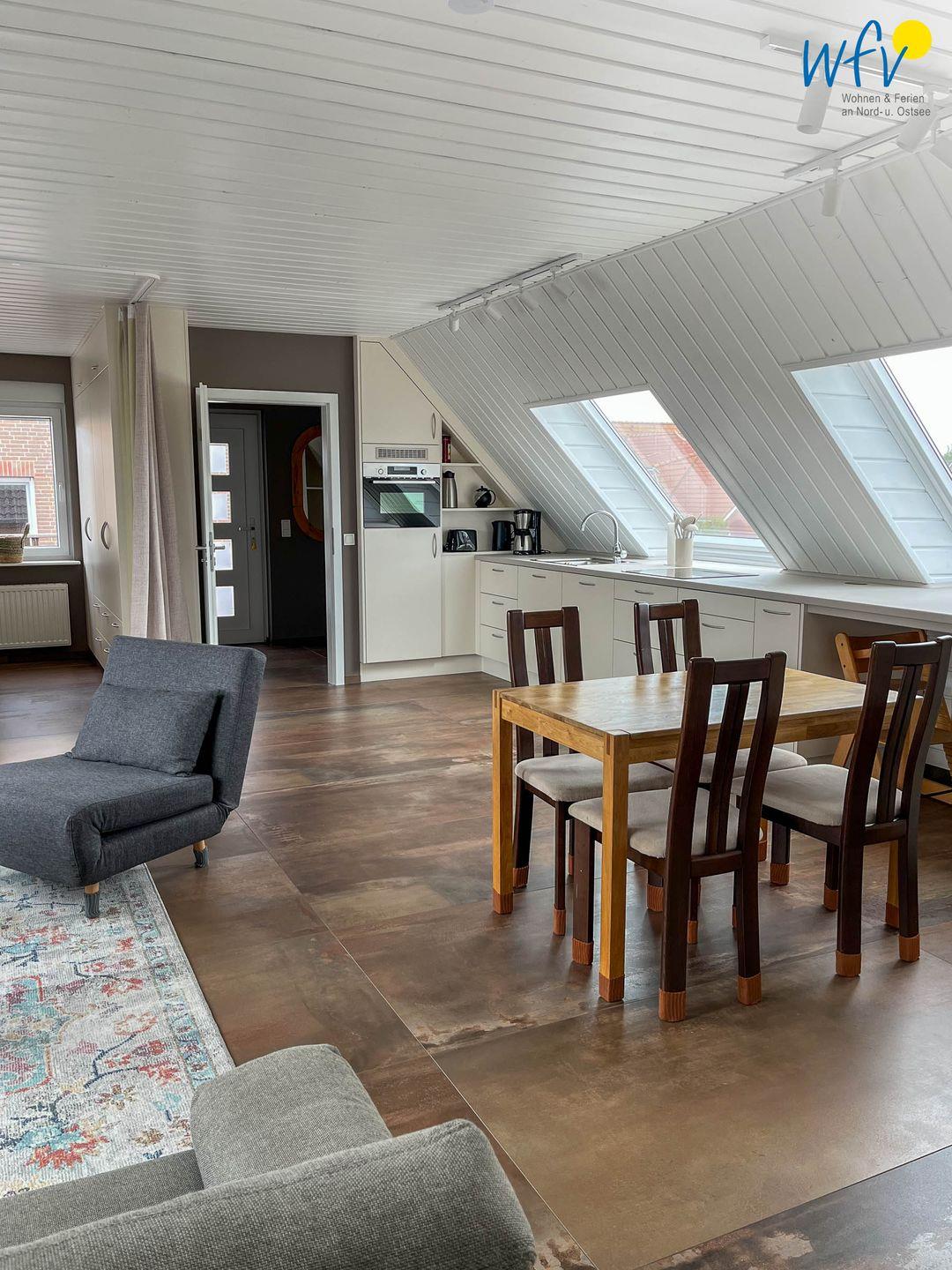 Der mit einer Couch, Sesseln und einem Smart-TV ausgestattete Wohnbereich mit vier großen Dachfenstern und tollem Ausblick lädt zum Relaxen ein. Hier mit der Familie einen guten Film zu schauen oder Spiele am Essplatz zu spielen und dabei die beiden Leuchttürme oder vorbeifahrende Schiffe zu beobachten, sind unvergessliche Urlaubsmomente!