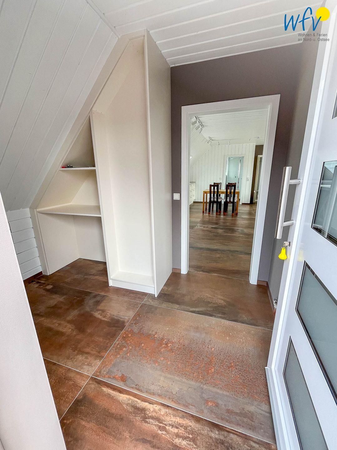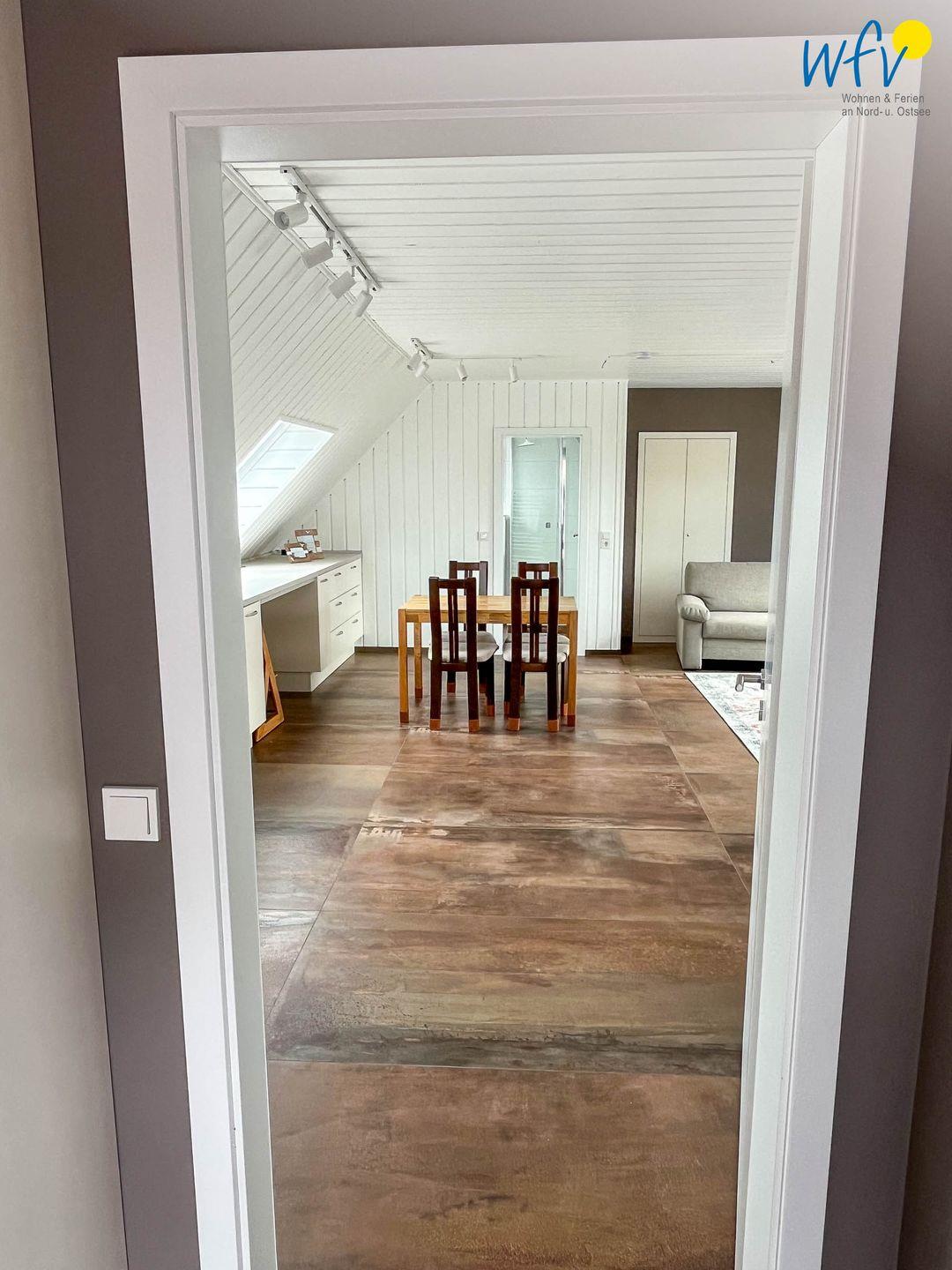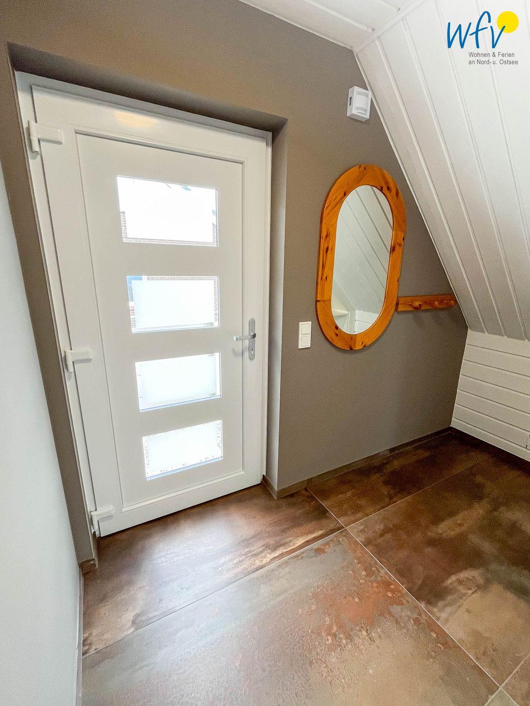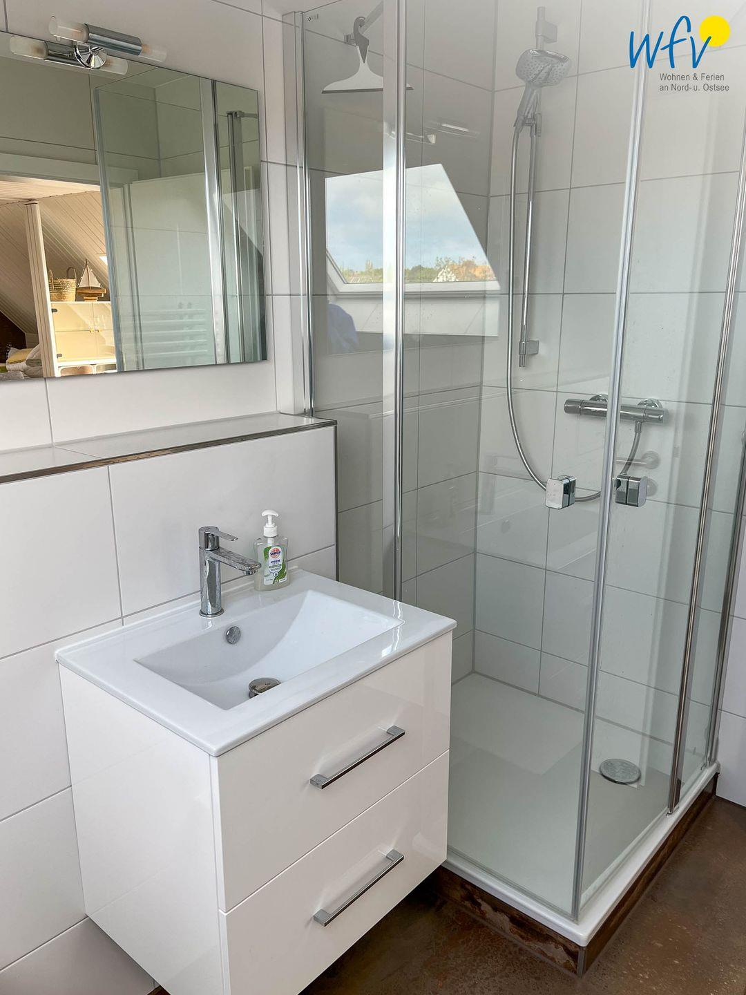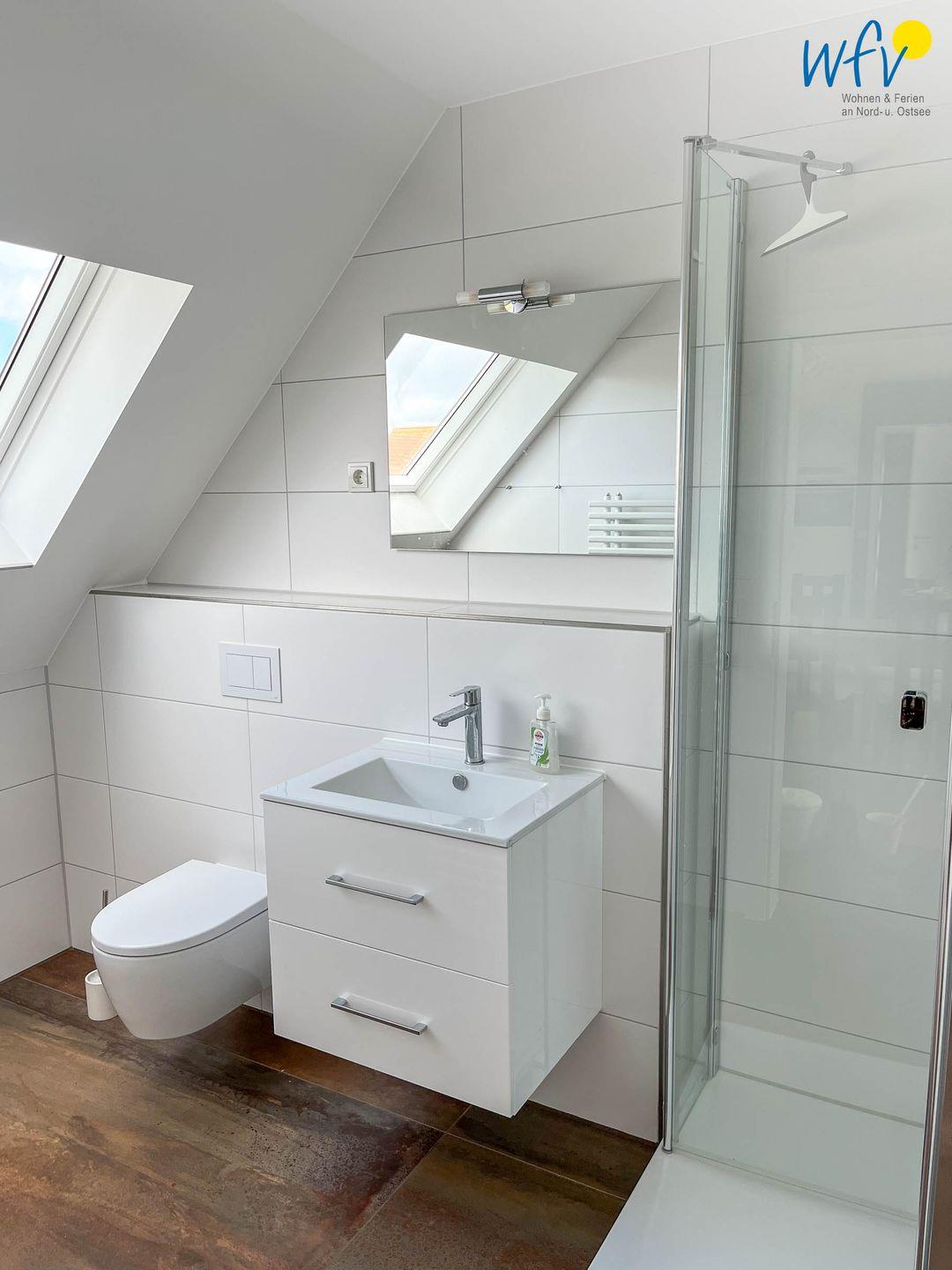 Auch das Bad mit großem Dachfenster ist komplett renoviert. Im Flur haben Sie eine Garderobe mit ausreichend Platz für Ihre Strandsachen.