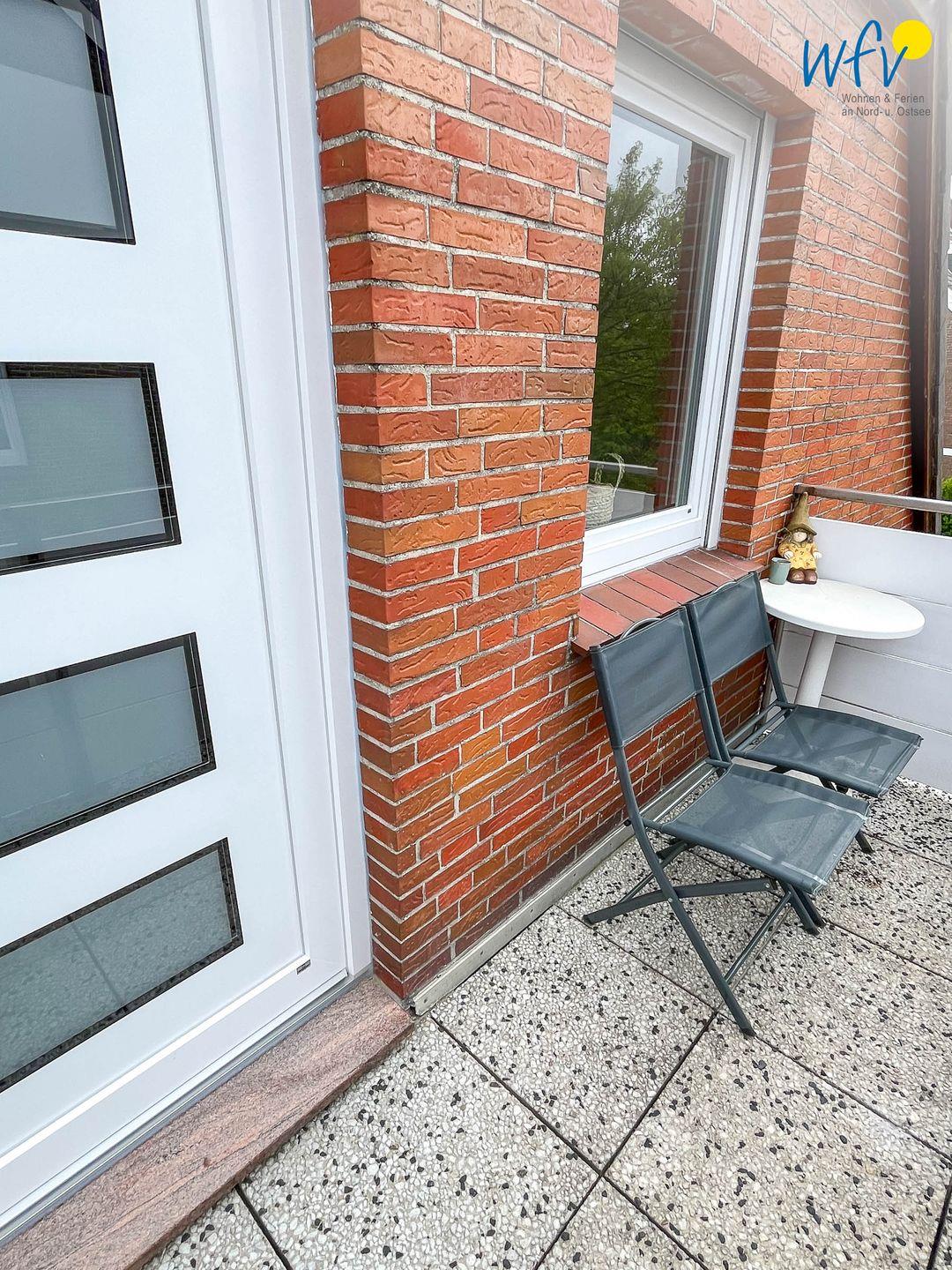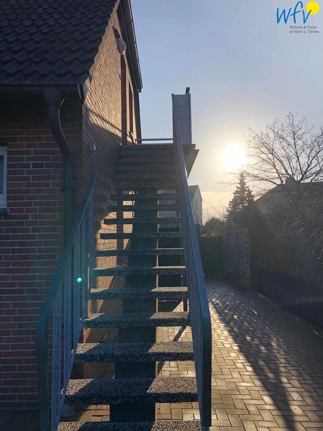 Die sehr helle Ferienwohnung befindet sich im Dachgeschoss und ist über eine Außentreppe erreichbar. Sie hat einen eignen Eingang und einen kleinen Balkon mit zwei Gartenstühlen und einem kleinen Tisch. Unter dem Balkon befinden sich für Sie vier Fahrradständer und ein PKW-Parkplatz direkt vor dem Haus.