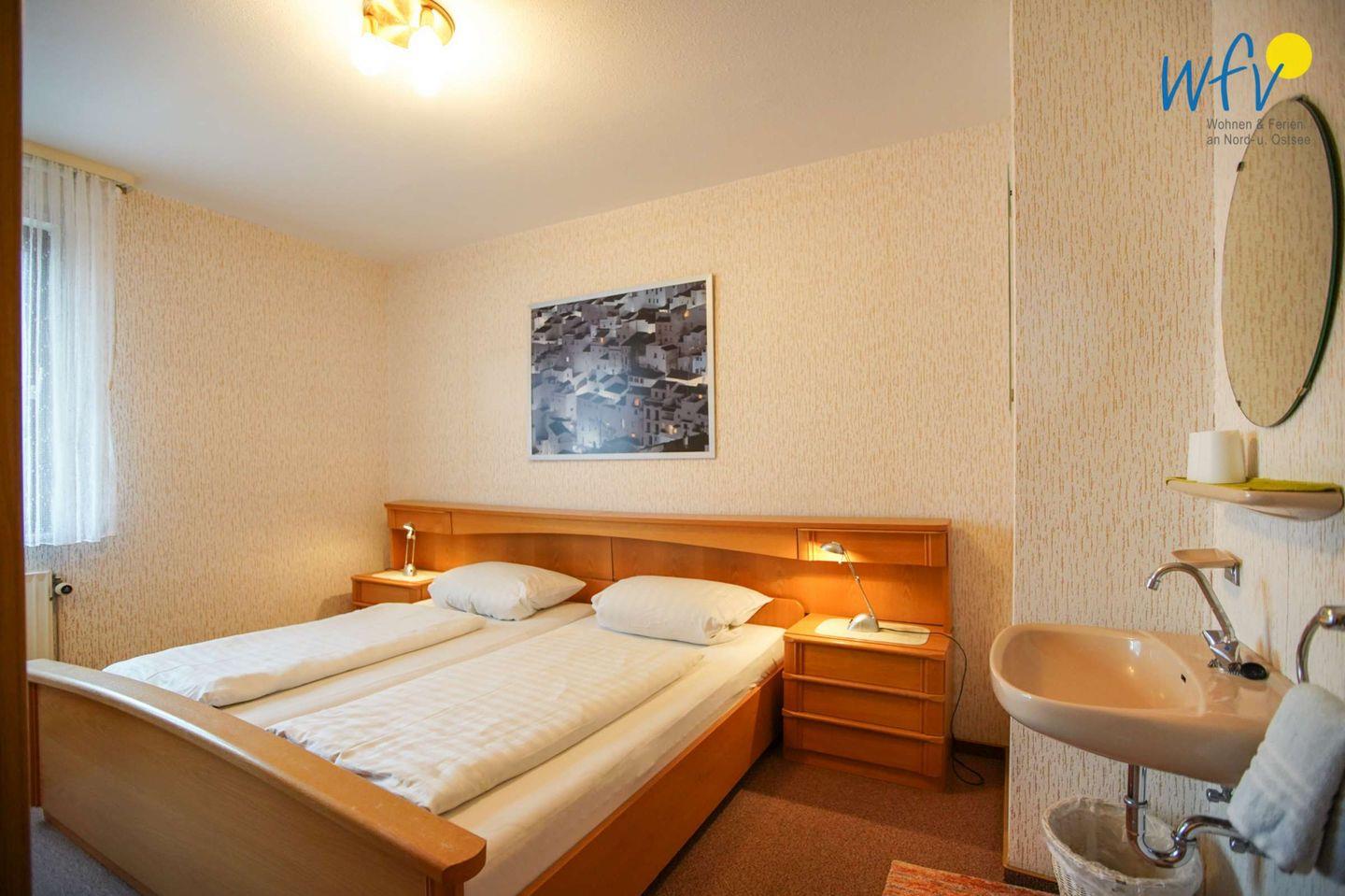 Das separate Schlafzimmer der Ferienwohnung "Bahnhofspark" ist mit einem Doppelbett (180 x 200 cm) und einem großen Kleiderschrank eingerichtet. Zudem befindet sich im Raum ein Waschbecken. Im Kinderzimmer stehen zwei Einzelbetten (80 x 200 cm). Die Bettdecken/Kissen sind jeweils mit Synthetik/Federn gefüllt.
