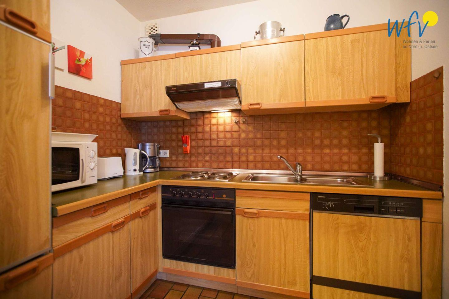 Eine bequeme Selbstverpflegung in Ihrem Urlaub auf Borkum bietet Ihnen die komplett ausgestattete separate Küche - u.a. mit Herd, Backofen, Mikrowelle und Spülmaschine.