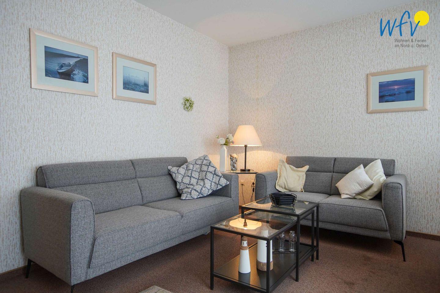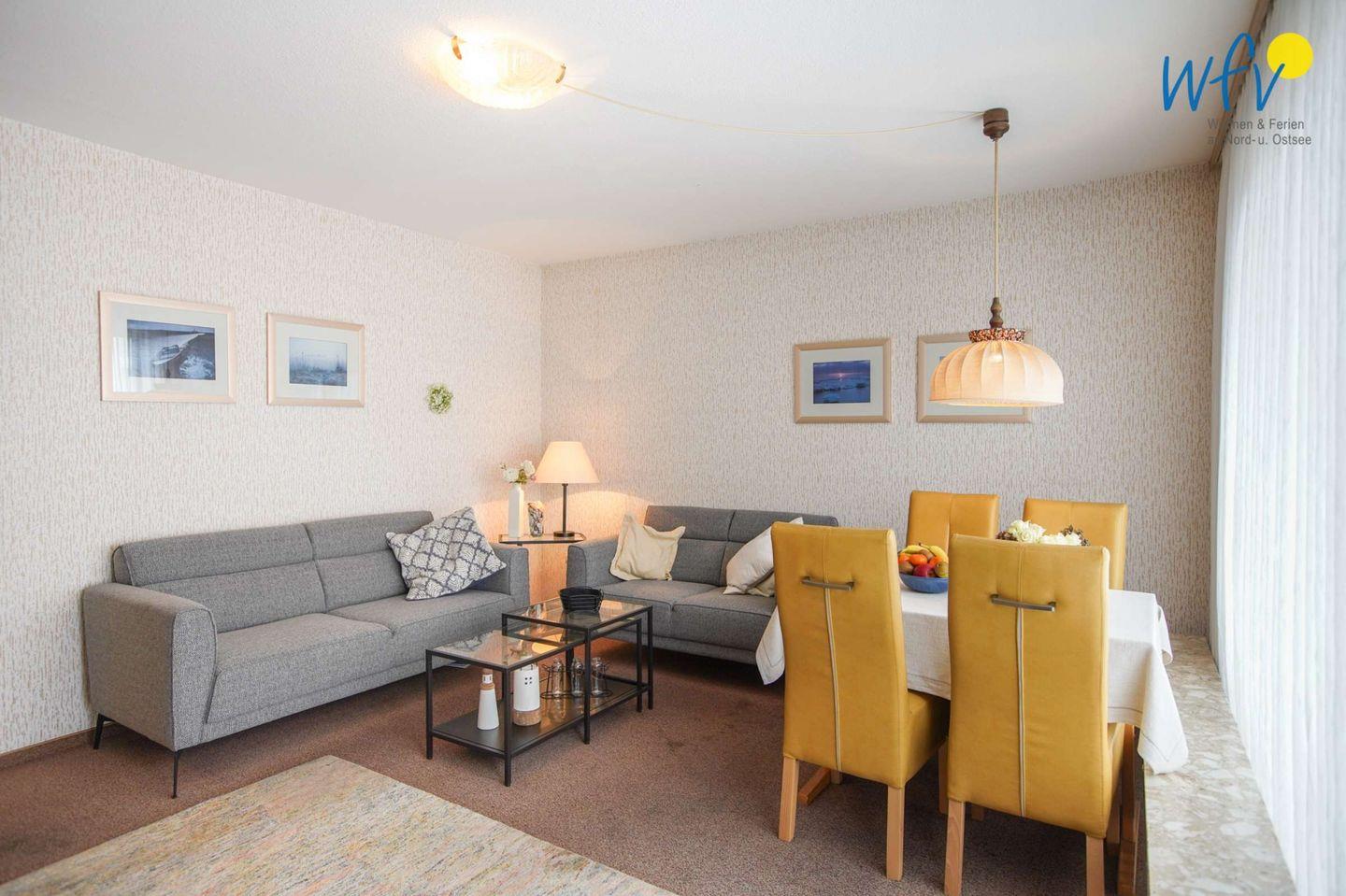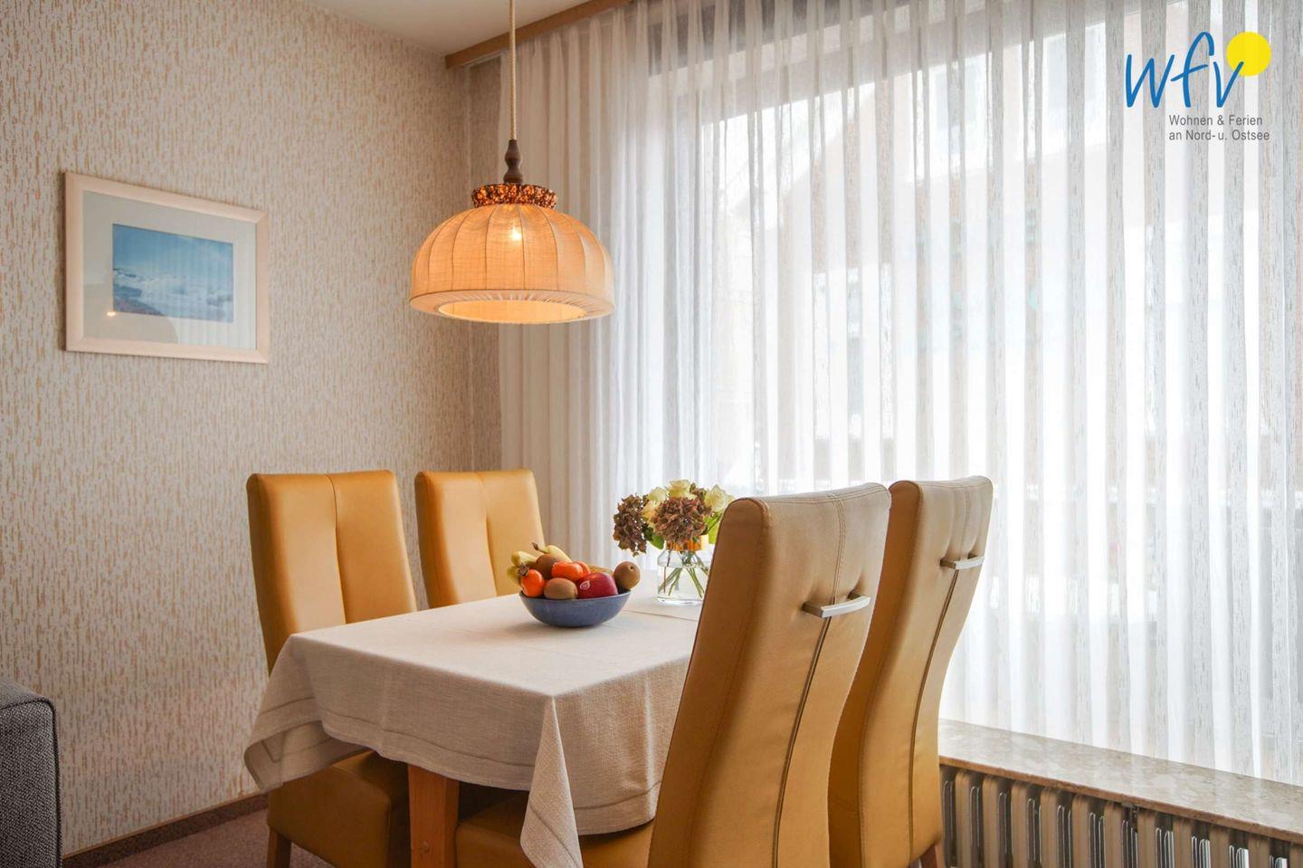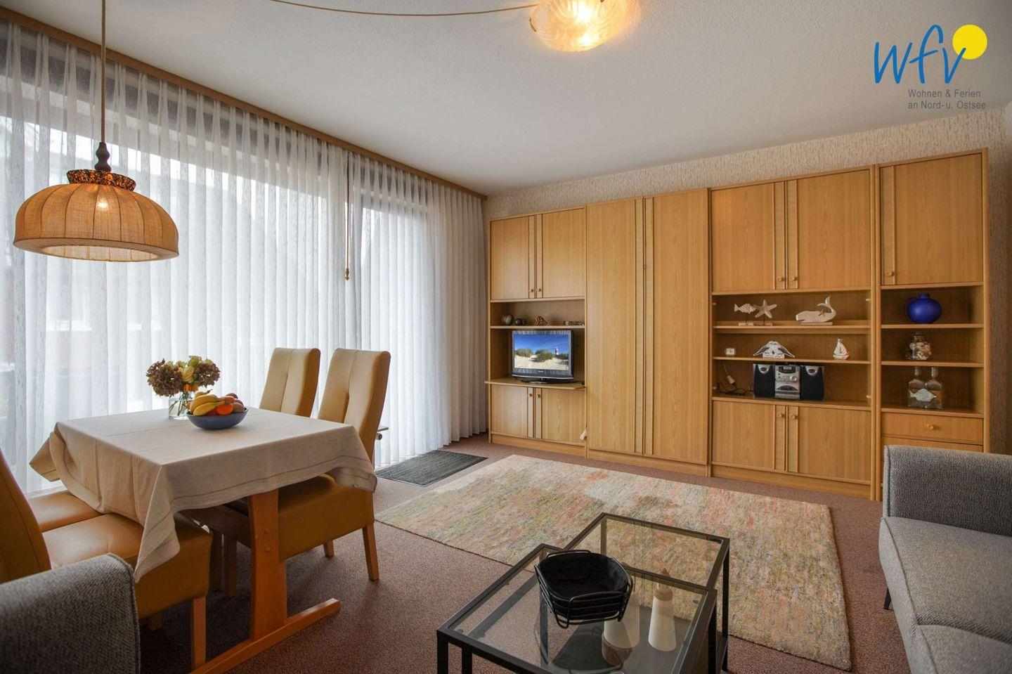 Ob nach dem Strandtag oder der Fahrradtour - in dem gemütlichen Wohnraum mit bequemer Couchecke, TV (32 Zoll) und Radio können Sie ausgiebig relaxen. Für gemeinsame Mahlzeiten ist ein schöner Essplatz am Fenster vorhanden.