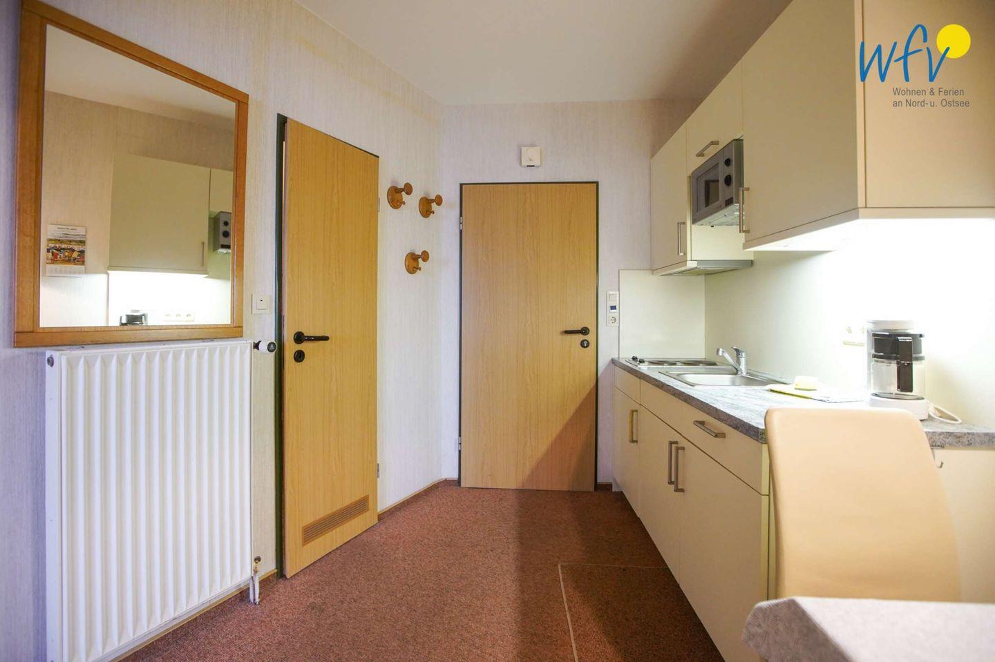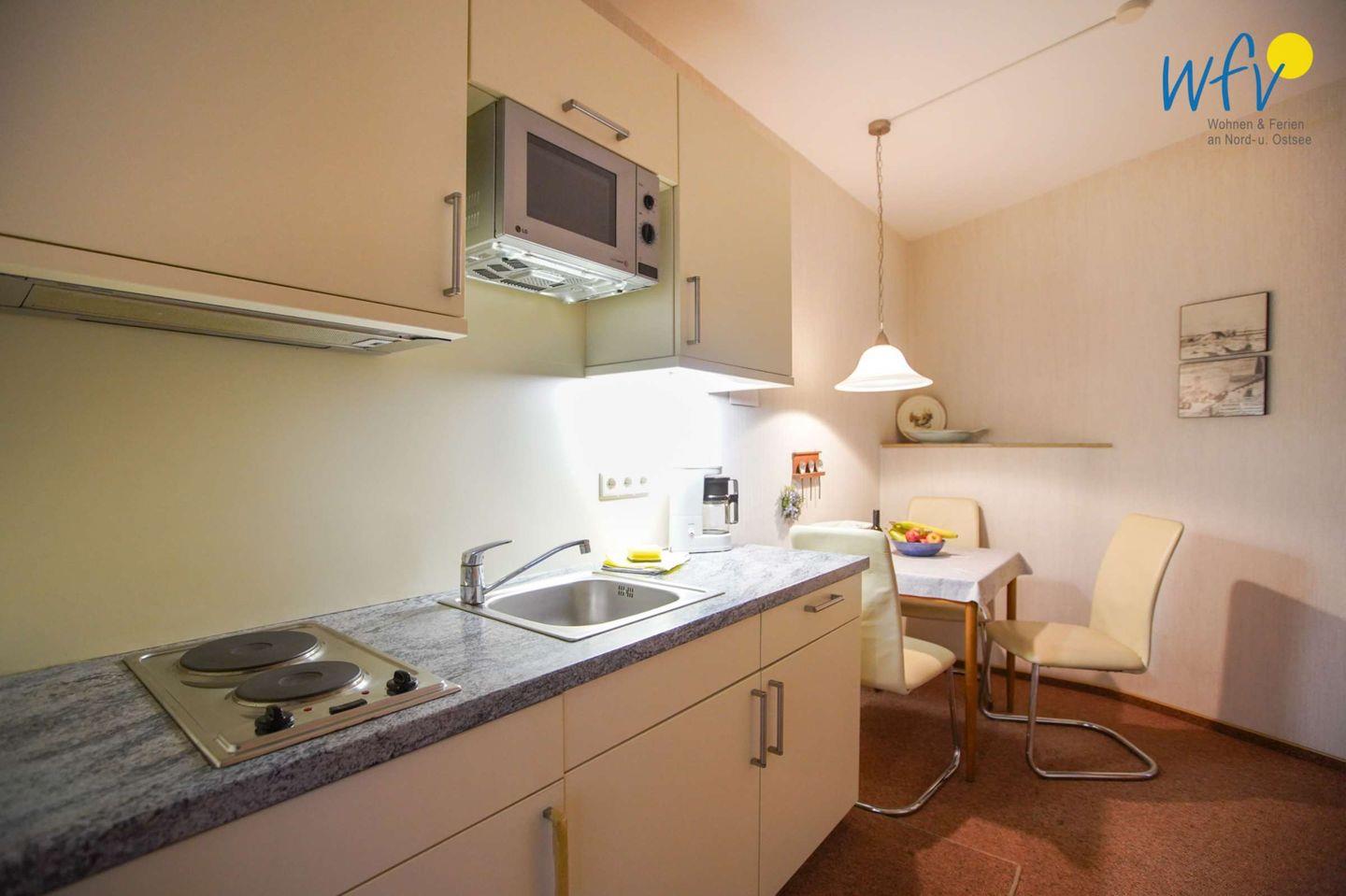 Für eine bequeme Selbstverpflegung in Ihrem Urlaub auf Borkum verfügt die Ferienwohnung "Lütje Park" über eine kleine separate Küche - u.a. mit 2-Platten-Herd, Kühlschrank und Mikrowelle. Gemeinsame Mahlzeiten können Sie am Essplatz einnehmen.