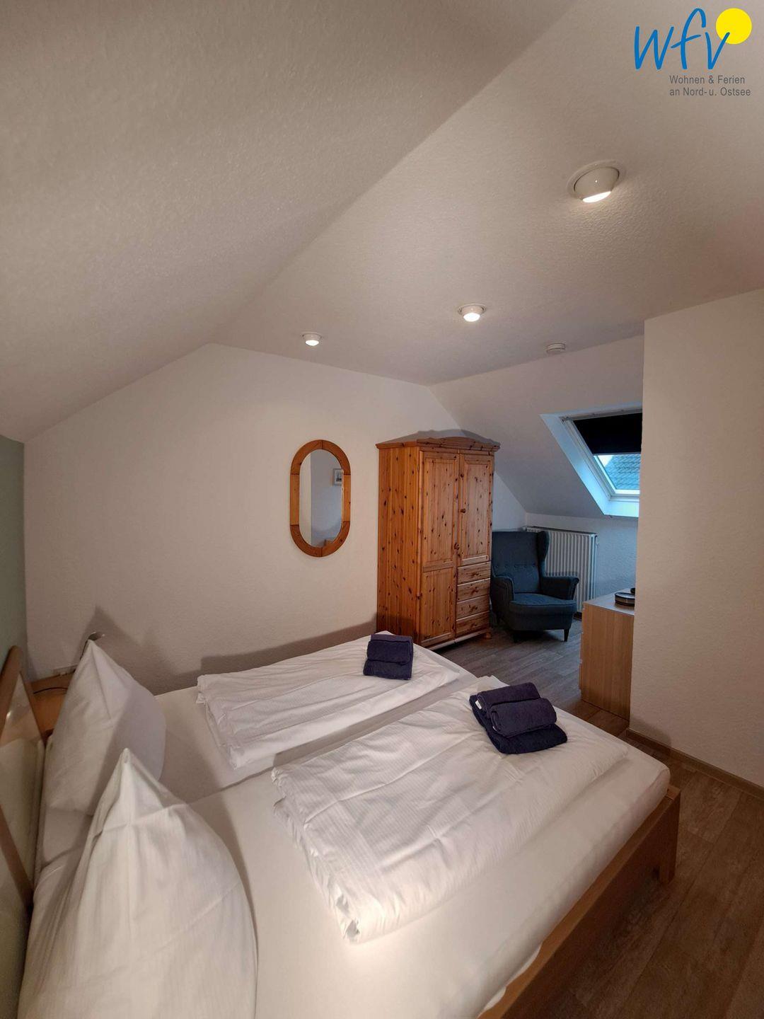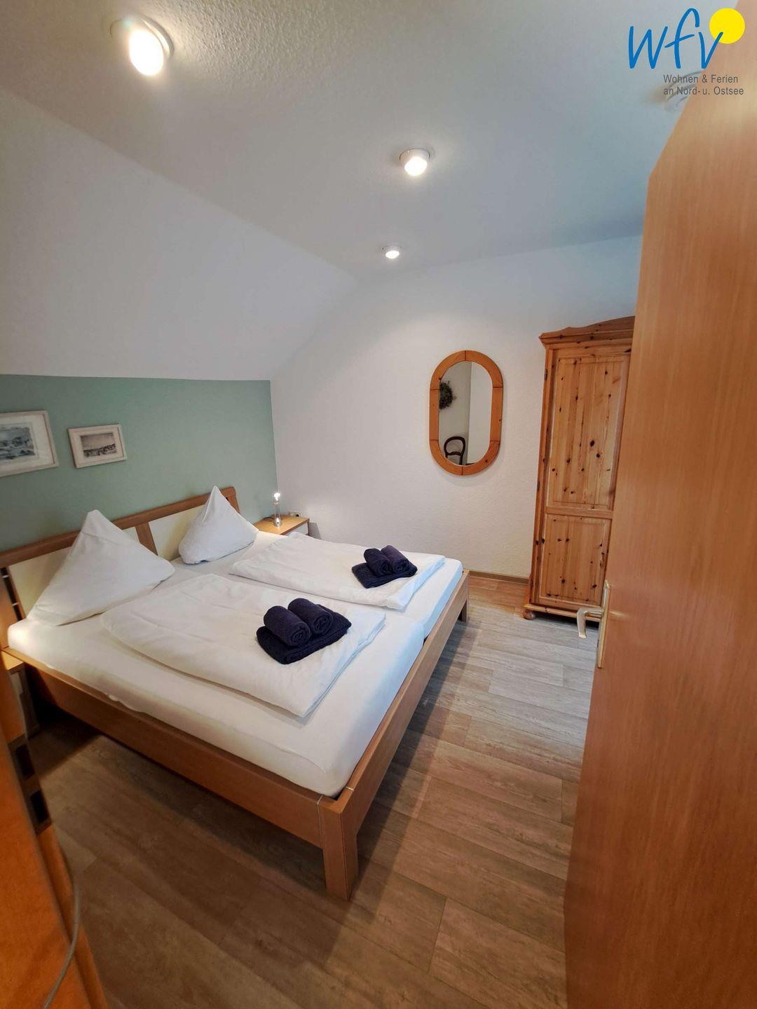 Zwei separate Schlafzimmer bieten angenehme Aufteilungsmöglichkeiten. Beide Räume sind mit einem bequemen Doppelbett ausgestattet (180 x 200 cm). Kissen und Bettdecken sind mit Synthetik/Federn gefüllt. Eines der beiden Schlafzimmer ist auf der gleichen Etage, jedoch nur über eine Flur-/ Verbindungstreppe zu erreichen.