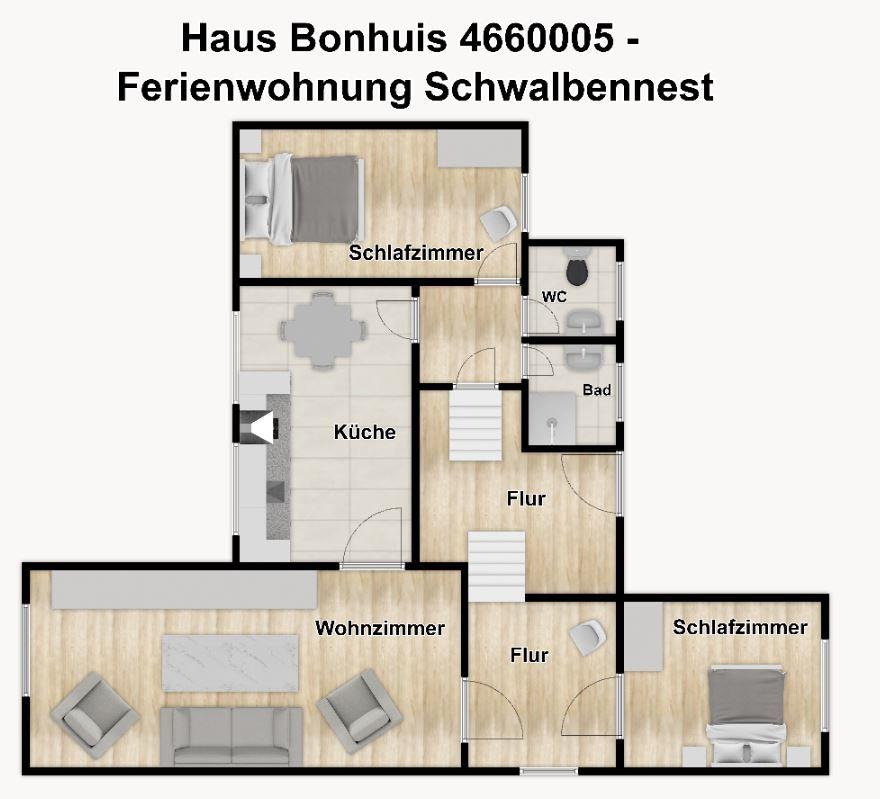 Gemütliche Ferienwohnung 'Schwalbennest' auf Borkum mit zwei Schlafzimmern, separater Küche und WLAN für erholsame Urlaubstage.