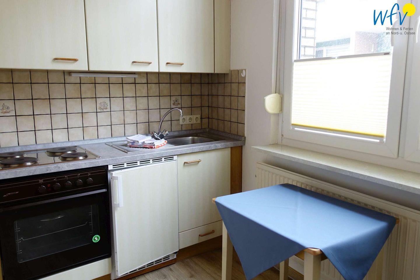 Der Esstisch am Fenster lädt zum ausgiebigen Ferienfrühstück ein. Frischen Kaffee und warme Brötchen können Sie bequem in der separaten Küche zubereiten. Und schon bekommen Sie wunderbare Ideen für den Urlaubstag an der Nordsee - zum Beispiel eine Fahrradtour, ein Strandspaziergang oder ein Badetag...