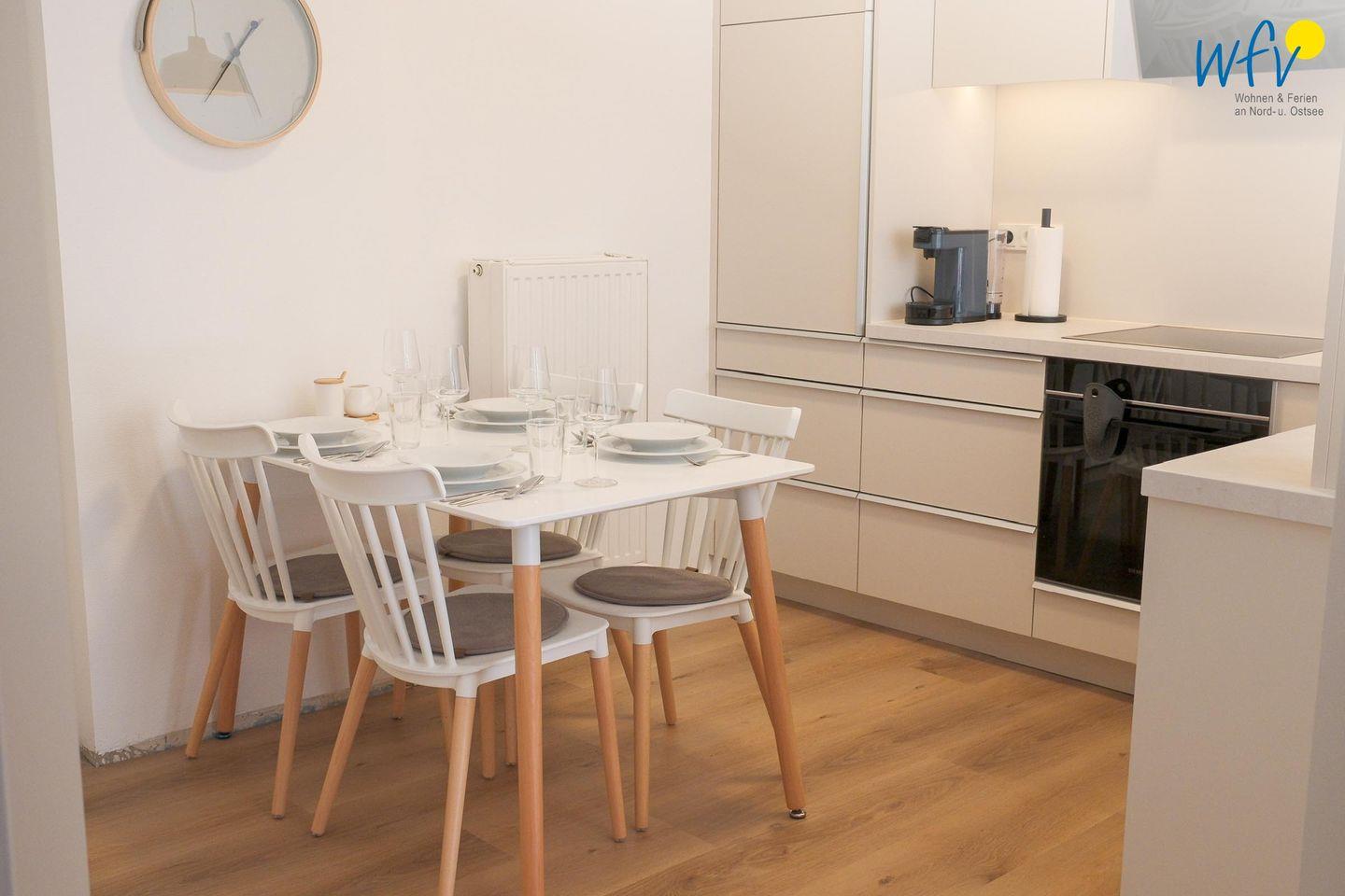 Der Esstisch am Fenster lädt zum ausgiebigen Ferienfrühstück ein. Frischen Kaffee und warme Brötchen können Sie bequem in der separaten Küche zubereiten. Und schon bekommen Sie wunderbare Ideen für den Urlaubstag an der Nordsee - zum Beispiel eine Fahrradtour, ein Strandspaziergang oder ein Badetag...